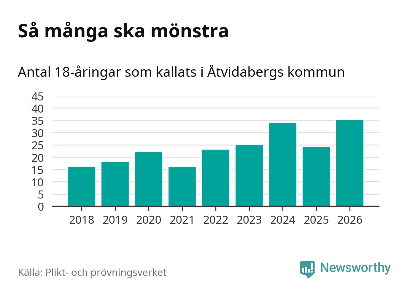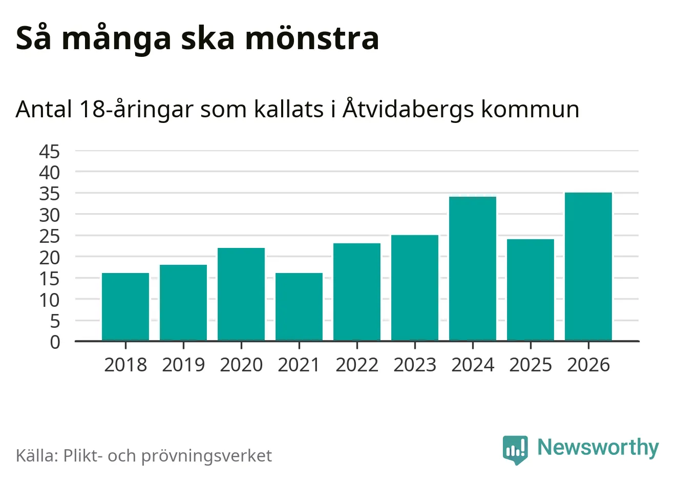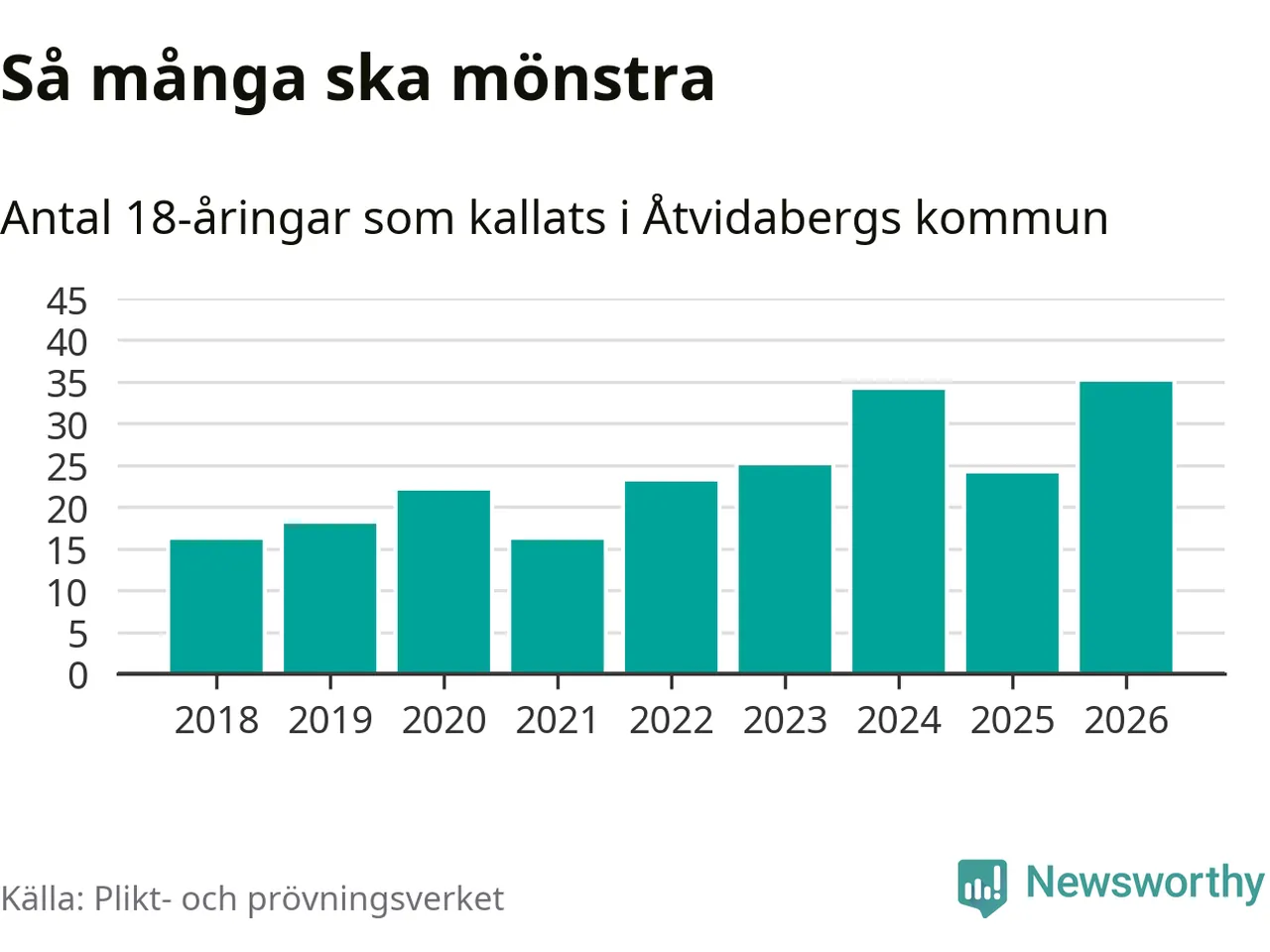 35 personer är det högsta antalet kallade i Åtvidaberg sedan 2018, som är första året med statistik på kommunnivå (värnplikten återinfördes 2017), och elva mönstrande fler än 2025. Totalt från Östergötlands län kallas 1 318 personer i år.