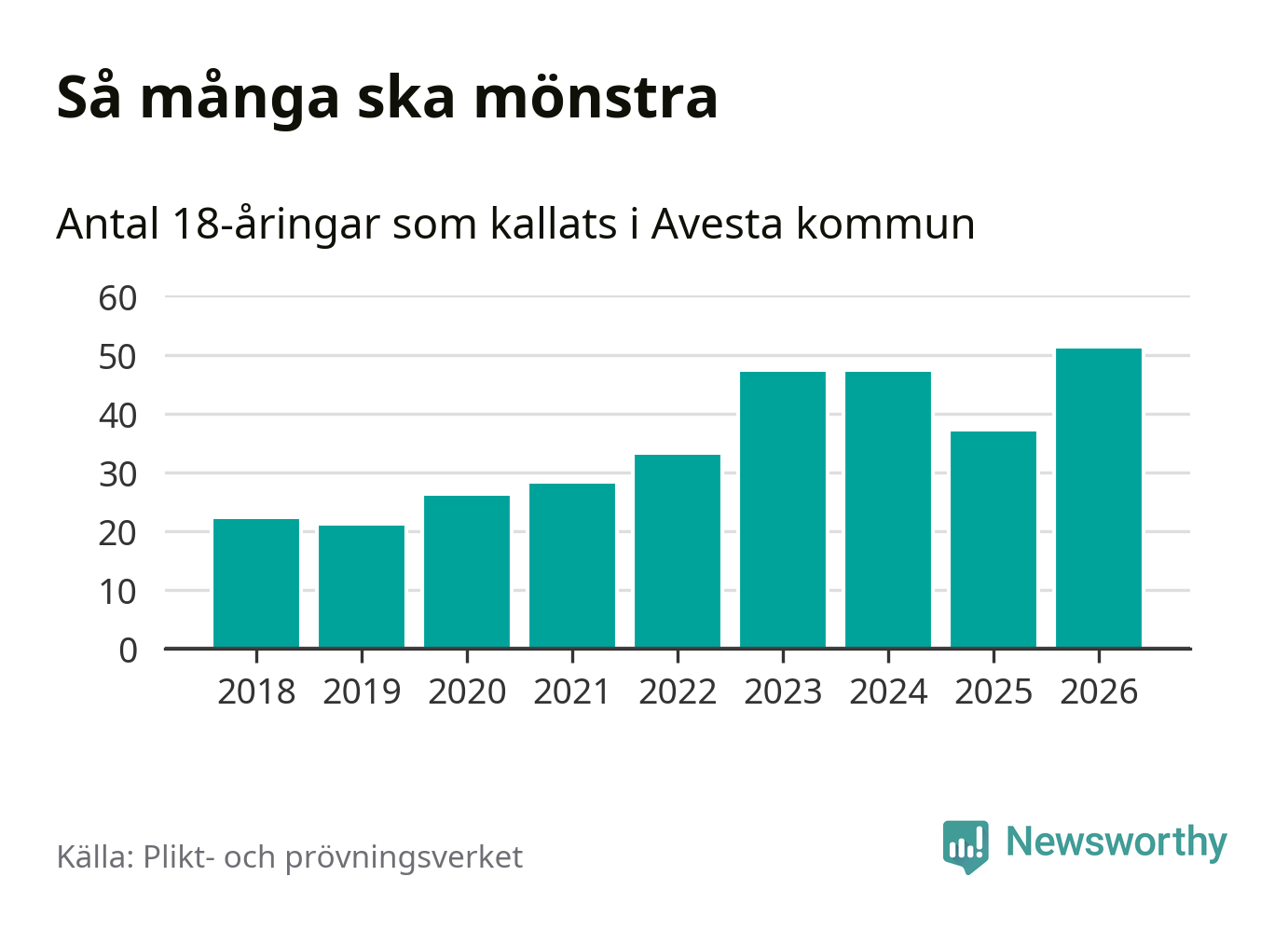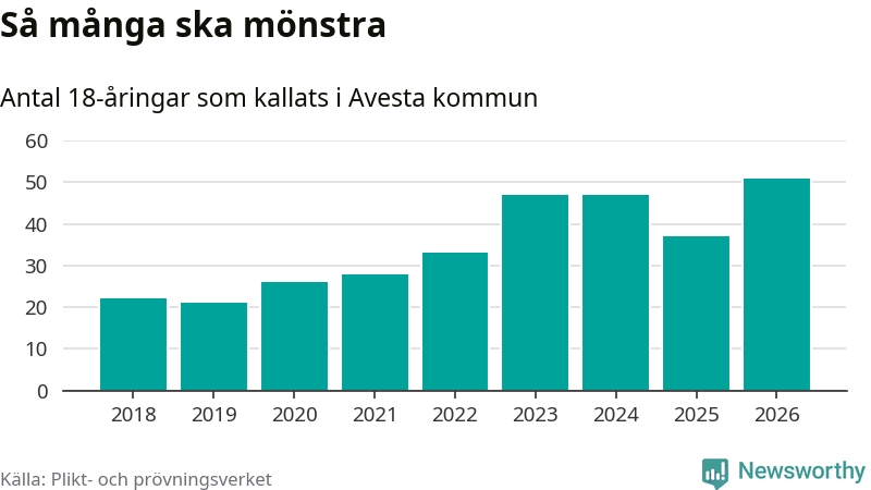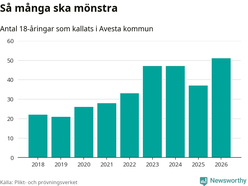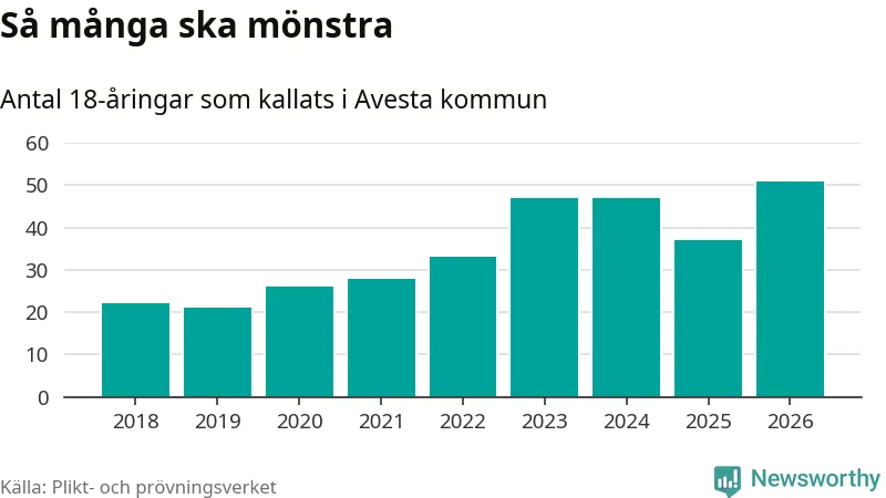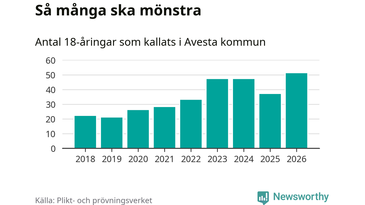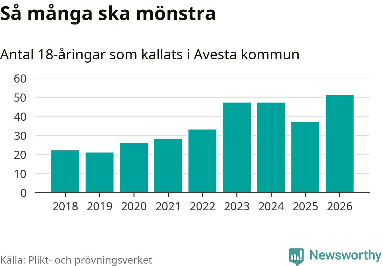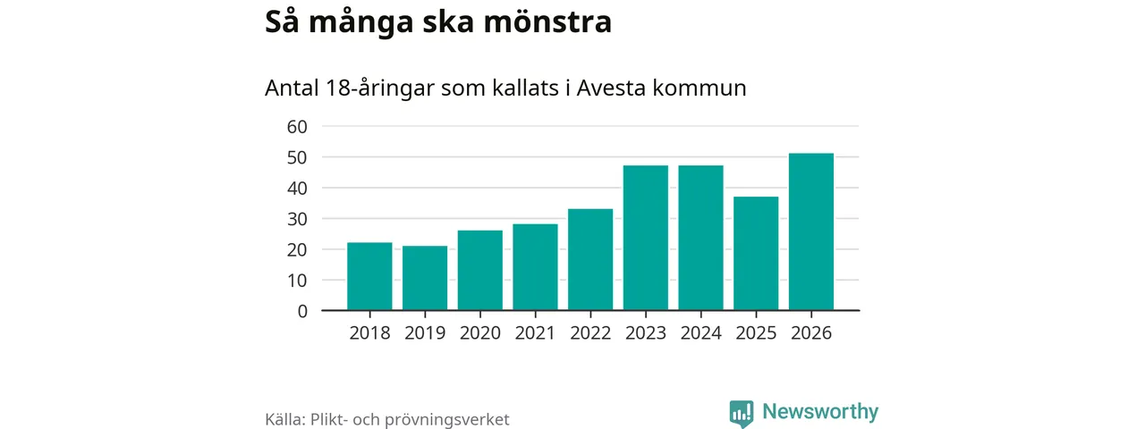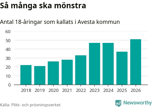 51 personer är det högsta antalet kallade i Avesta sedan 2018, som är första året med statistik på kommunnivå (värnplikten återinfördes 2017), och 14 mönstrande fler än 2025. Totalt från Dalarnas län kallas 741 personer i år.