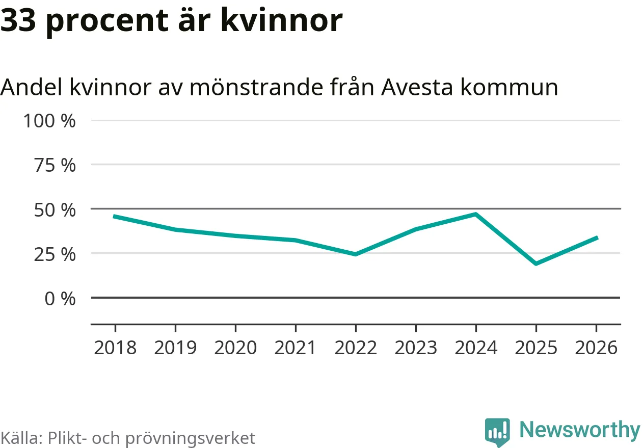 Av de som skrivits in till någon av Försvarmaktens grundutbildningar förra året, 2025, kommer 15 (nio män och sex kvinnor) från Avesta. 14 av dessa antogs efter att ha kallats till mönstring.