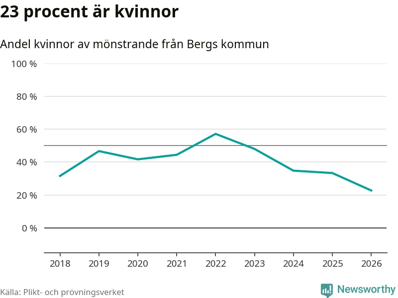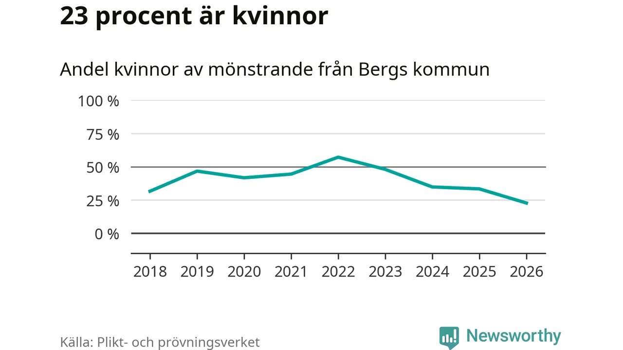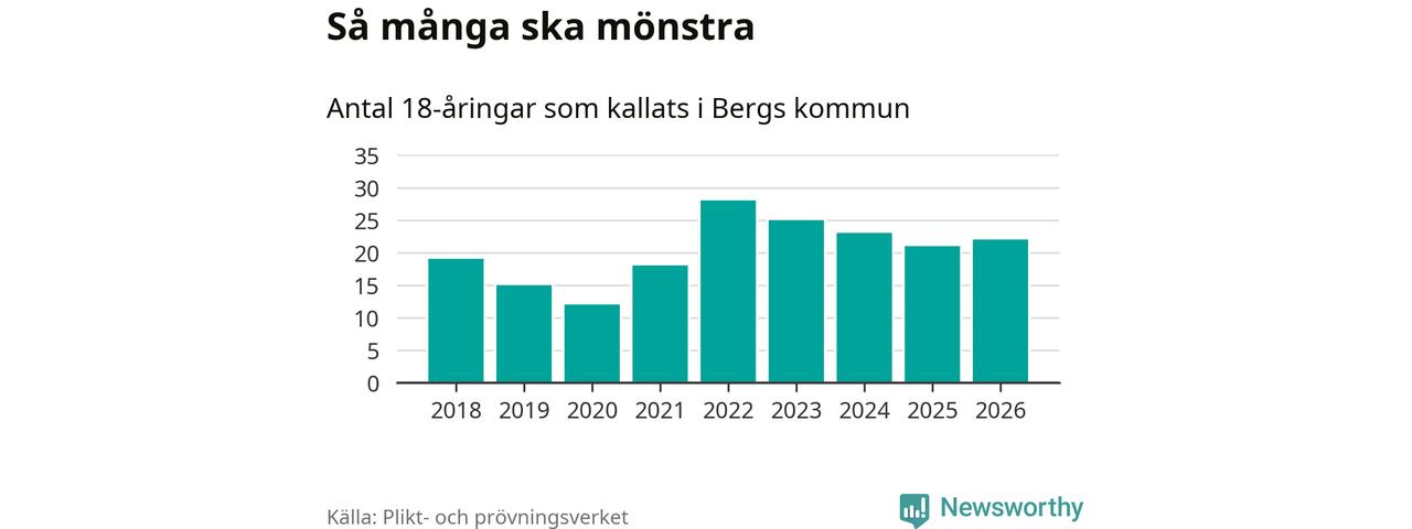 Nu kallas omkring 30 000 svenskar födda 2008 till mönstring. Och 22 av dem kommer från Berg, enligt ny statistik från Plikt- och prövningsverket. Det innebär att var tredje invånare i åldersgruppen i kommunen kallas till mönstring. Det är en lägre andel än i Jämtland totalt. I riket som helhet kallas nästan var fjärde person i årskullen.