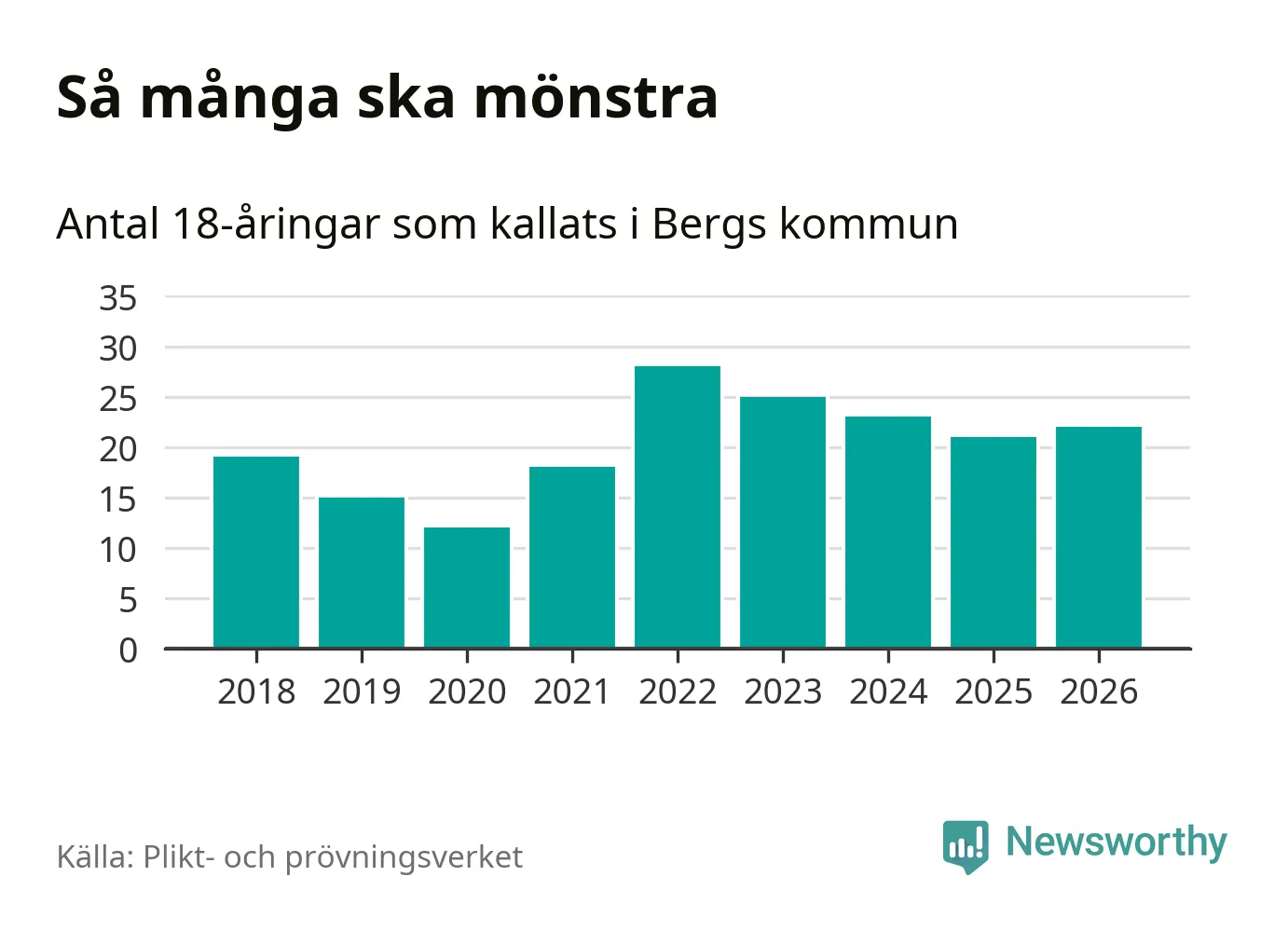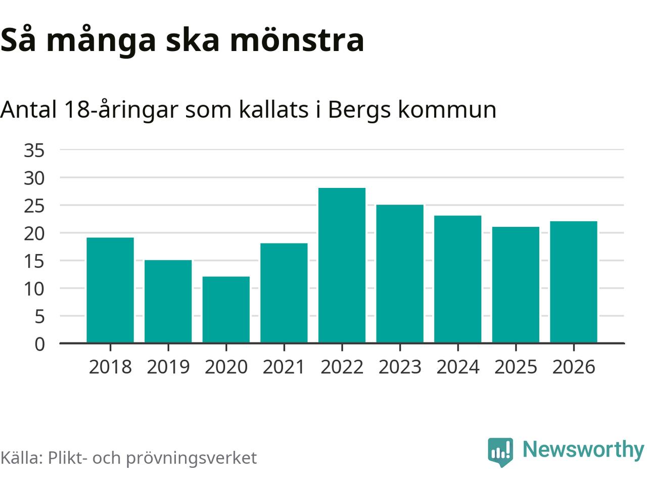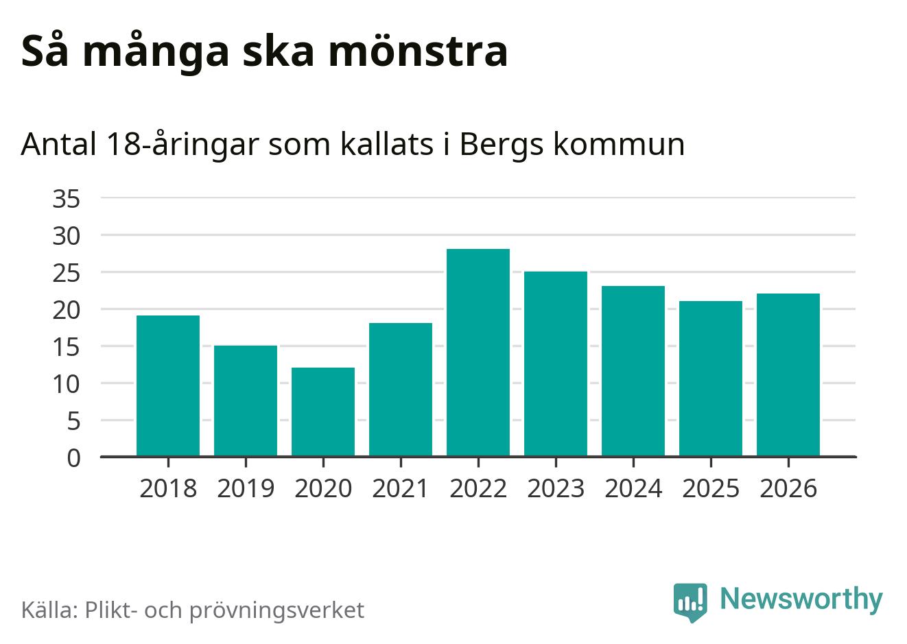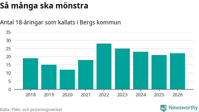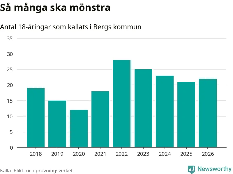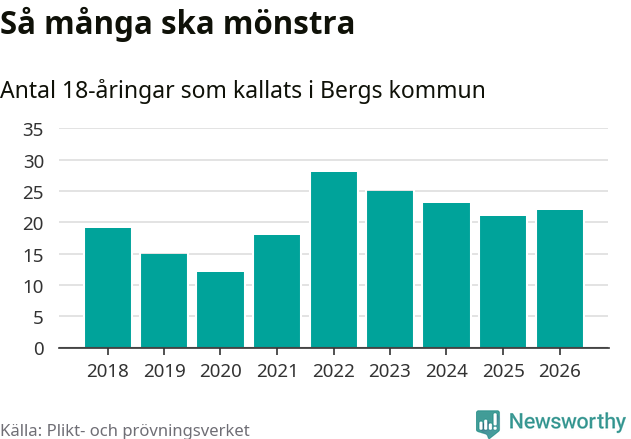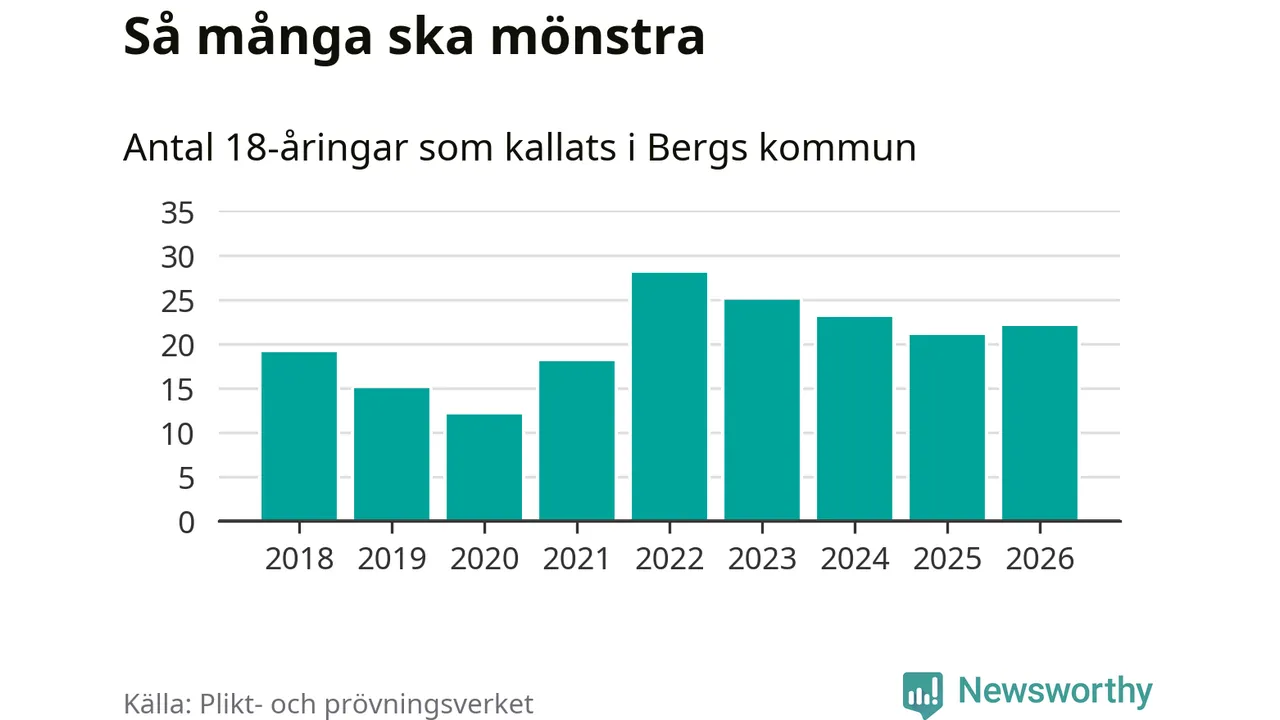 22 personer är en fler än 2025. Som mest har 28 personer från en årskull kommunen mönstrat (2022). Totalt från Jämtlands län kallas 539 personer i år.