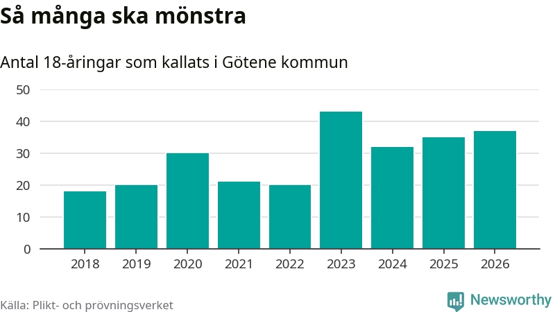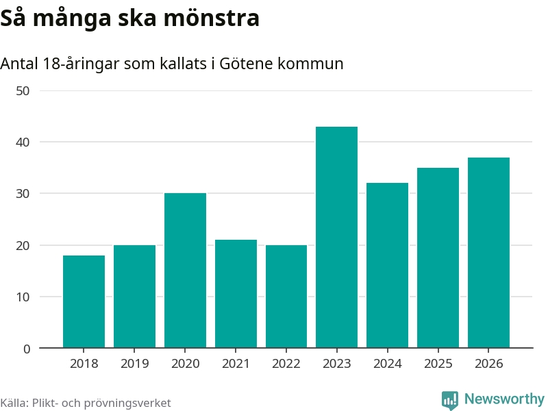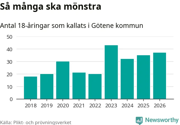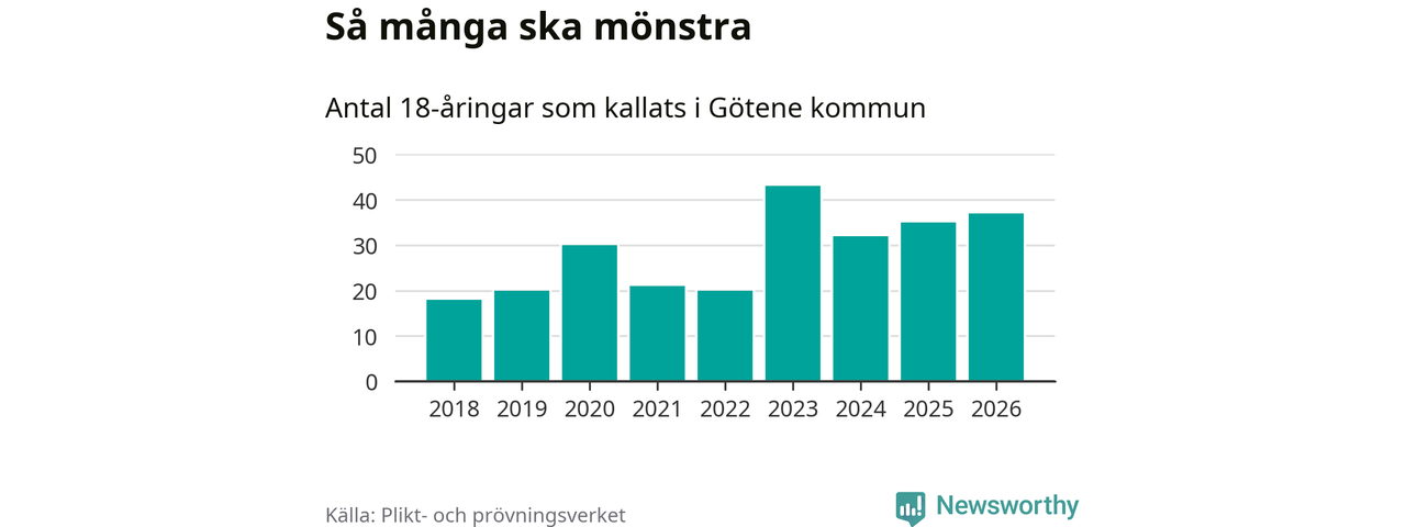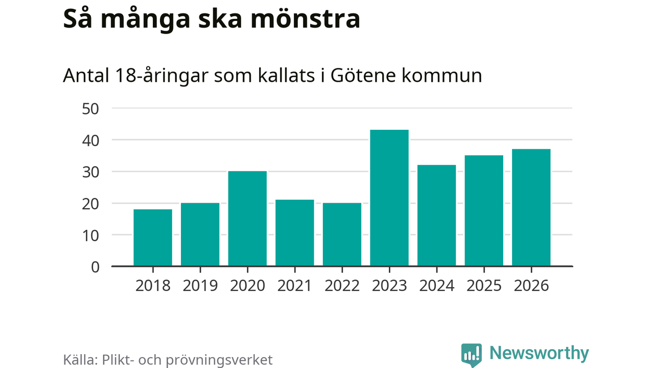 Nu kallas omkring 30 000 svenskar födda 2008 till mönstring. Och 37 av dem kommer från Götene, enligt ny statistik från Plikt- och prövningsverket. Det innebär att nästan var fjärde invånare i åldersgruppen i kommunen kallas till mönstring. Det är ungefär lika stor andel som i Västra Götaland totalt. Även i riket som helhet kallas nästan var fjärde person i årskullen.