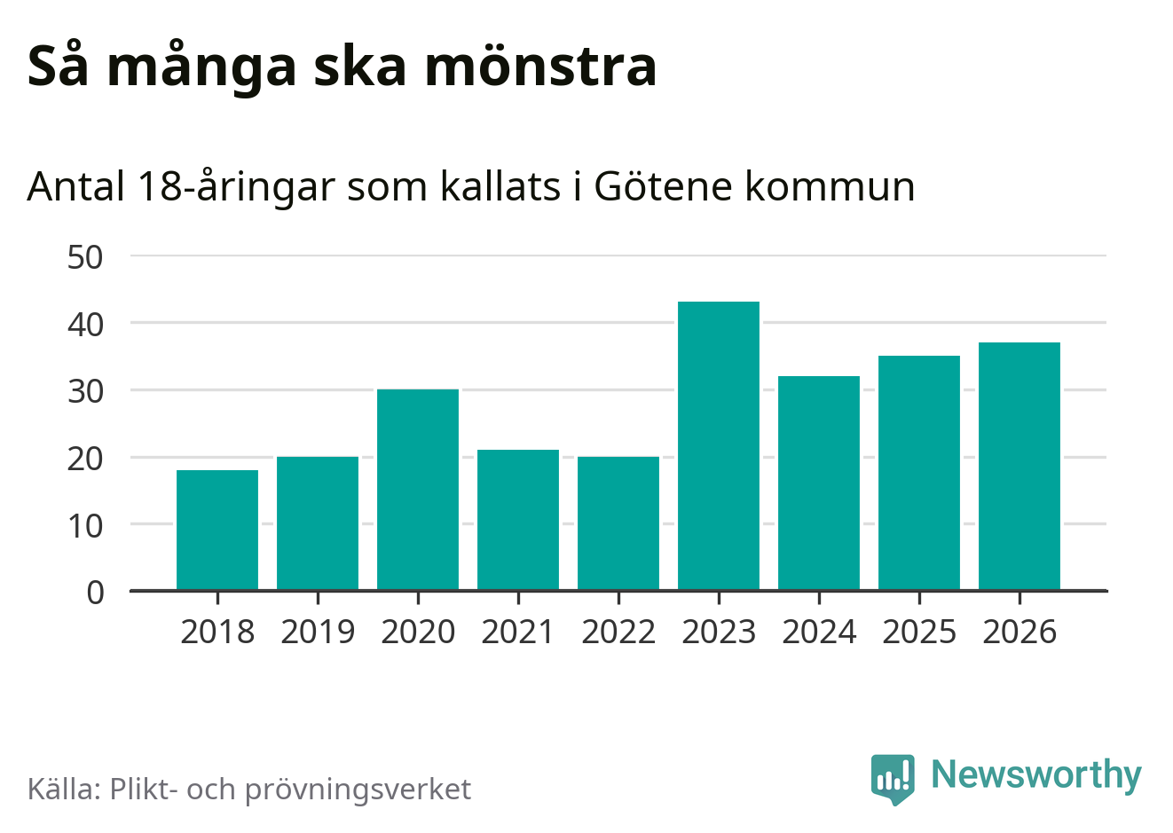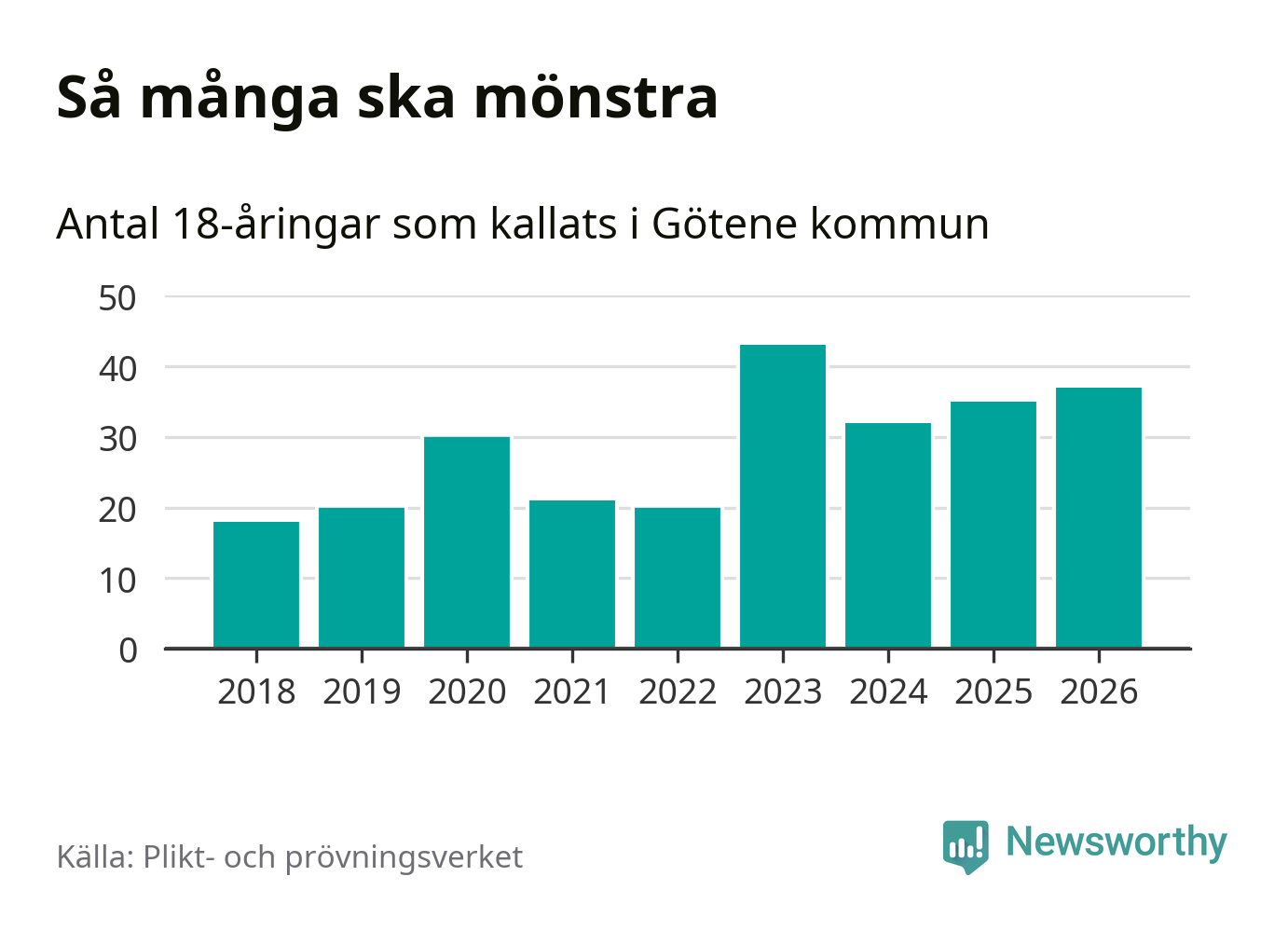 37 personer är två fler än 2025. Som mest har 43 personer från en årskull kommunen mönstrat (2023). Totalt från Västra Götalands län kallas 4 609 personer i år.