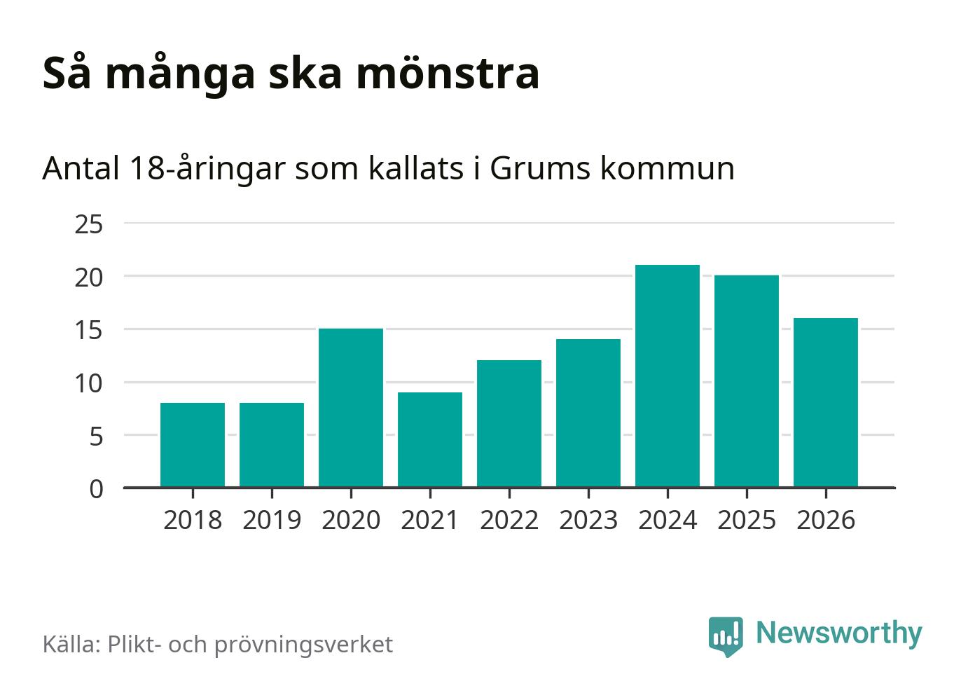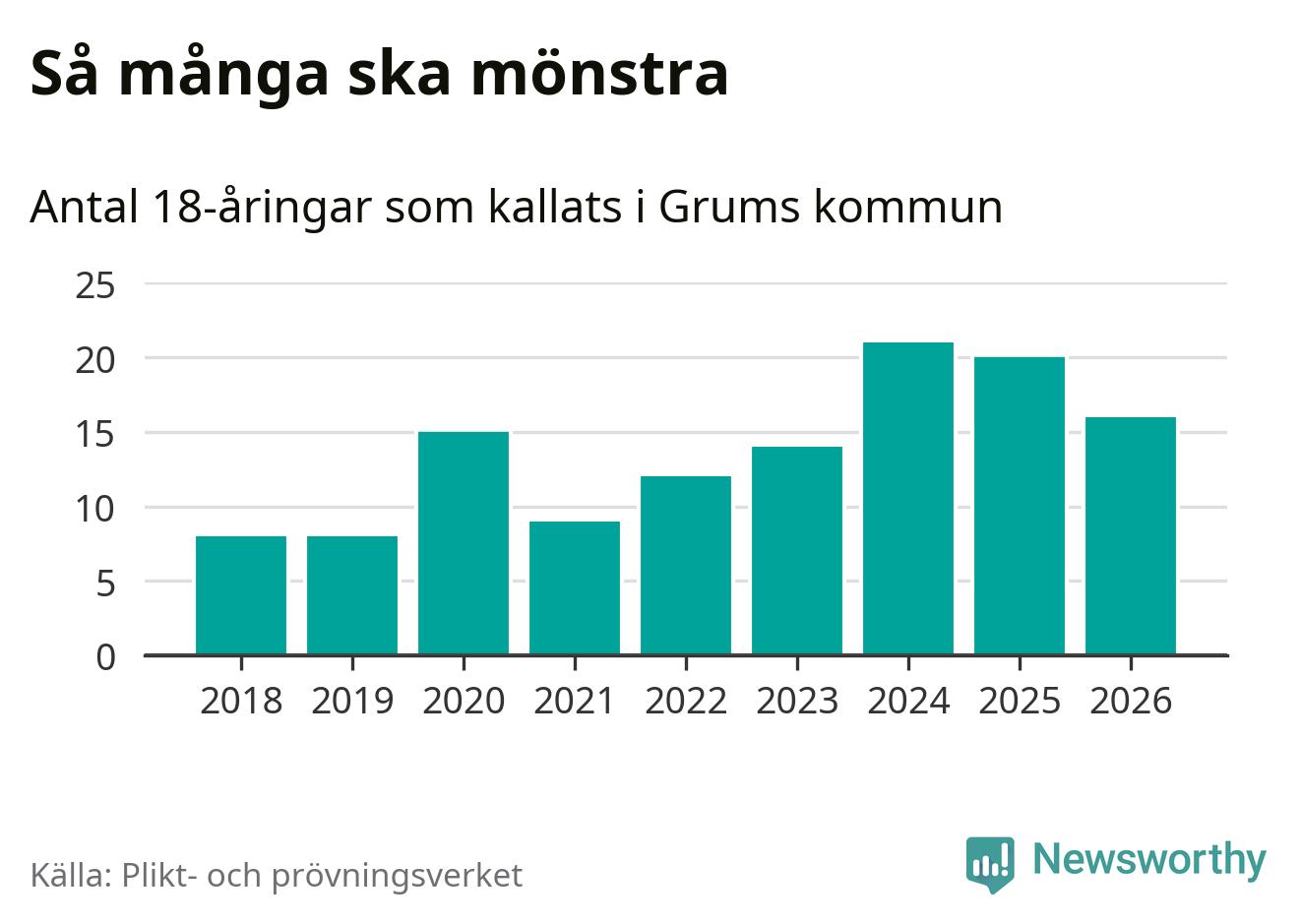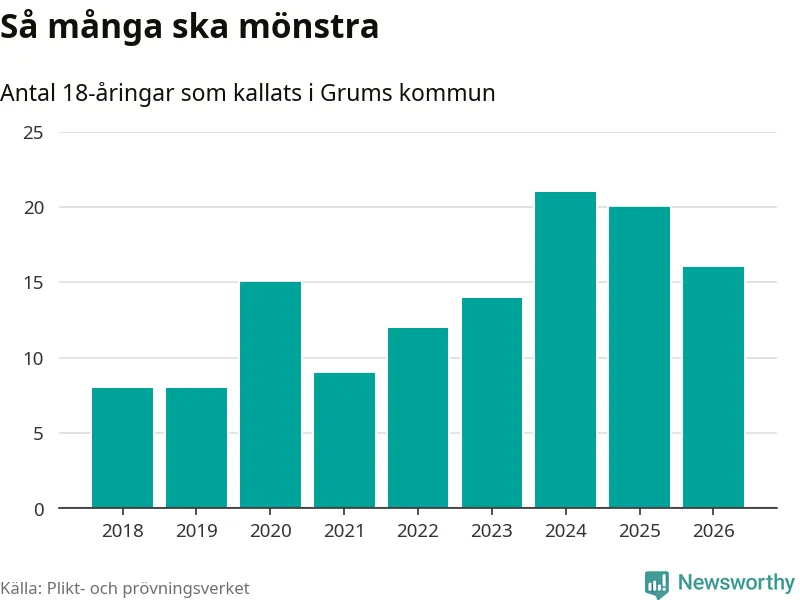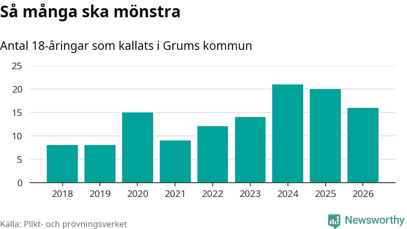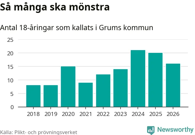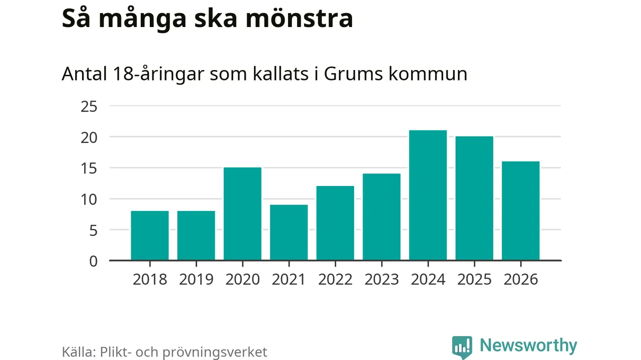 Nu kallas omkring 30 000 svenskar födda 2008 till mönstring. Och 16 av dem kommer från Grums, enligt ny statistik från Plikt- och prövningsverket. Det innebär att var femte invånare i åldersgruppen i kommunen kallas till mönstring. Det är en lägre andel än i Värmland totalt. I riket som helhet kallas nästan var fjärde person i årskullen.