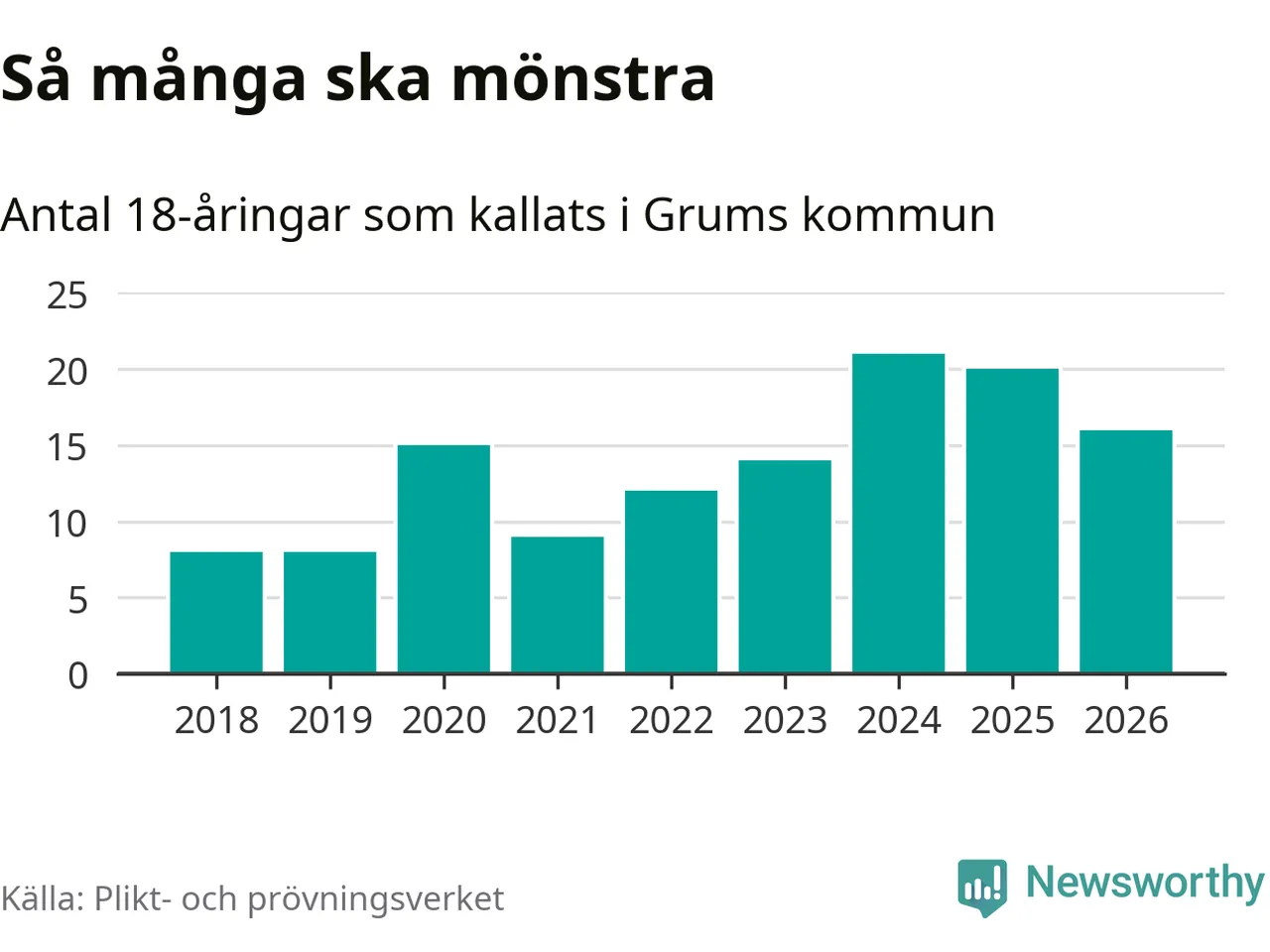 16 personer är fyra färre än 2025, men sett som andel av respektive åldersgrupp är skillnaden liten. Som mest har 21 personer från en årskull kommunen mönstrat (2024). Totalt från Värmlands län kallas 730 personer i år.