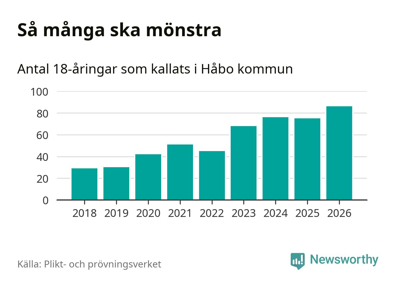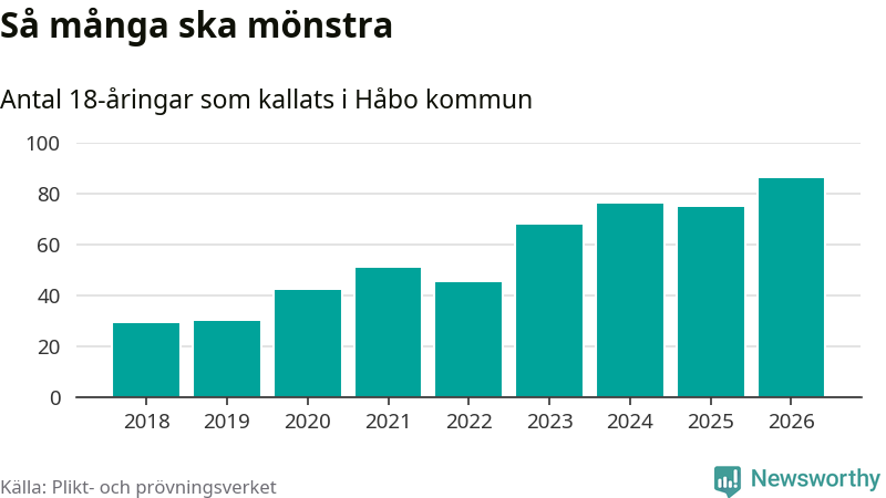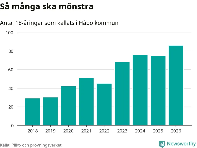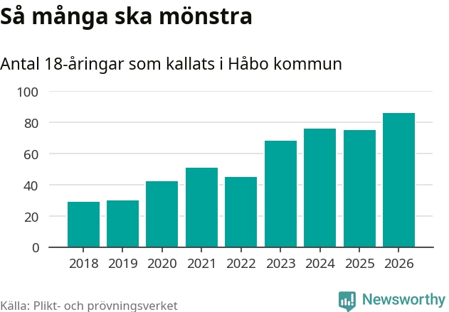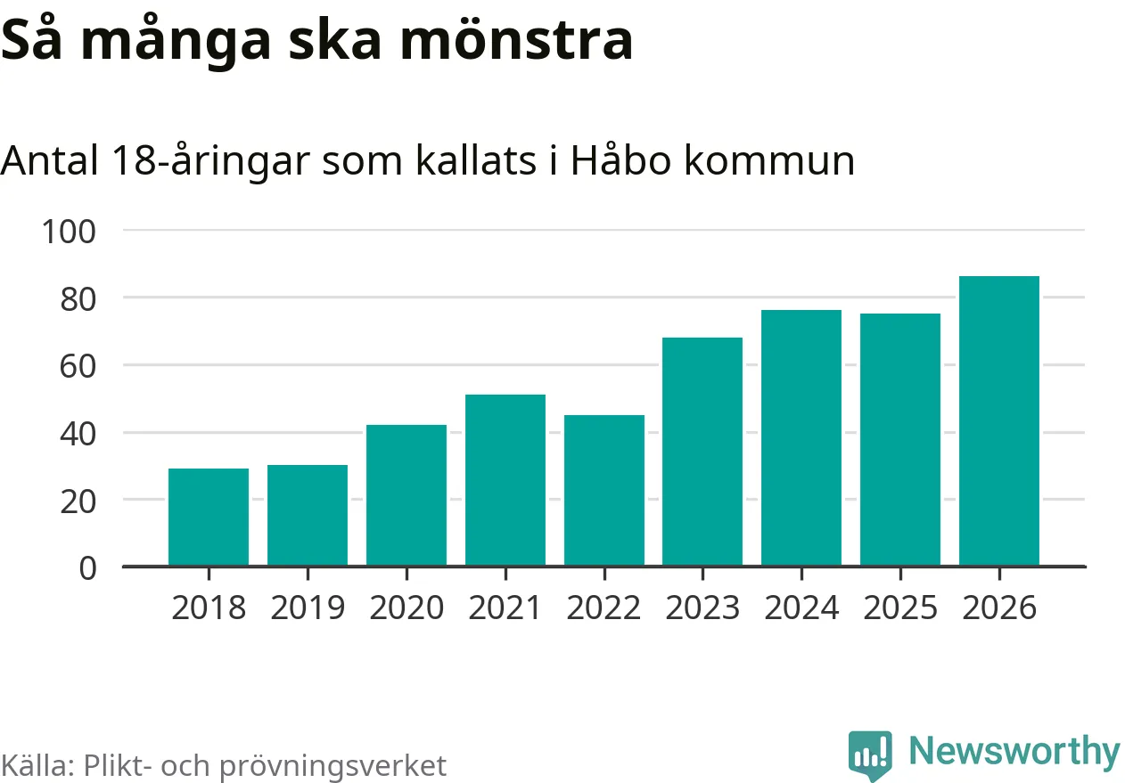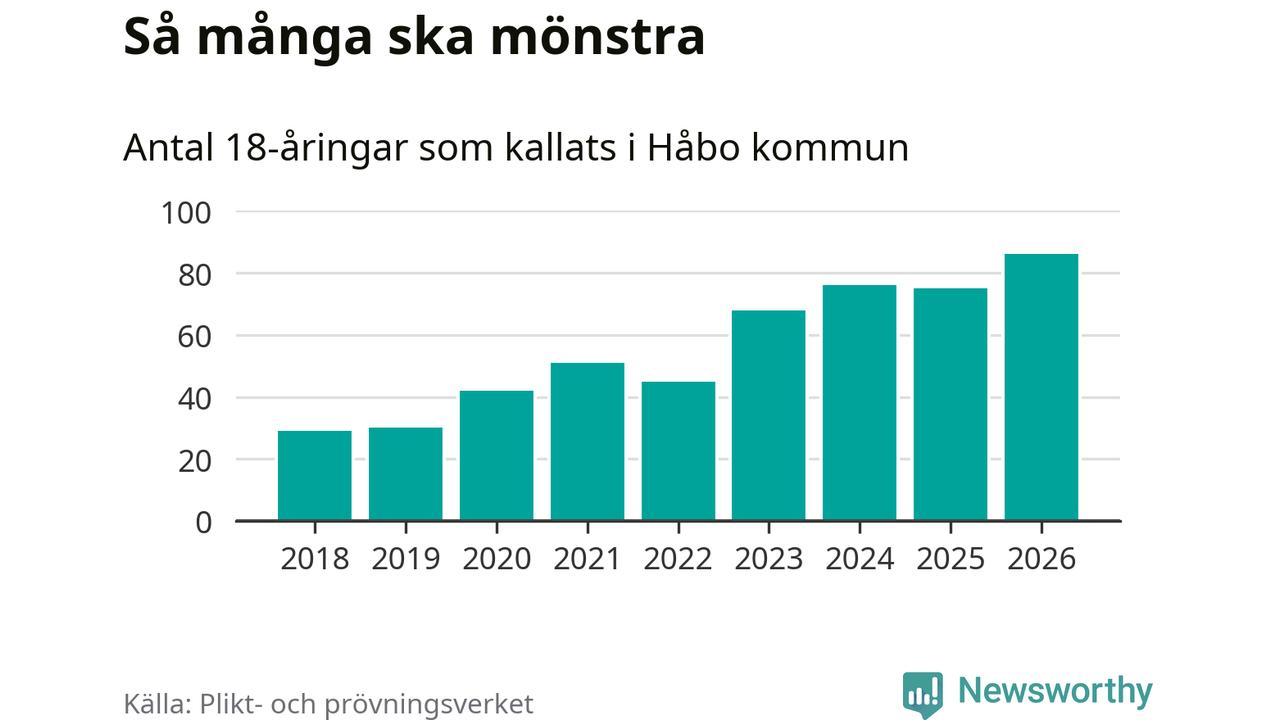 86 personer är det högsta antalet kallade i Håbo sedan 2018, som är första året med statistik på kommunnivå (värnplikten återinfördes 2017), och elva mönstrande fler än 2025. Totalt från Uppsala län kallas 1 157 personer i år.