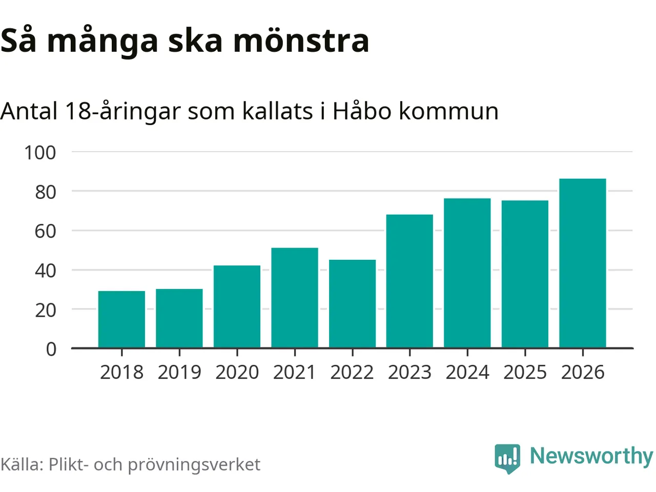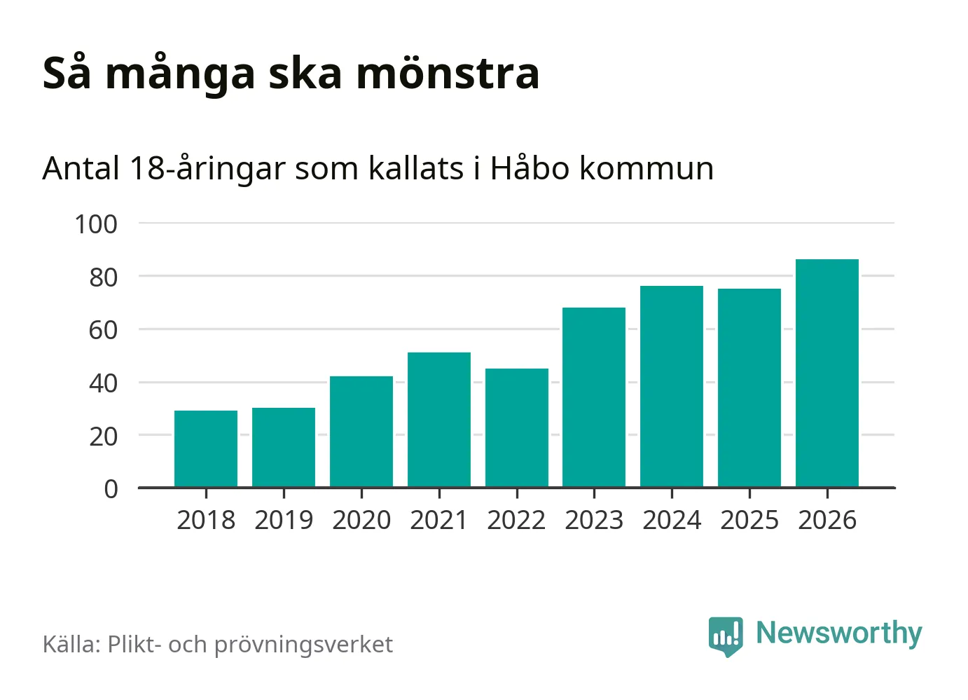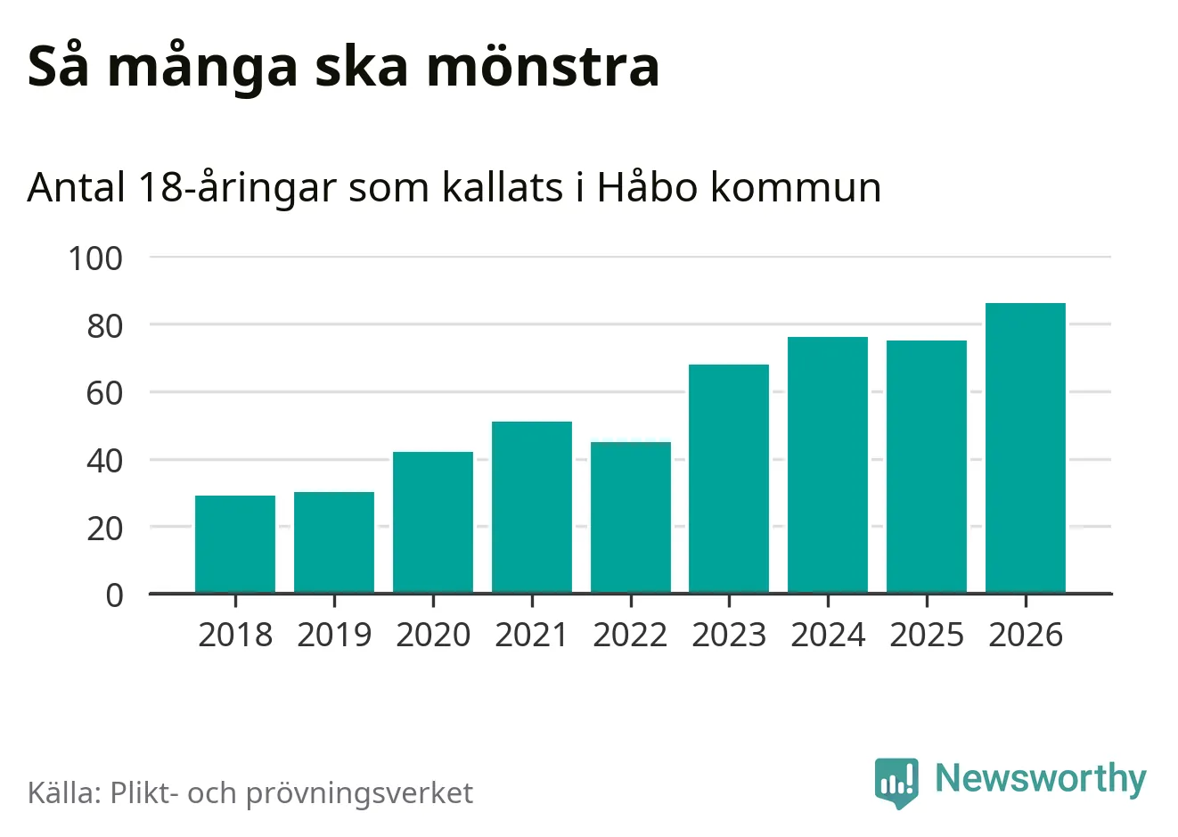 86 personer är det högsta antalet kallade i Håbo sedan 2018, som är första året med statistik på kommunnivå (värnplikten återinfördes 2017), och elva mönstrande fler än 2025. Totalt från Uppsala län kallas 1 157 personer i år.