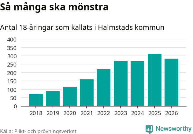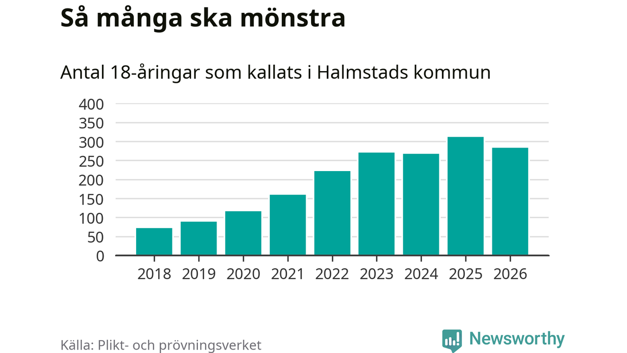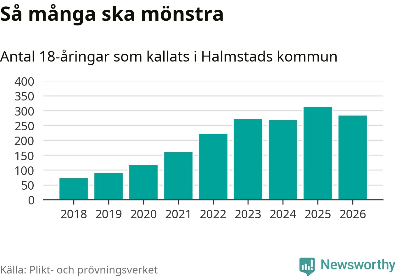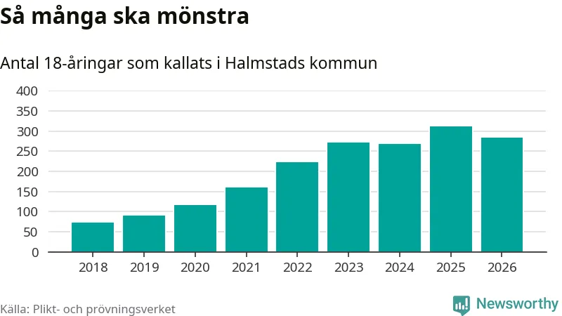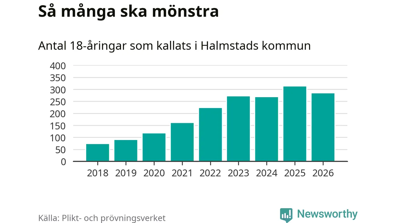 Nu kallas omkring 30 000 svenskar födda 2008 till mönstring. Och 283 av dem kommer från Halmstad, enligt ny statistik från Plikt- och prövningsverket. Det innebär att nästan var fjärde invånare i åldersgruppen i kommunen kallas till mönstring. Det är ungefär lika stor andel som i Halland totalt. Även i riket som helhet kallas nästan var fjärde person i årskullen.