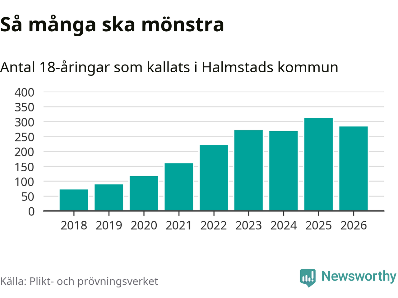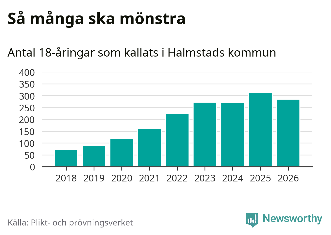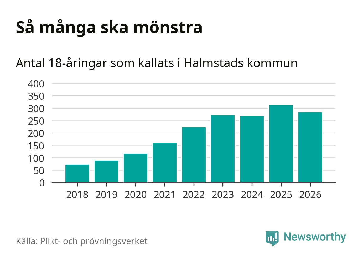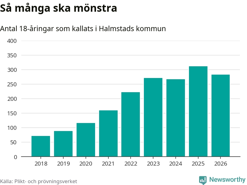 Nu kallas omkring 30 000 svenskar födda 2008 till mönstring. Och 283 av dem kommer från Halmstad, enligt ny statistik från Plikt- och prövningsverket. Det innebär att nästan var fjärde invånare i åldersgruppen i kommunen kallas till mönstring. Det är ungefär lika stor andel som i Halland totalt. Även i riket som helhet kallas nästan var fjärde person i årskullen.