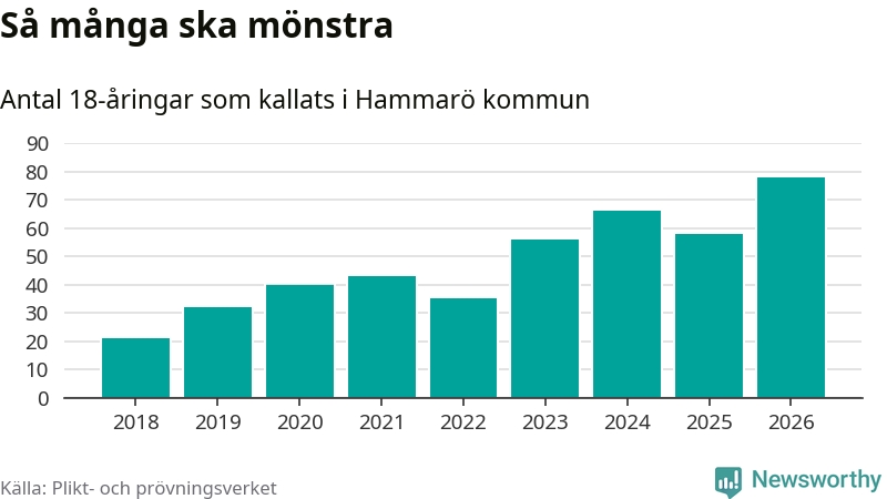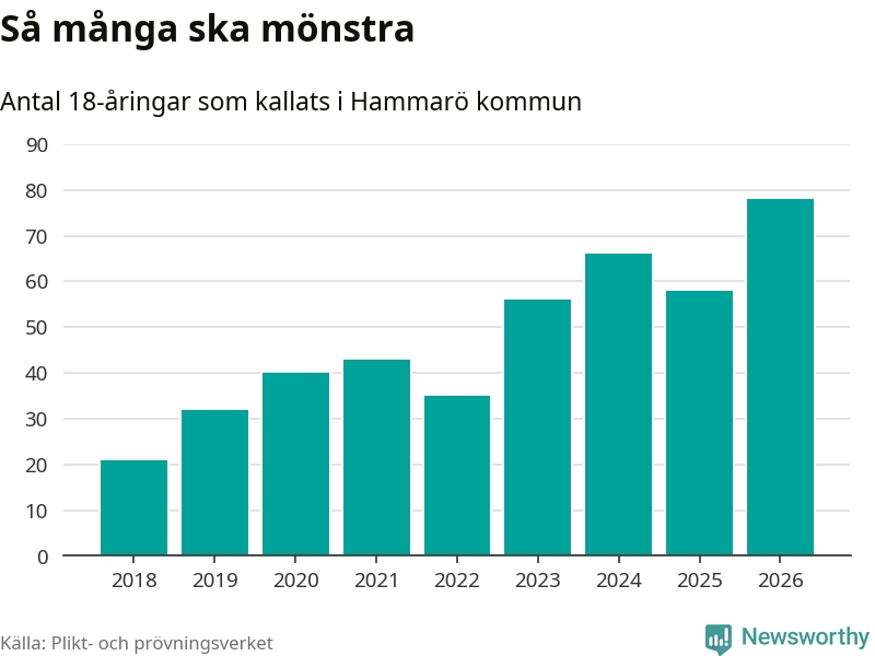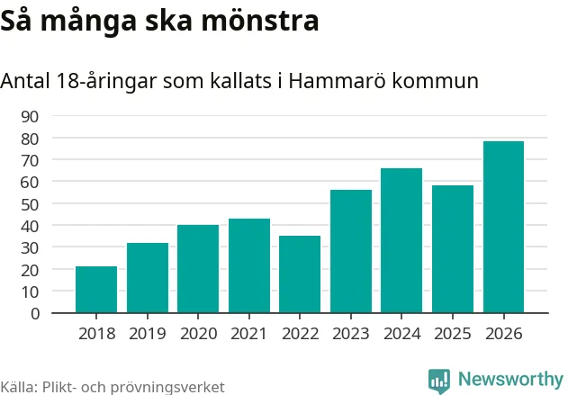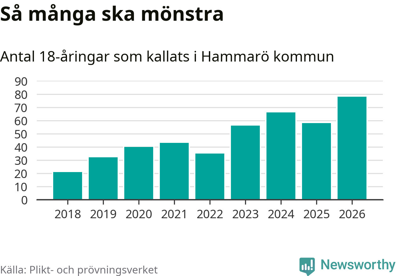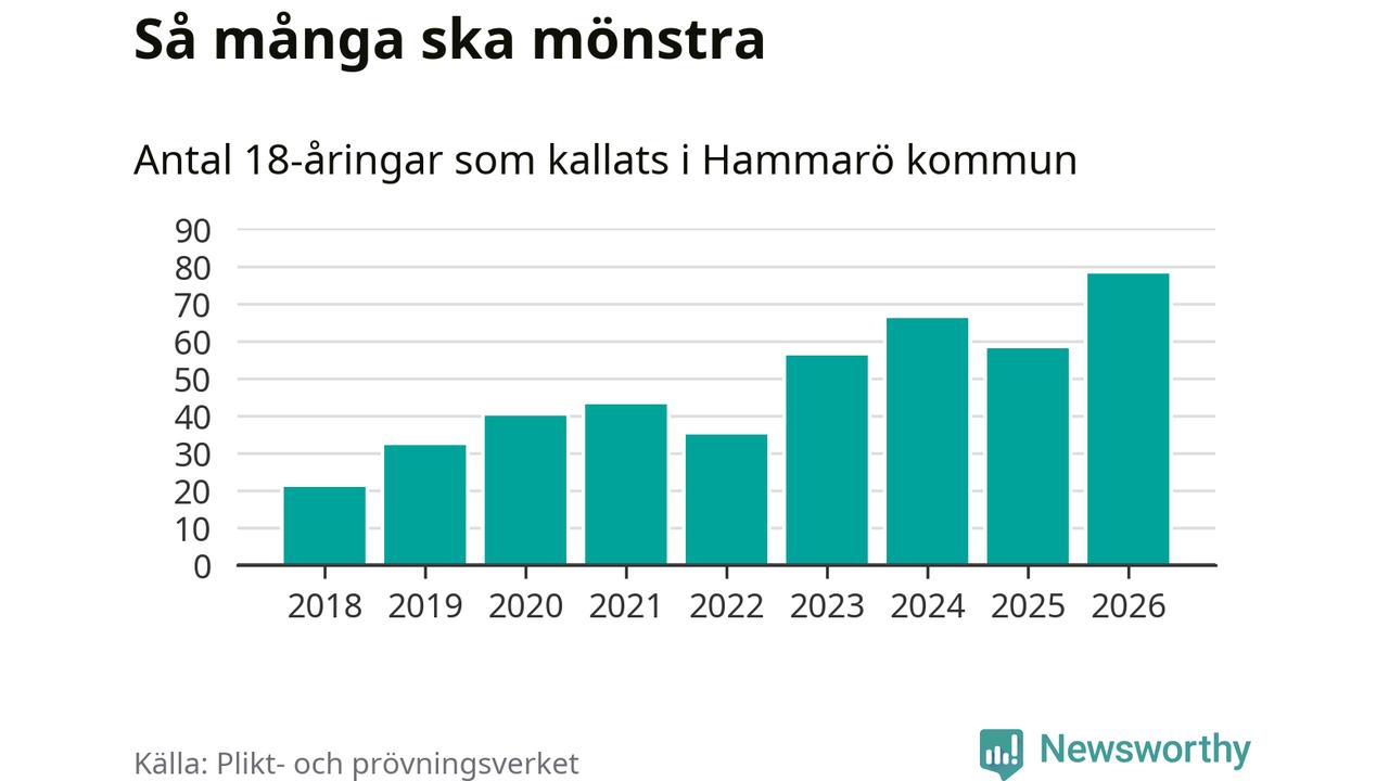 78 personer är det högsta antalet kallade på Hammarö sedan 2018, som är första året med statistik på kommunnivå (värnplikten återinfördes 2017), och 20 mönstrande fler än 2025. Totalt från Värmlands län kallas 730 personer i år.