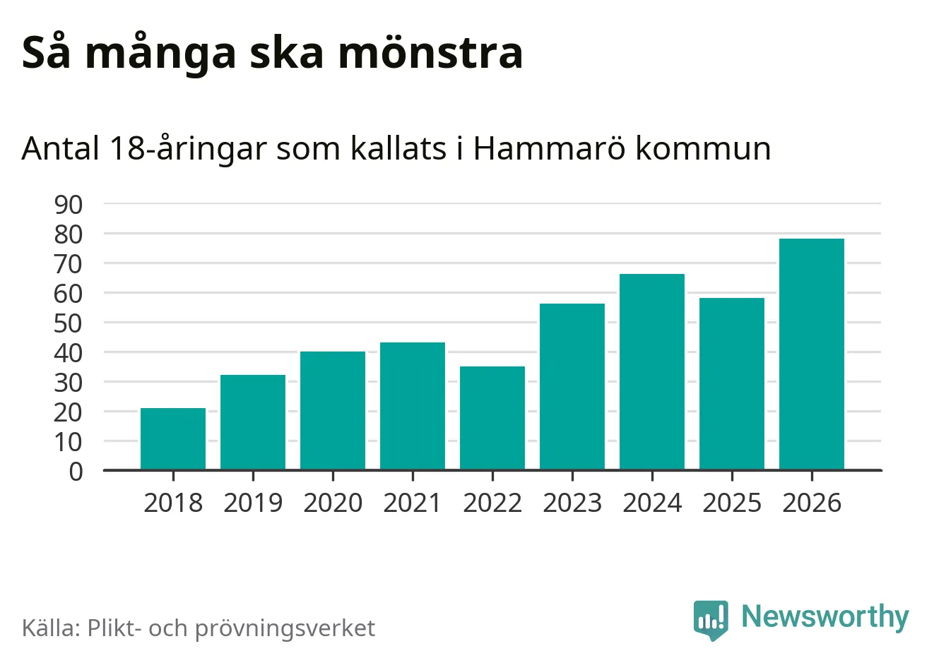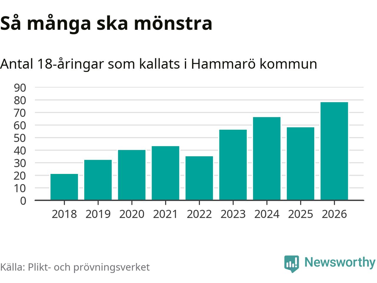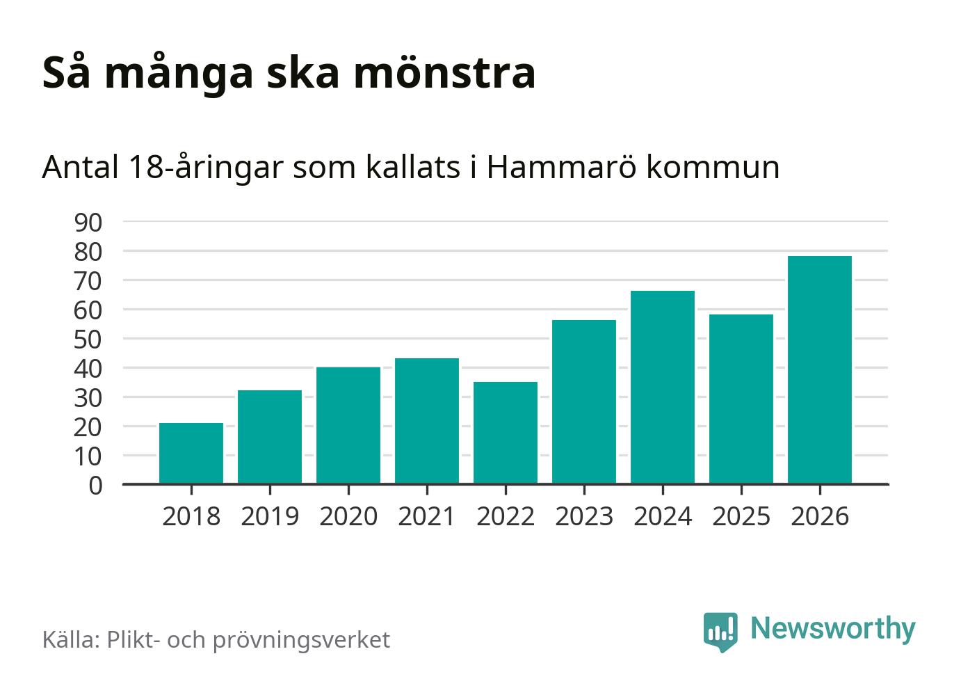 78 personer är det högsta antalet kallade på Hammarö sedan 2018, som är första året med statistik på kommunnivå (värnplikten återinfördes 2017), och 20 mönstrande fler än 2025. Totalt från Värmlands län kallas 730 personer i år.