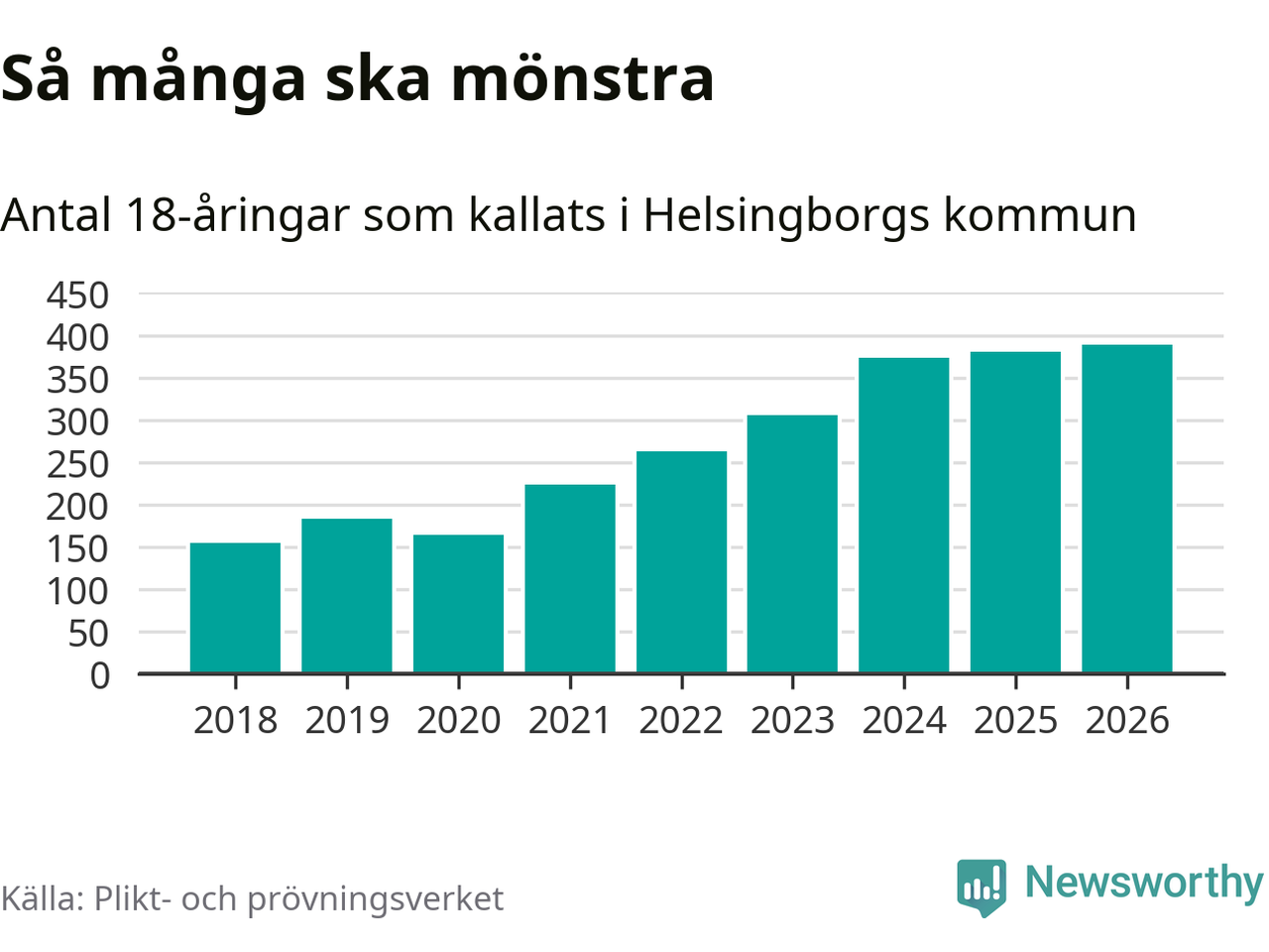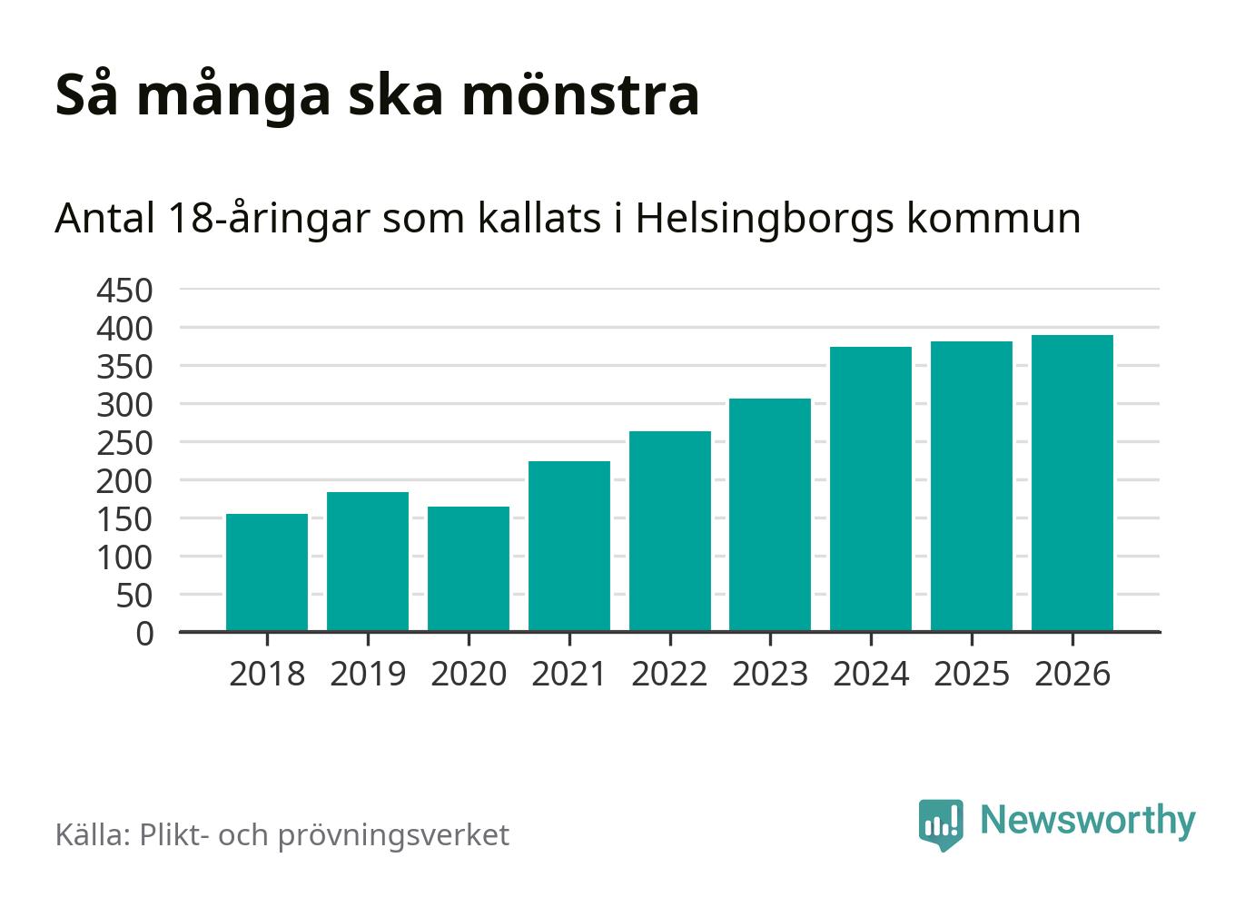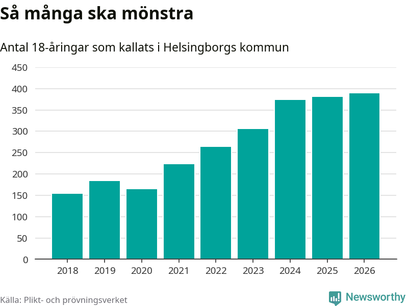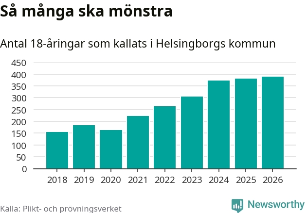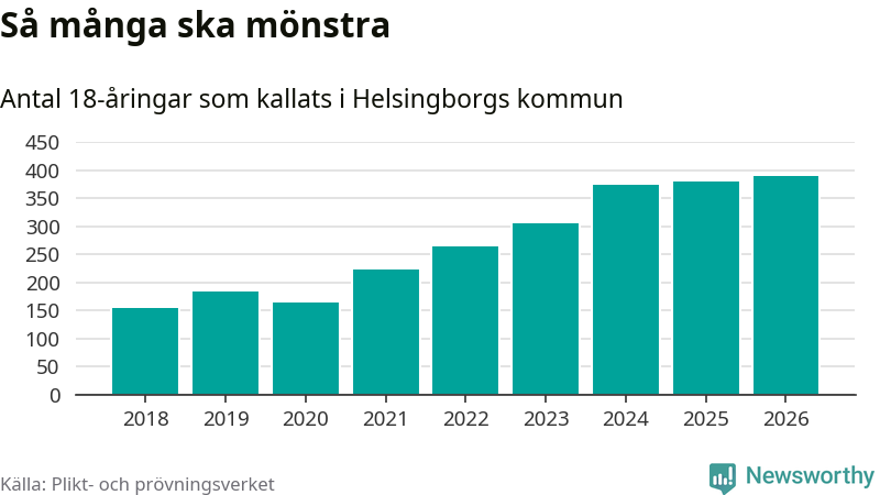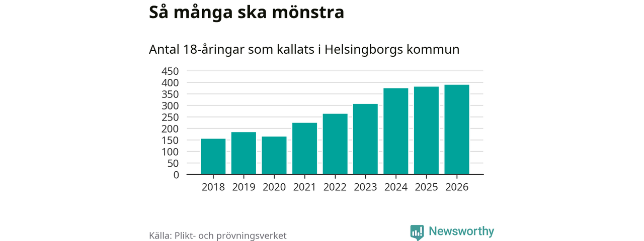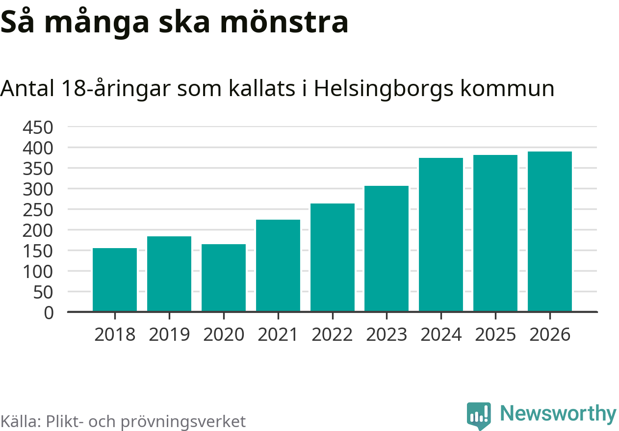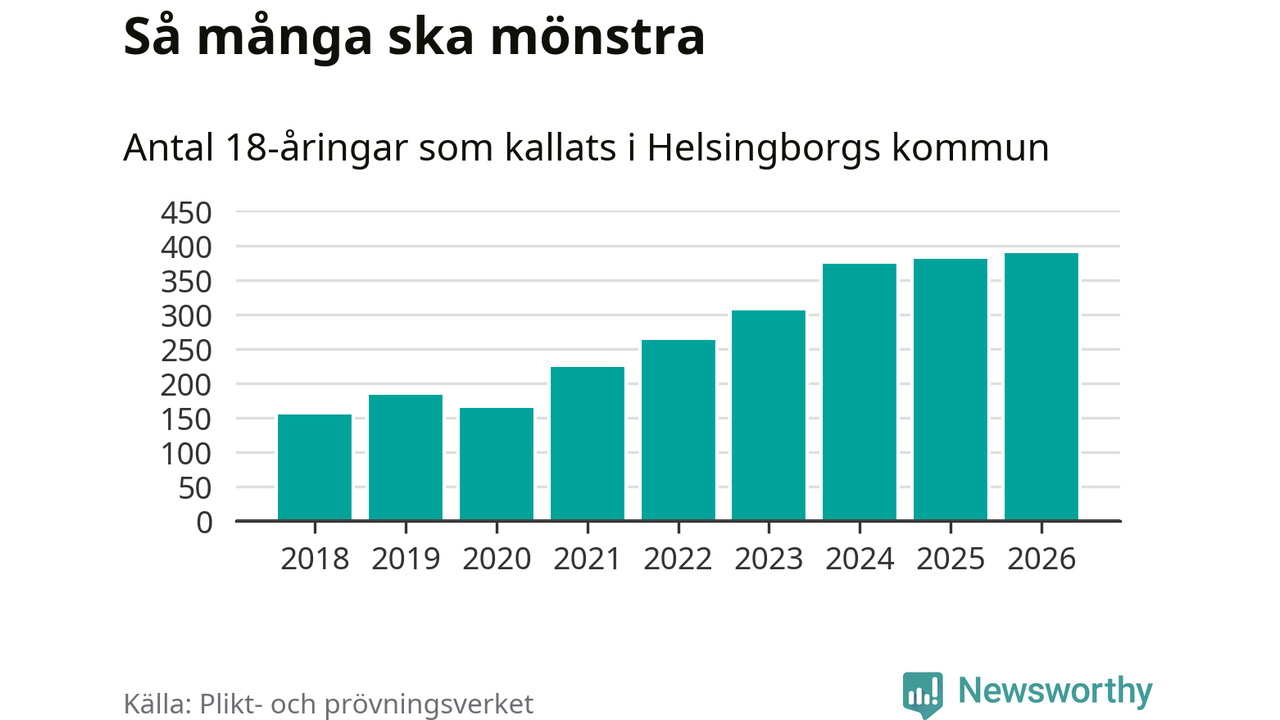 389 personer är det högsta antalet kallade i Helsingborg sedan 2018, som är första året med statistik på kommunnivå (värnplikten återinfördes 2017), och nio mönstrande fler än 2025. Totalt från Skåne län kallas 3 778 personer i år.