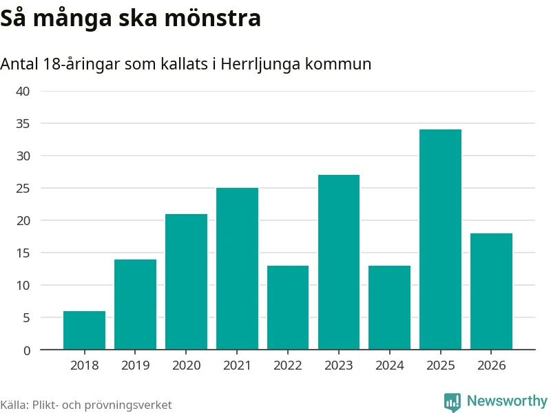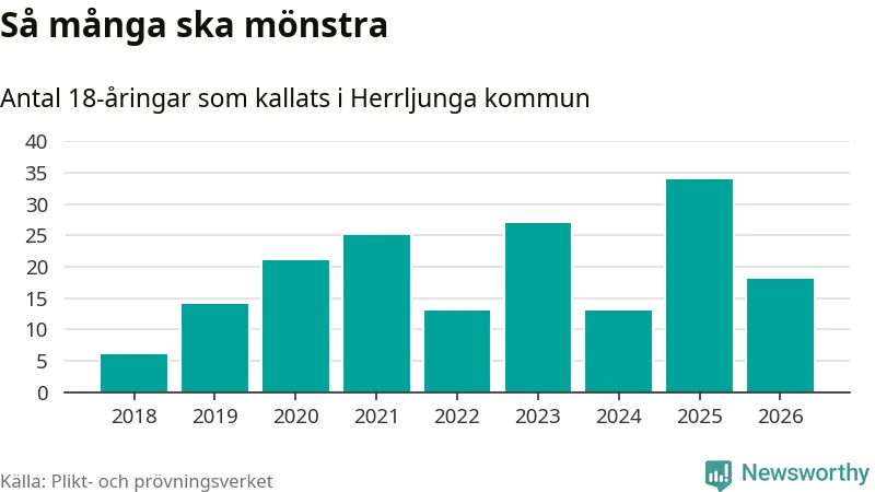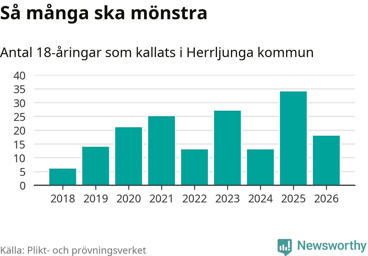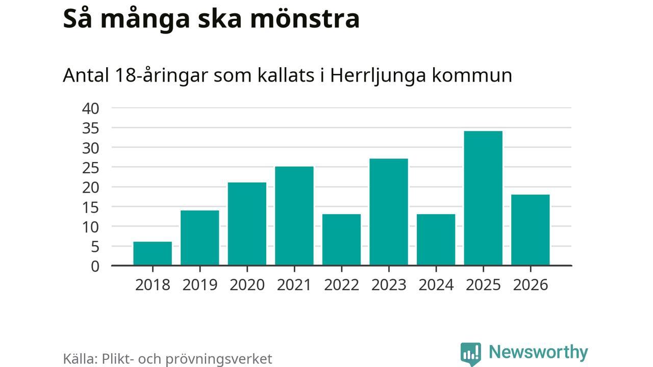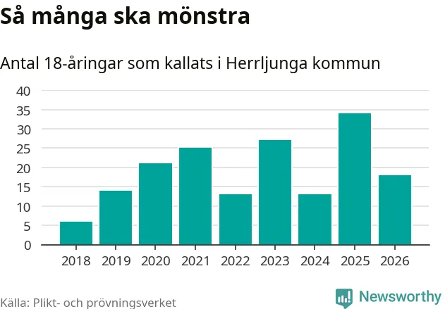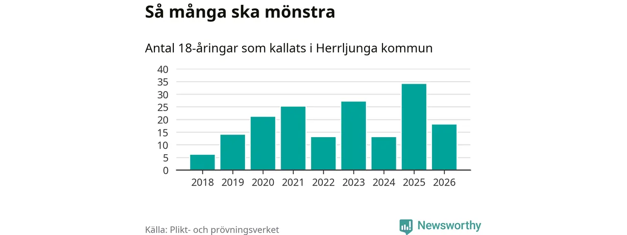 Nu kallas omkring 30 000 svenskar födda 2008 till mönstring. Och 18 av dem kommer från Herrljunga, enligt ny statistik från Plikt- och prövningsverket. Det innebär att var femte invånare i åldersgruppen i kommunen kallas till mönstring. Det är en lägre andel än i Västra Götaland totalt. I riket som helhet kallas nästan var fjärde person i årskullen.