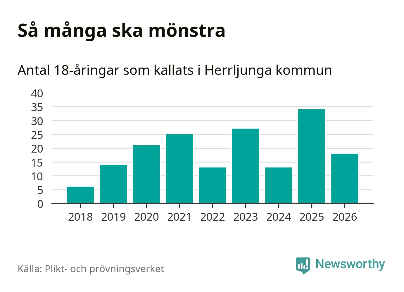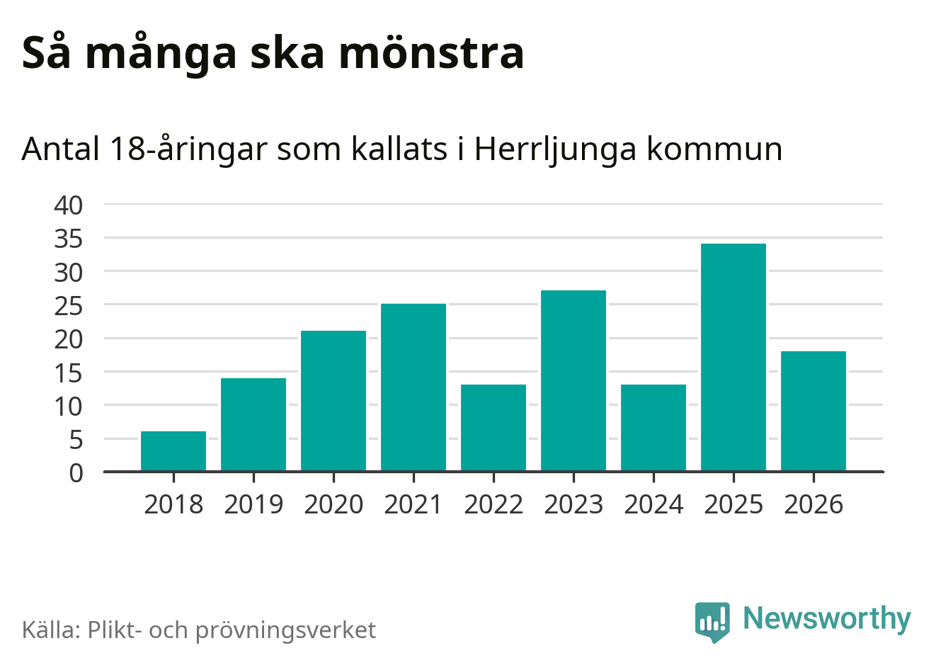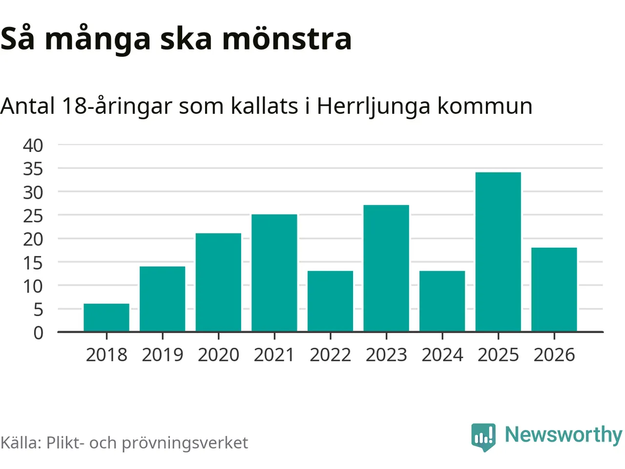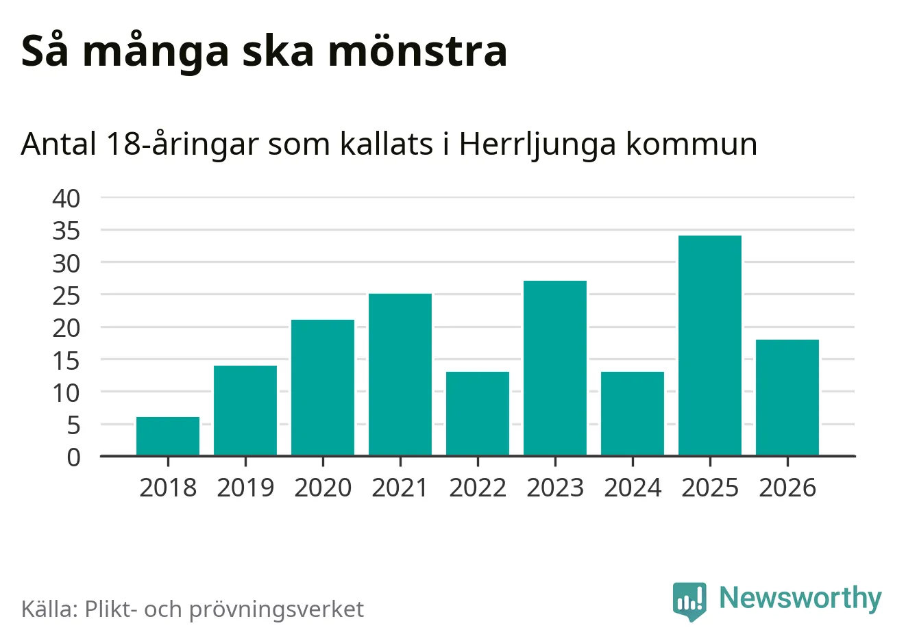 Nu kallas omkring 30 000 svenskar födda 2008 till mönstring. Och 18 av dem kommer från Herrljunga, enligt ny statistik från Plikt- och prövningsverket. Det innebär att var femte invånare i åldersgruppen i kommunen kallas till mönstring. Det är en lägre andel än i Västra Götaland totalt. I riket som helhet kallas nästan var fjärde person i årskullen.