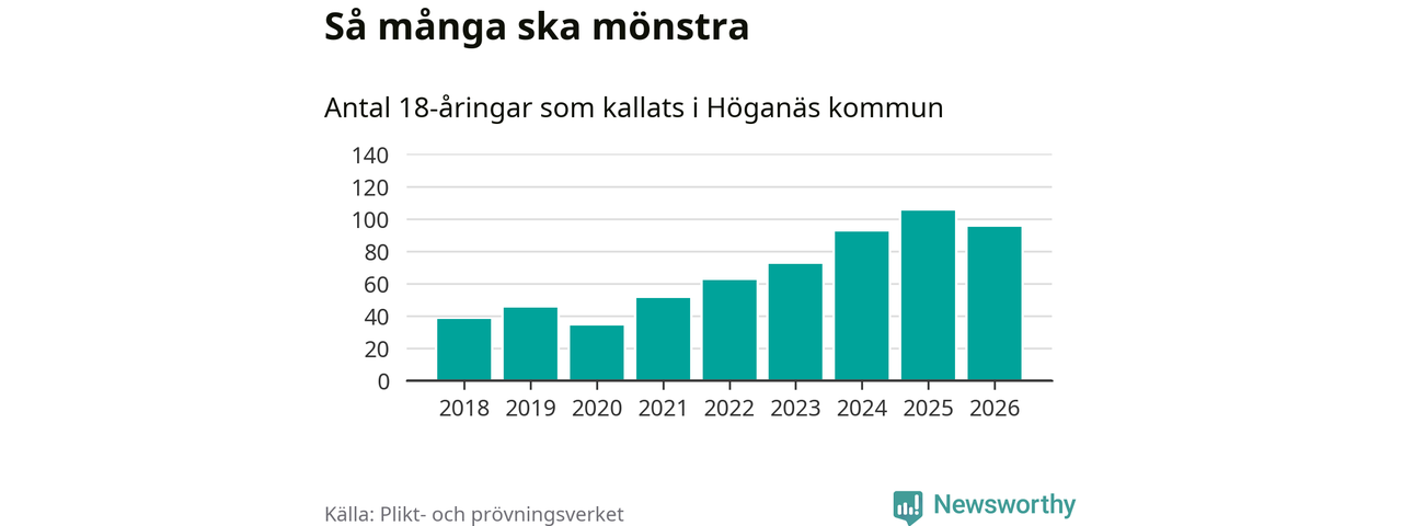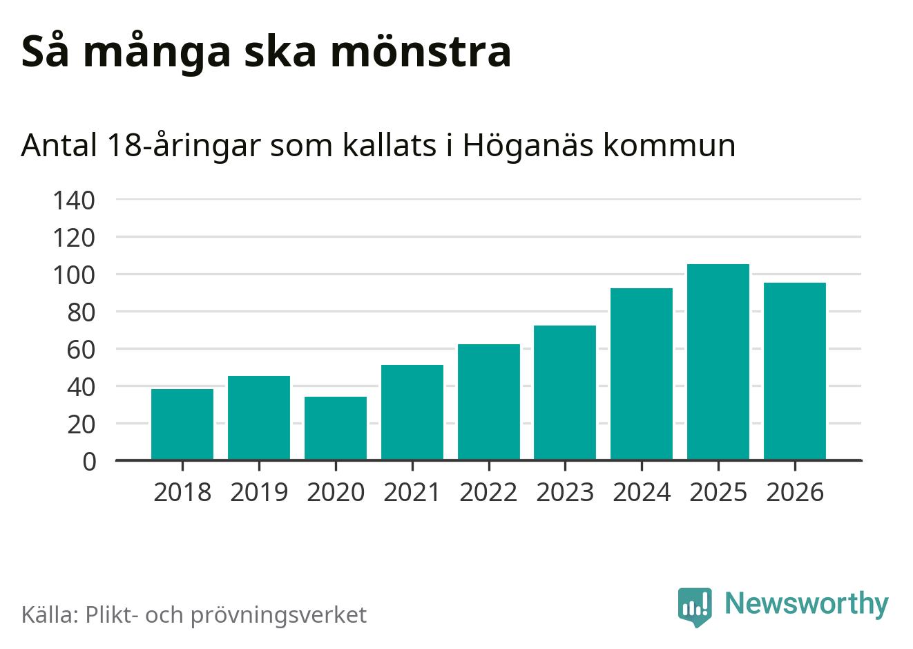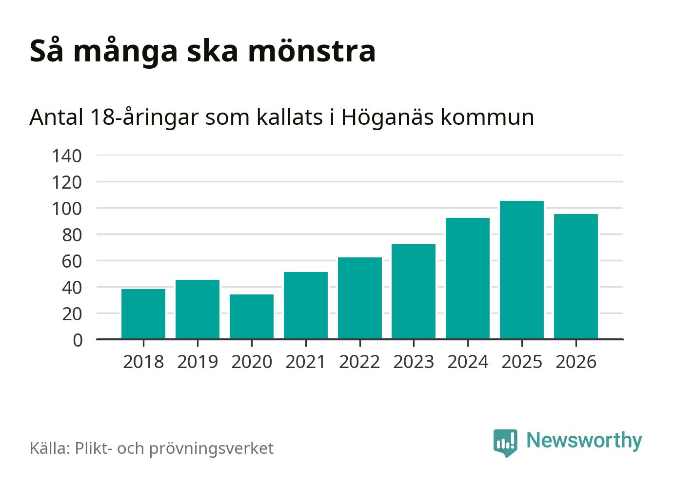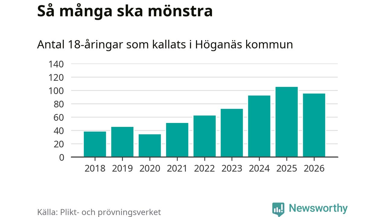 Nu kallas omkring 30 000 svenskar födda 2008 till mönstring. Och 95 av dem kommer från Höganäs, enligt ny statistik från Plikt- och prövningsverket. Det innebär att var fjärde invånare i åldersgruppen i kommunen kallas till mönstring. Det är en högre andel än i Skåne totalt. I riket som helhet kallas nästan var fjärde person i årskullen.