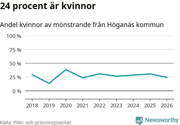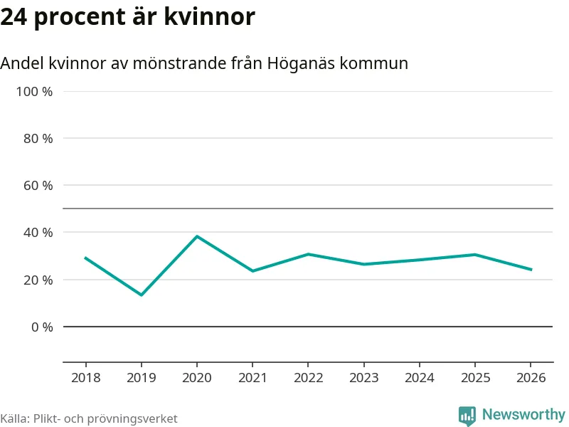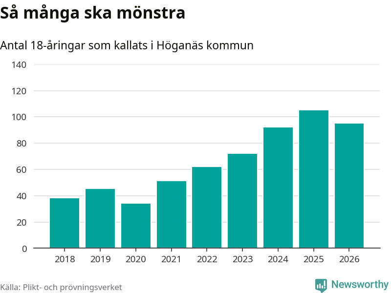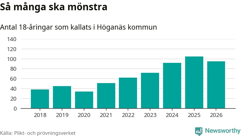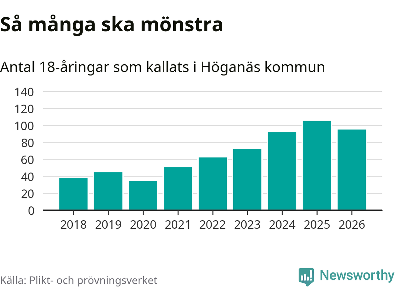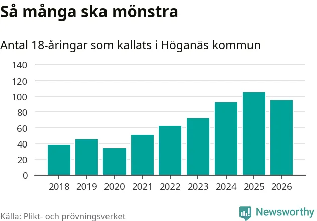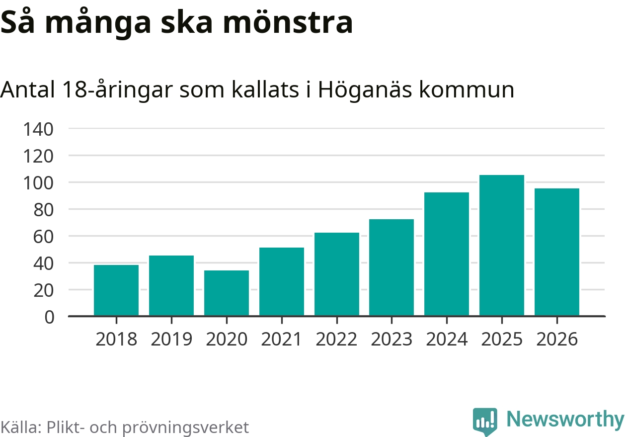 Nu kallas omkring 30 000 svenskar födda 2008 till mönstring. Och 95 av dem kommer från Höganäs, enligt ny statistik från Plikt- och prövningsverket. Det innebär att var fjärde invånare i åldersgruppen i kommunen kallas till mönstring. Det är en högre andel än i Skåne totalt. I riket som helhet kallas nästan var fjärde person i årskullen.