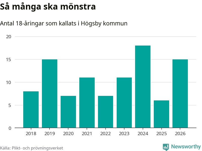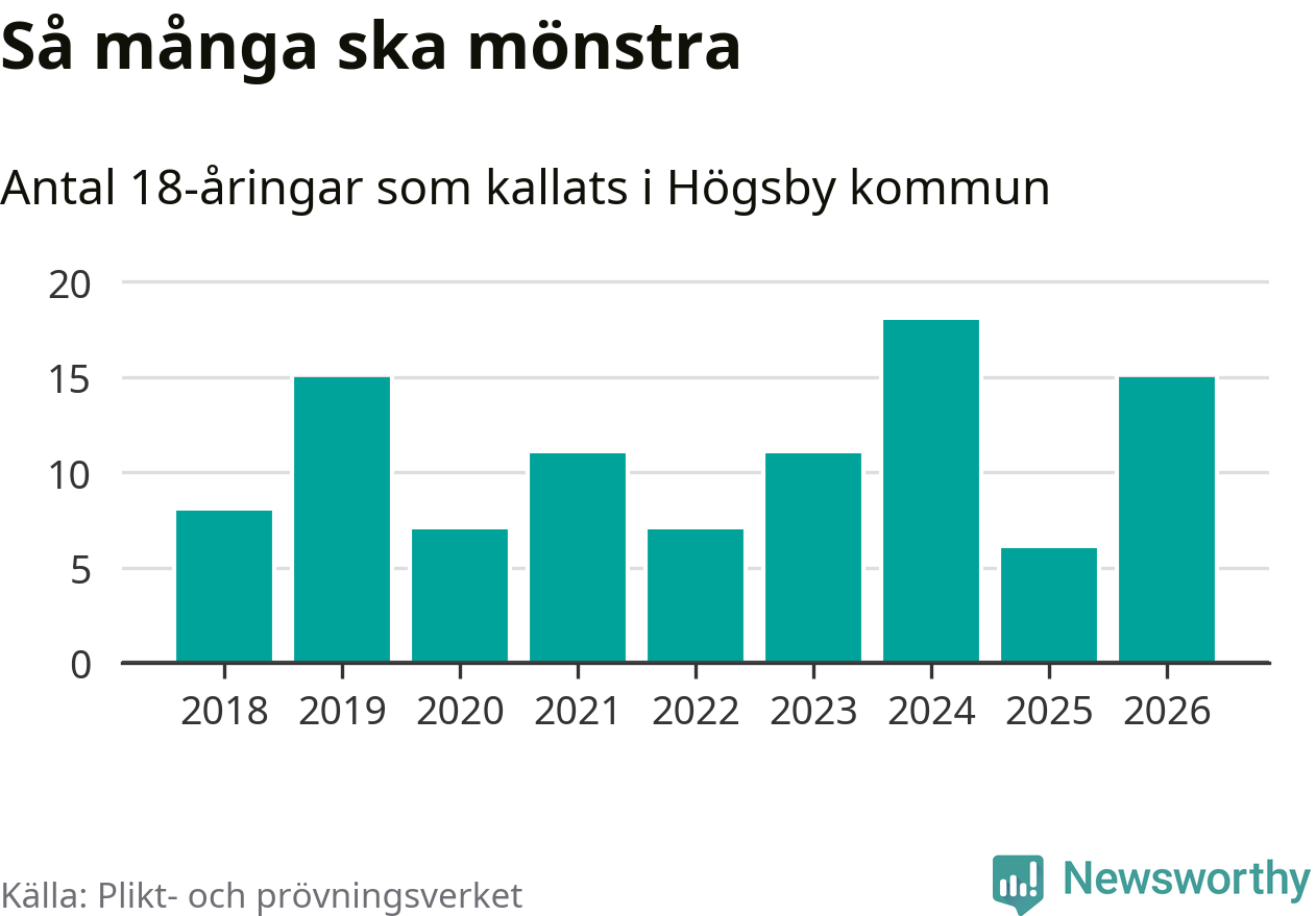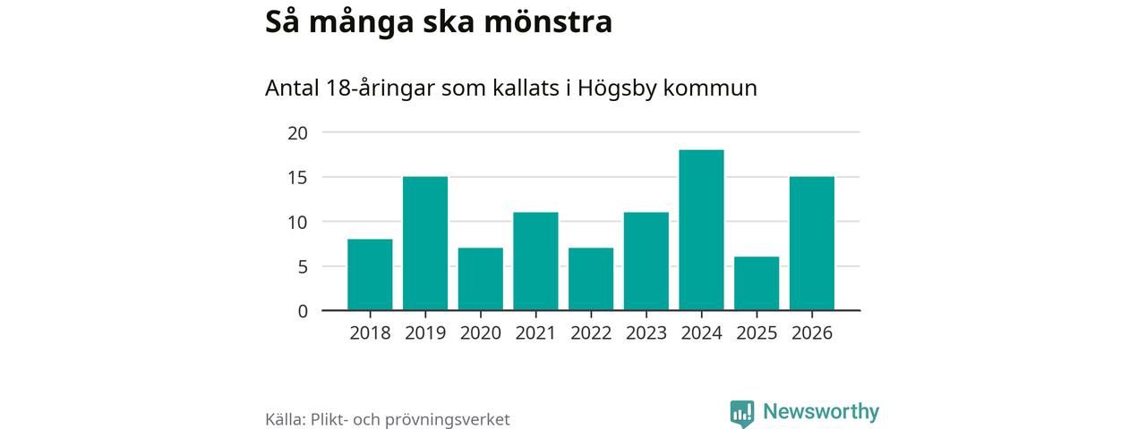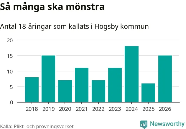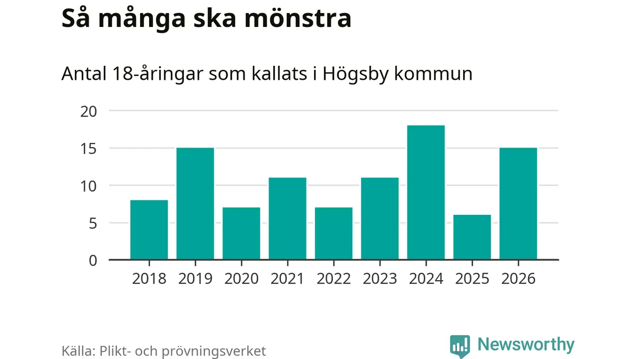 15 personer är nio fler än 2025. Som mest har 18 personer från en årskull kommunen mönstrat (2024). Totalt från Kalmar län kallas 650 personer i år.