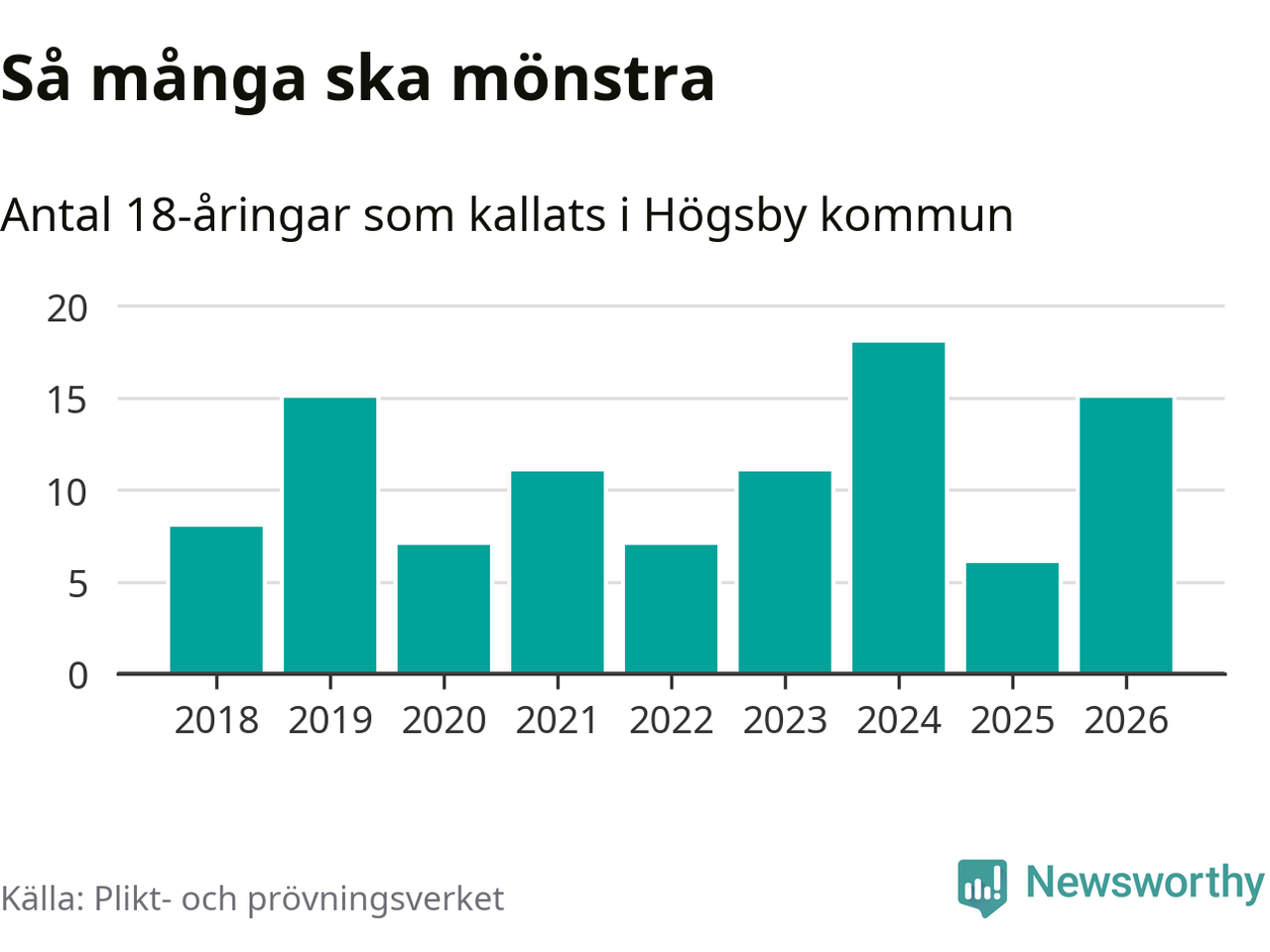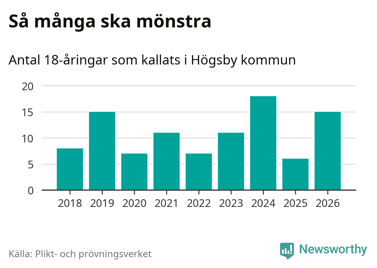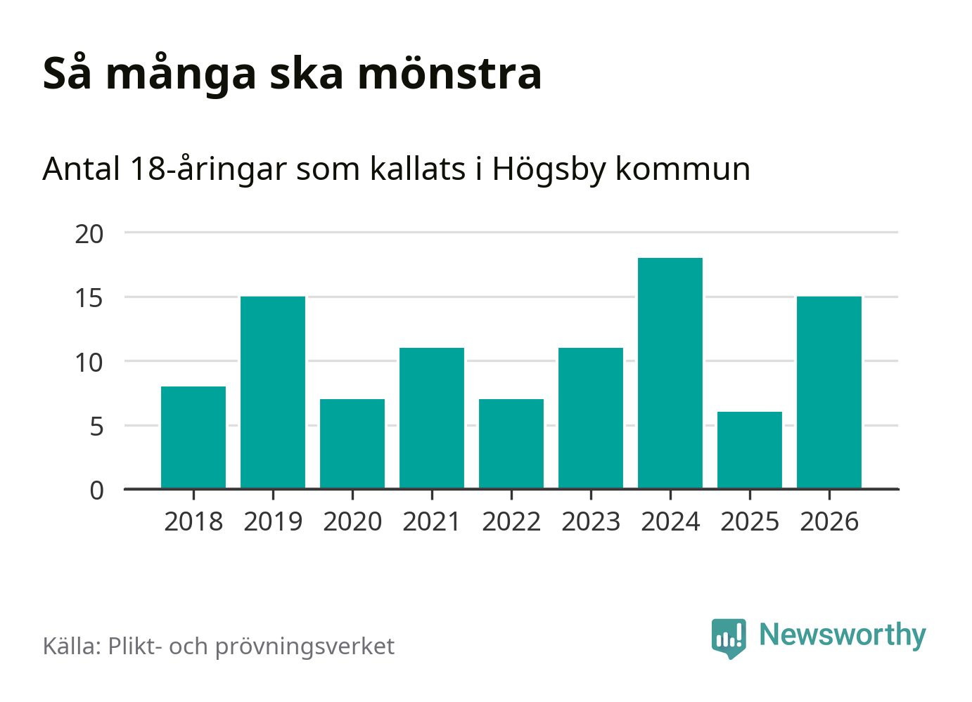 15 personer är nio fler än 2025. Som mest har 18 personer från en årskull kommunen mönstrat (2024). Totalt från Kalmar län kallas 650 personer i år.