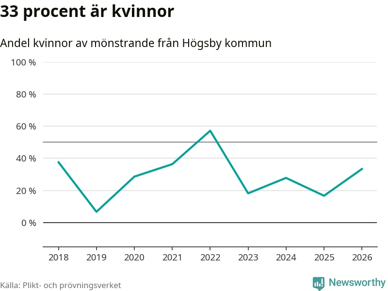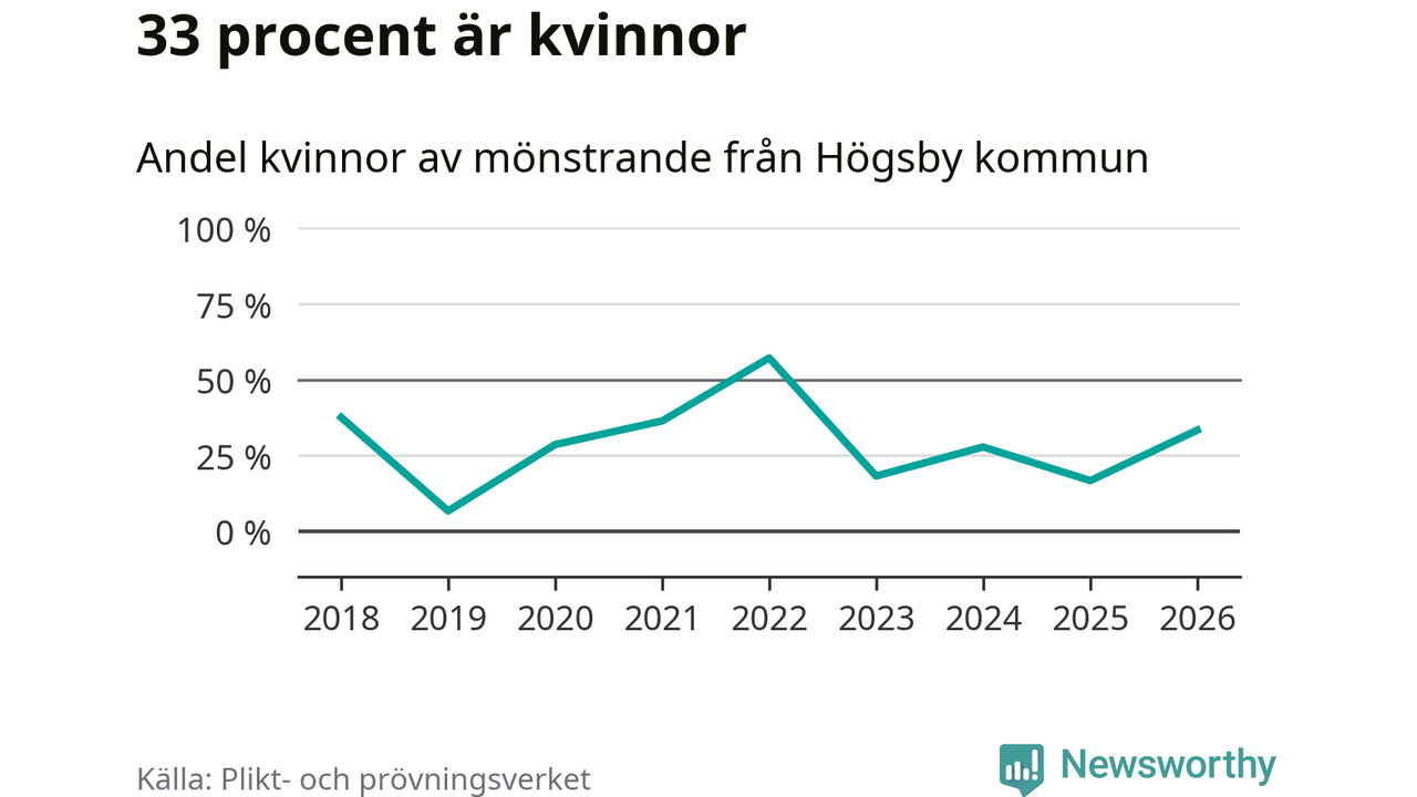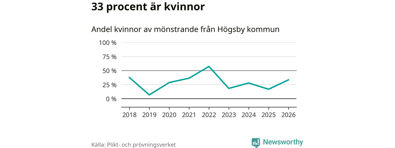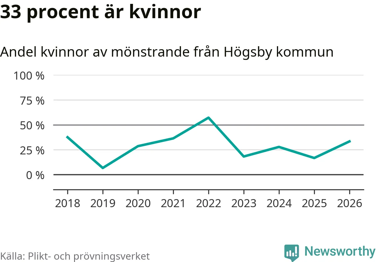 Fem av de som kallats till mönstring från Högsby är kvinnor, vilket motsvarar 33 procent av de mönstrande. I absoluta tal är det fler kvinnor än något år sedan värnplikten återinfördes, men 2022 var en större andel av de mönstrande från kommunen kvinnor (57 procent). I riket som helhet är 28 procent av de mönstrande tjejer.
