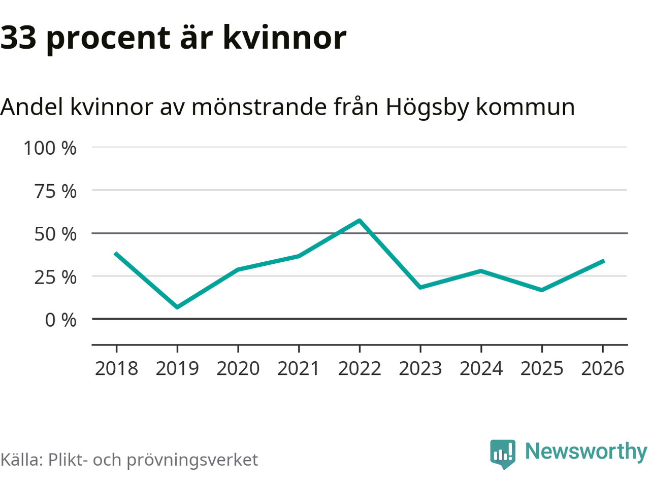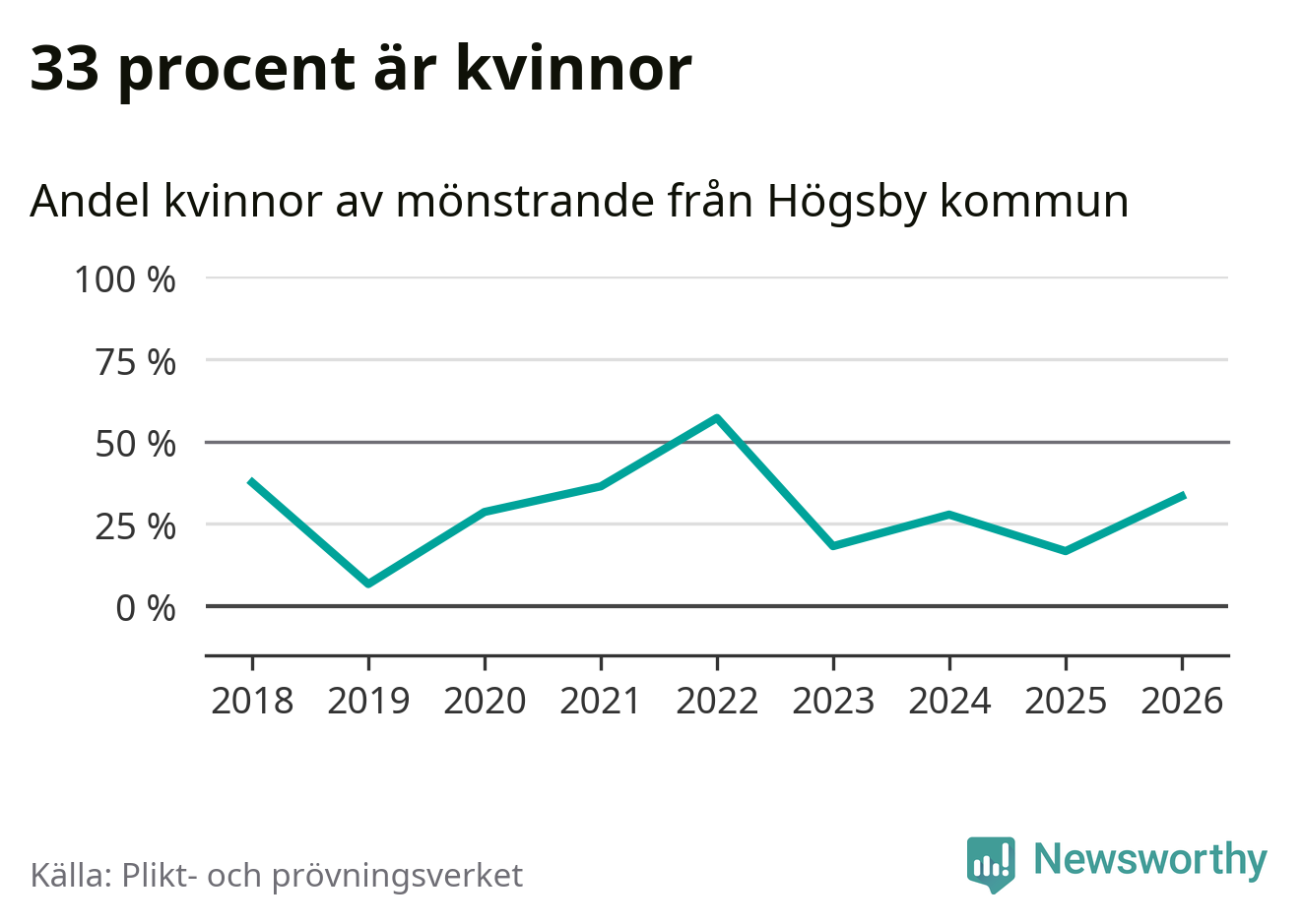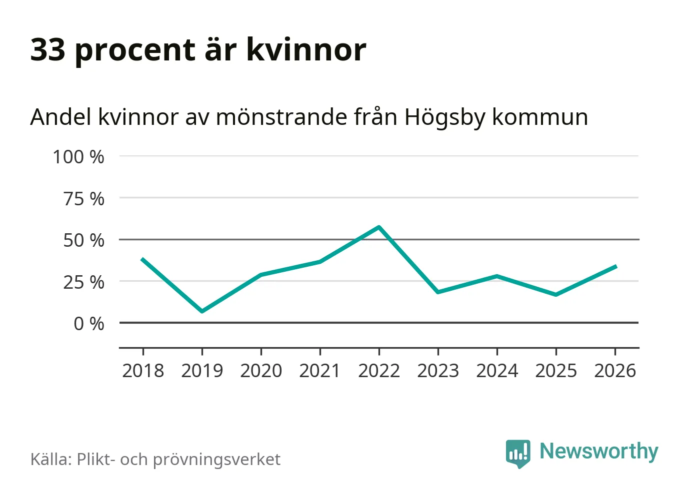 Fem av de som kallats till mönstring från Högsby är kvinnor, vilket motsvarar 33 procent av de mönstrande. I absoluta tal är det fler kvinnor än något år sedan värnplikten återinfördes, men 2022 var en större andel av de mönstrande från kommunen kvinnor (57 procent). I riket som helhet är 28 procent av de mönstrande tjejer.