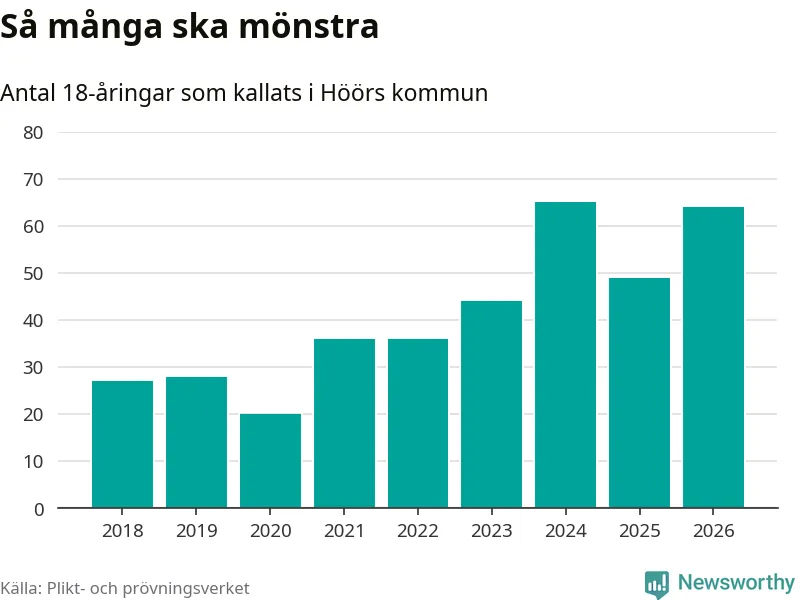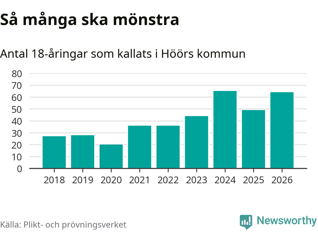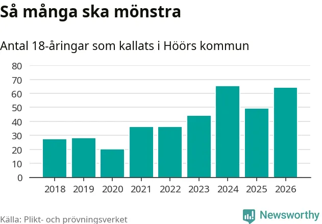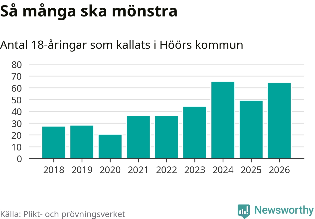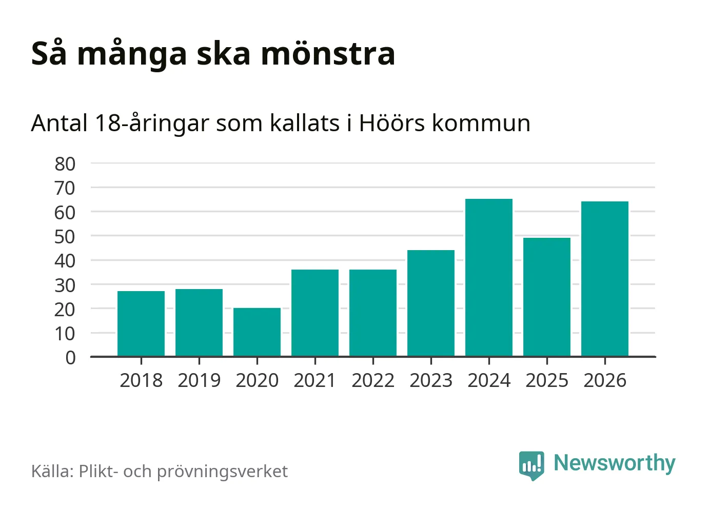 Nu kallas omkring 30 000 svenskar födda 2008 till mönstring. Och 64 av dem kommer från Höör, enligt ny statistik från Plikt- och prövningsverket. Det innebär att mer än var fjärde invånare i åldersgruppen i kommunen kallas till mönstring. Det är en högre andel än i Skåne totalt. I riket som helhet kallas nästan var fjärde person i årskullen.