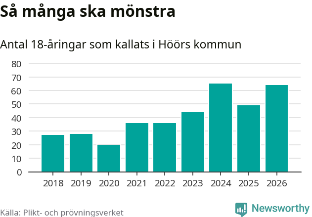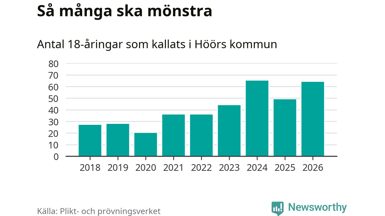 64 personer är 15 fler än 2025. Som mest har 65 personer från en årskull kommunen mönstrat (2024). Totalt från Skåne län kallas 3 778 personer i år.