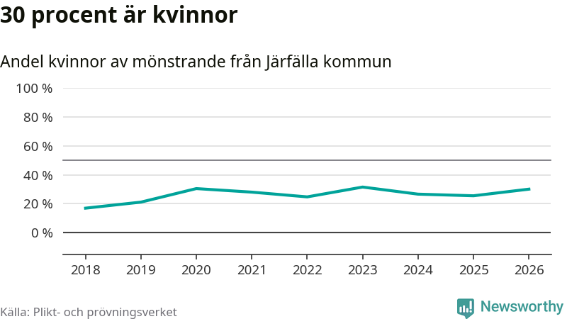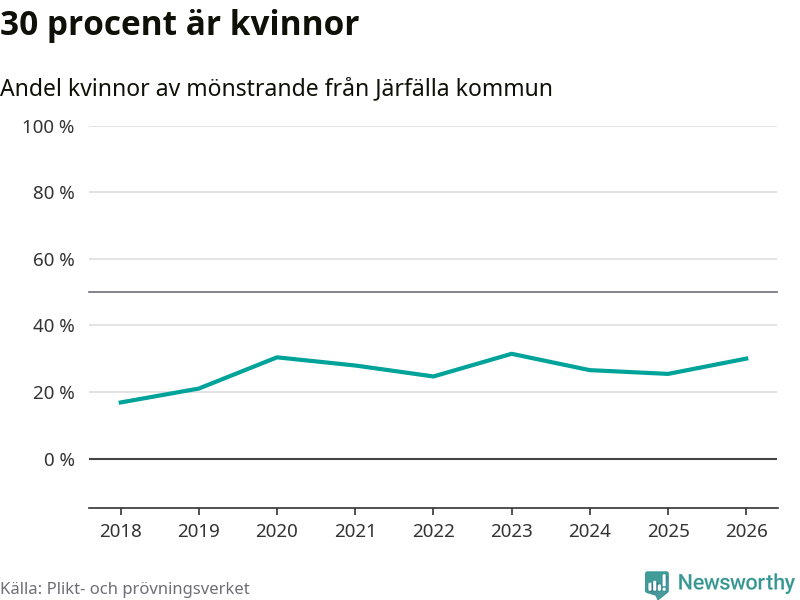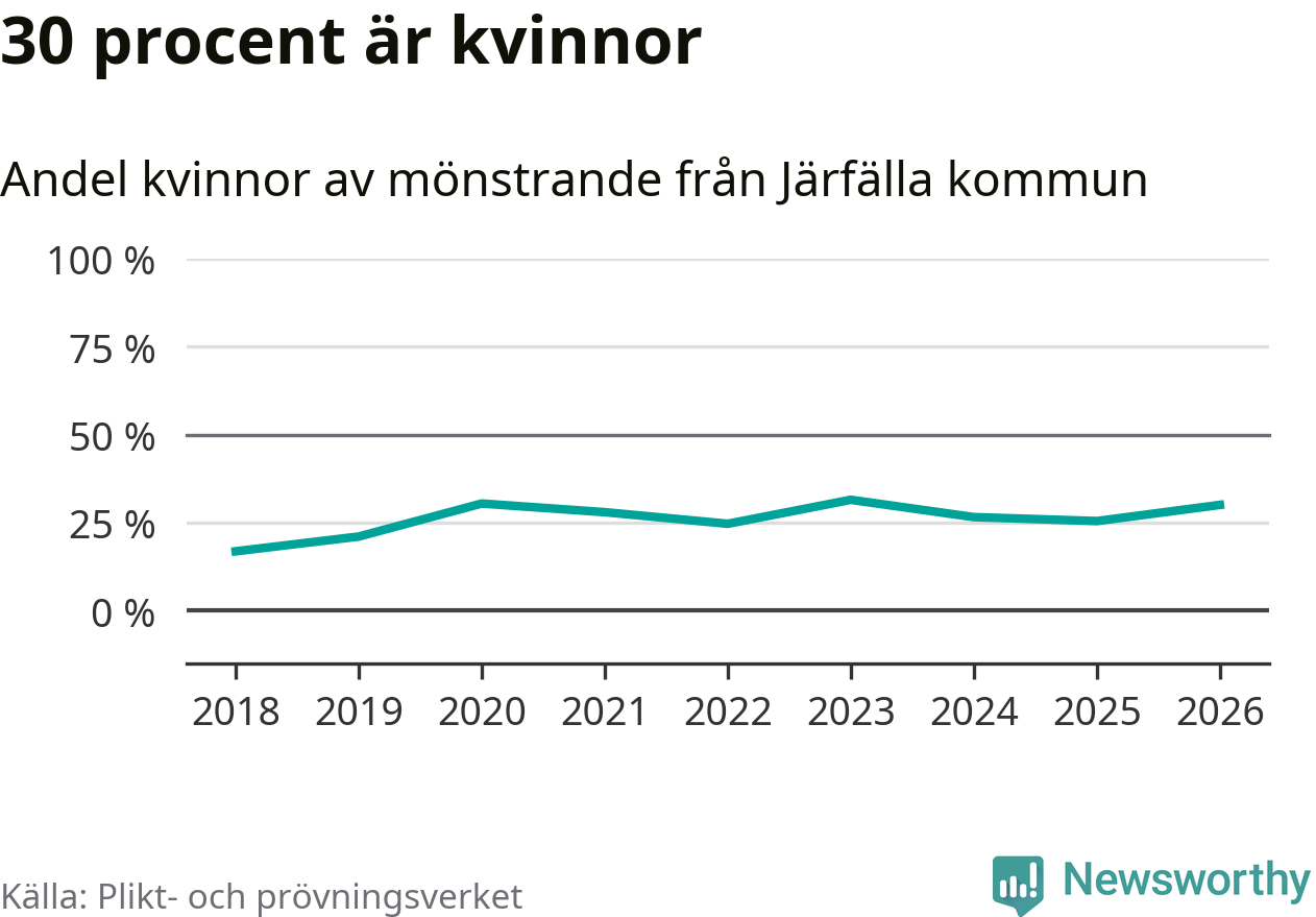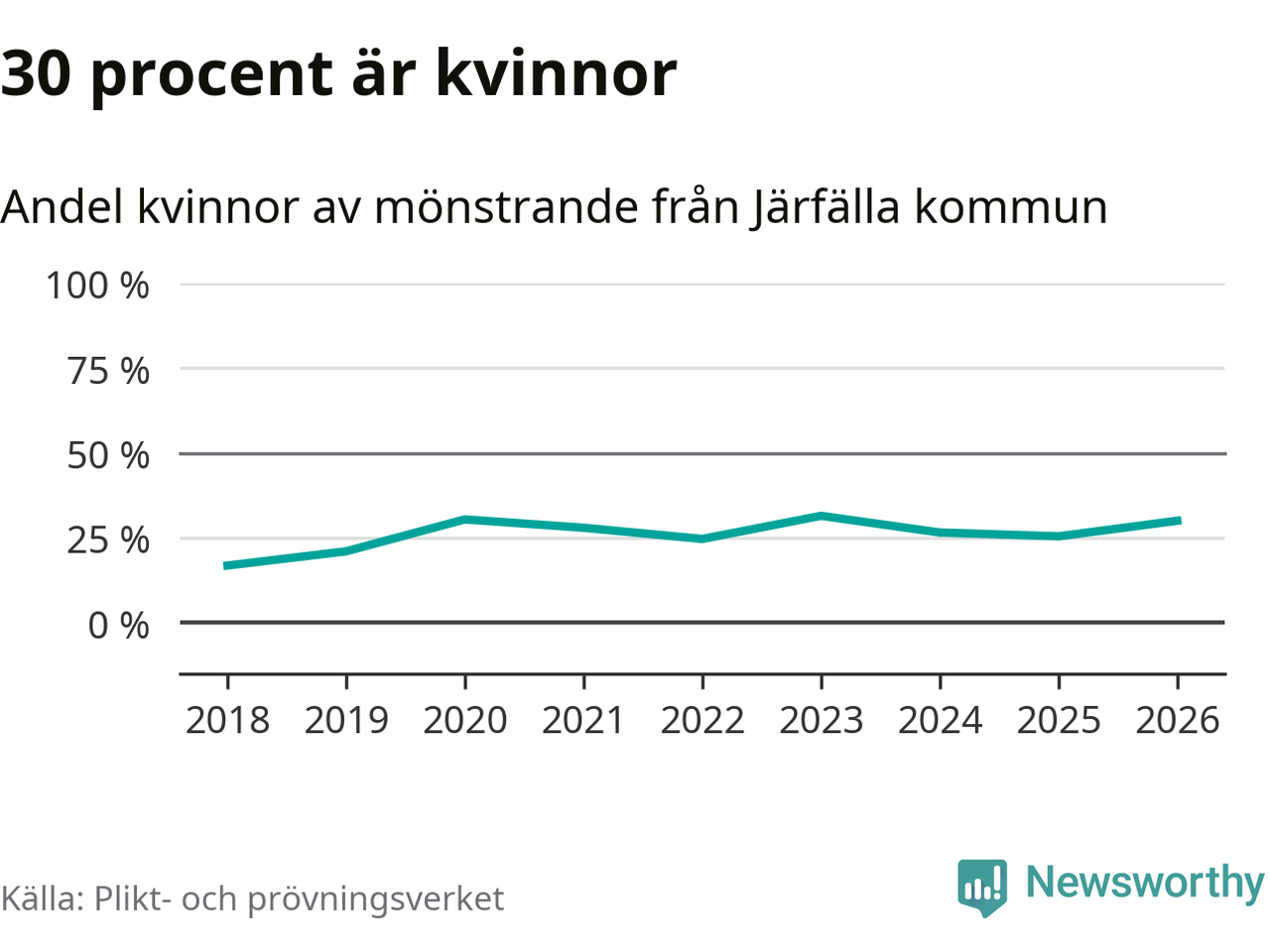 67 av de som kallats till mönstring från Järfälla är kvinnor, vilket motsvarar 30 procent av de mönstrande. I absoluta tal är det fler kvinnor än något år sedan värnplikten återinfördes, men 2023 var en större andel av de mönstrande från kommunen kvinnor (31 procent). I riket som helhet är 28 procent av de mönstrande tjejer.