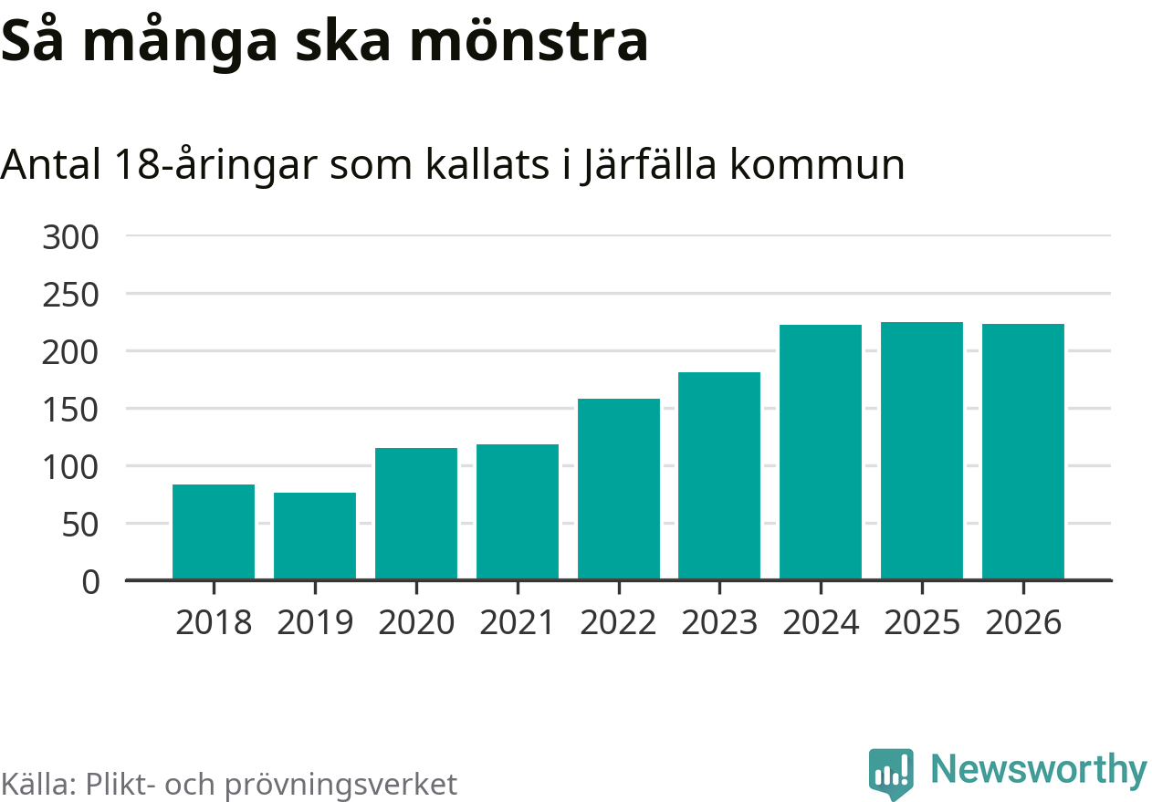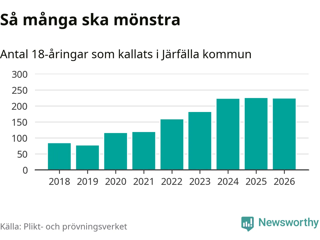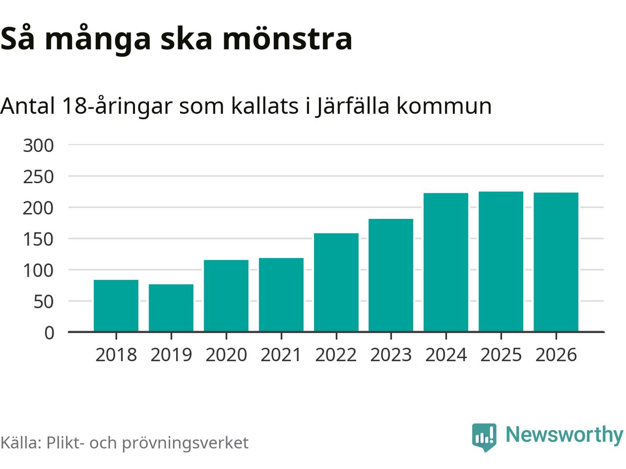 Nu kallas omkring 30 000 svenskar födda 2008 till mönstring. Och 223 av dem kommer från Järfälla, enligt ny statistik från Plikt- och prövningsverket. Det innebär att var femte invånare i åldersgruppen i kommunen kallas till mönstring. Det är en lägre andel än i Stockholms län totalt. I riket som helhet kallas nästan var fjärde person i årskullen.