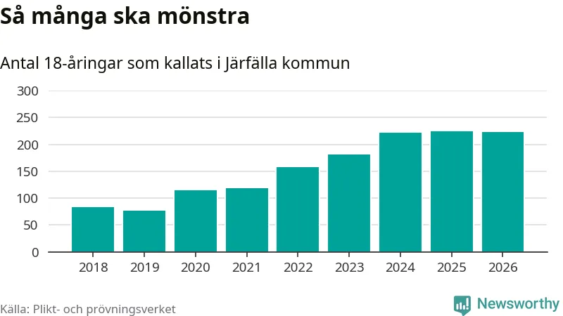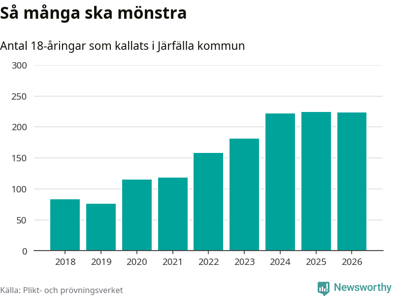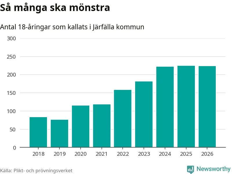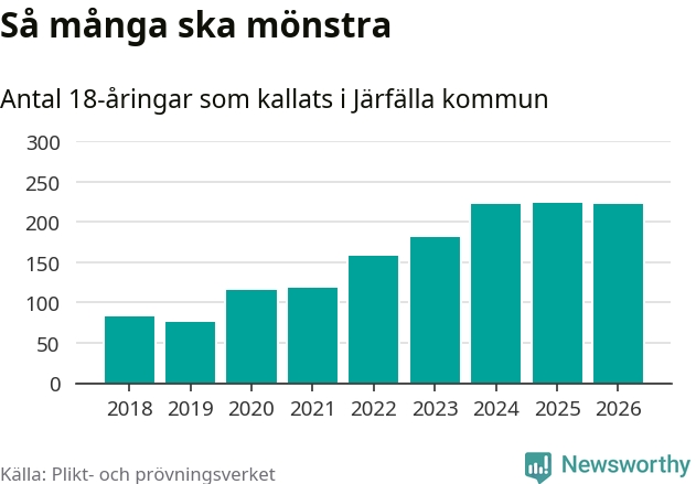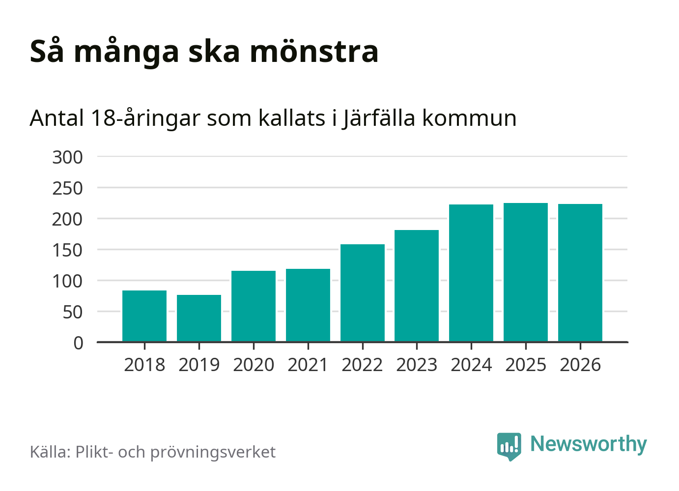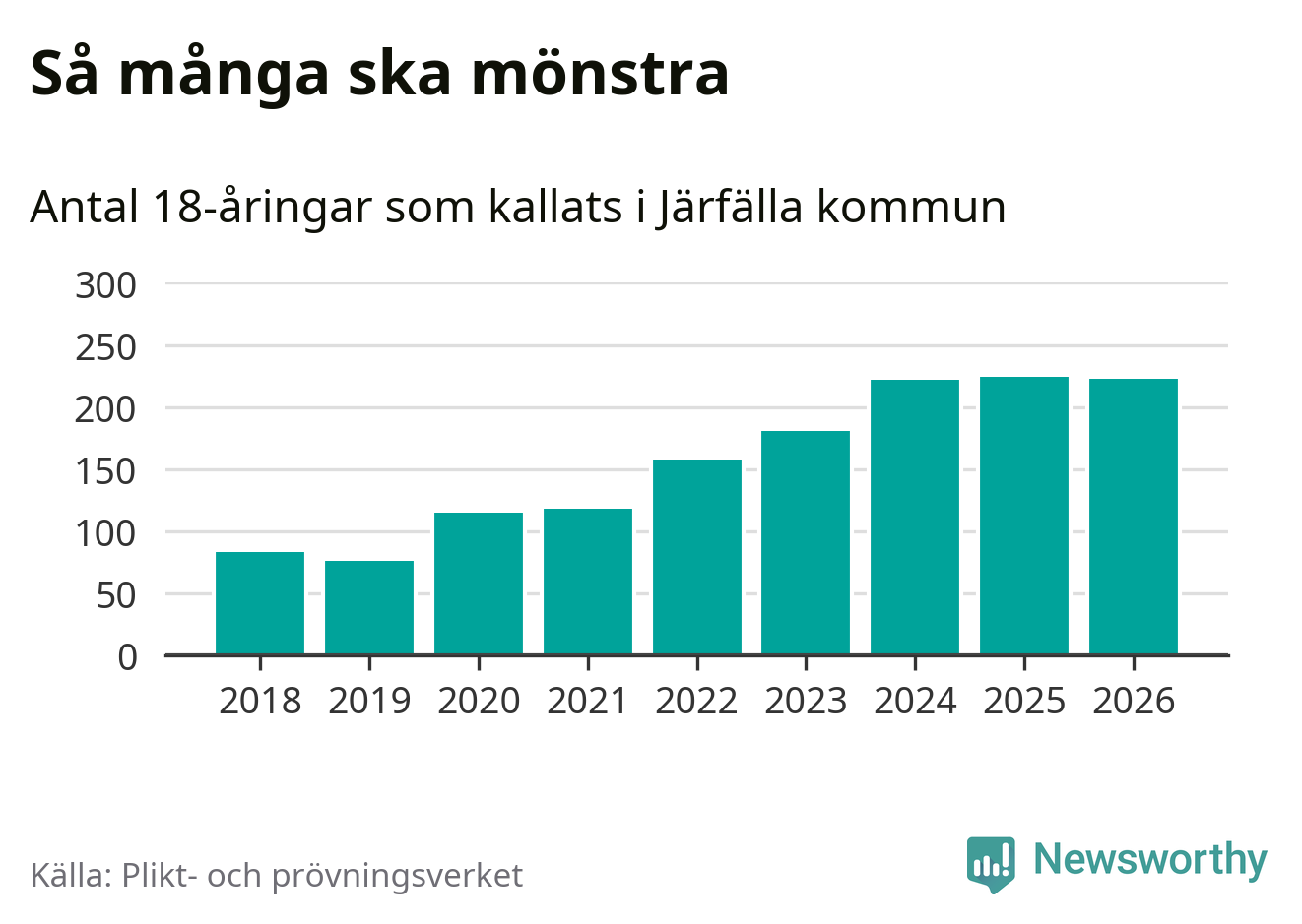 Nu kallas omkring 30 000 svenskar födda 2008 till mönstring. Och 223 av dem kommer från Järfälla, enligt ny statistik från Plikt- och prövningsverket. Det innebär att var femte invånare i åldersgruppen i kommunen kallas till mönstring. Det är en lägre andel än i Stockholms län totalt. I riket som helhet kallas nästan var fjärde person i årskullen.