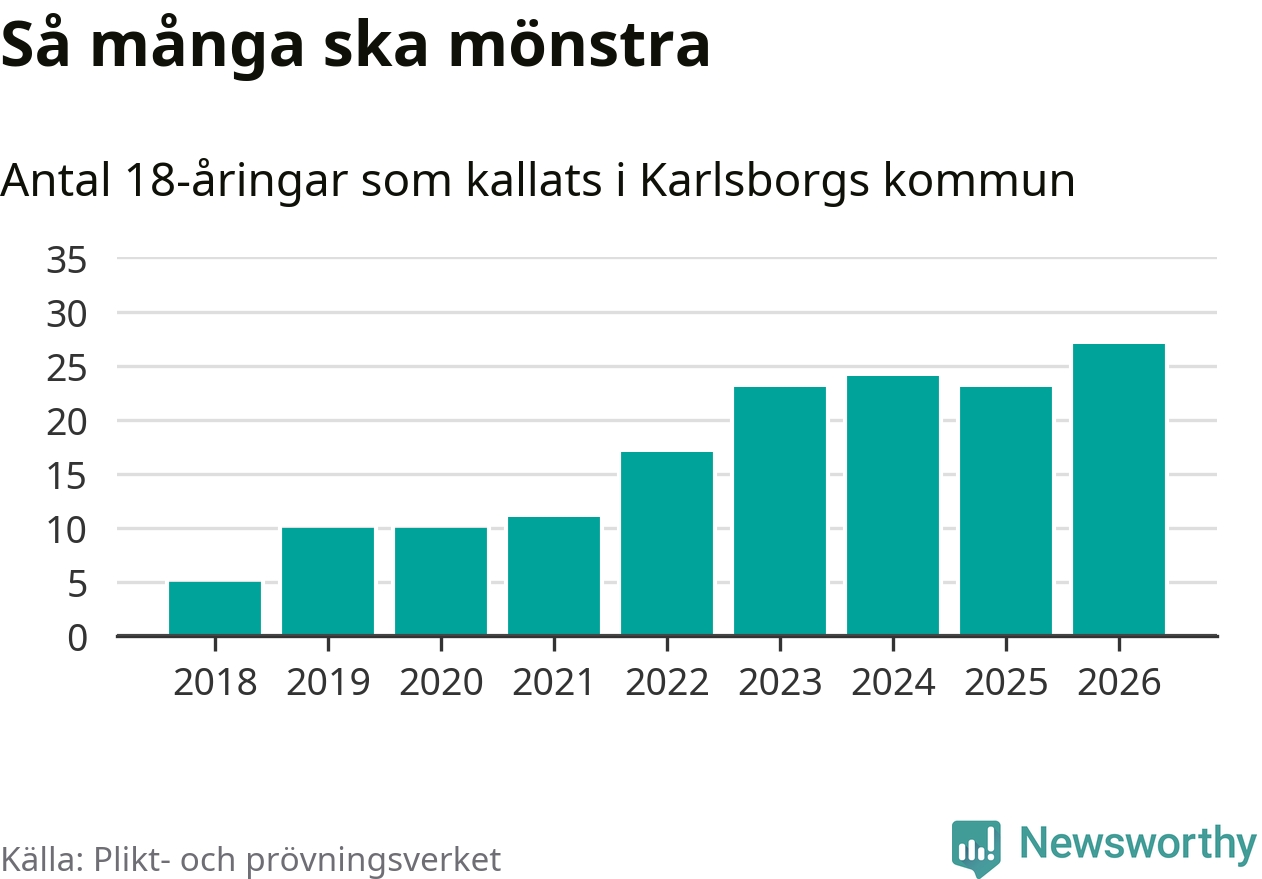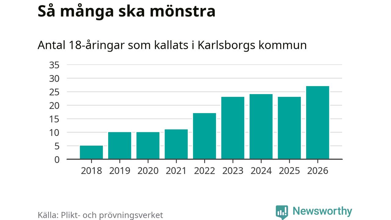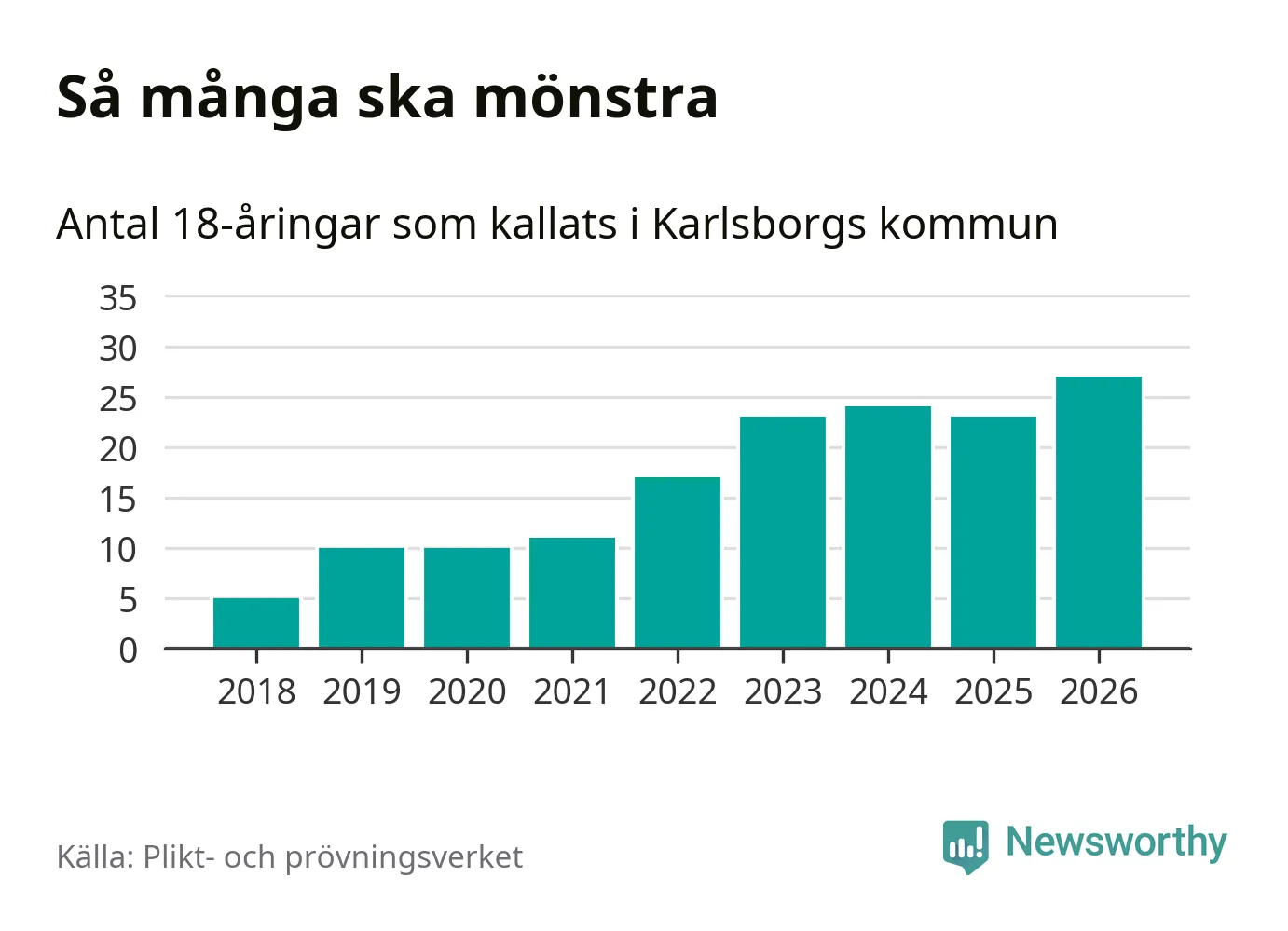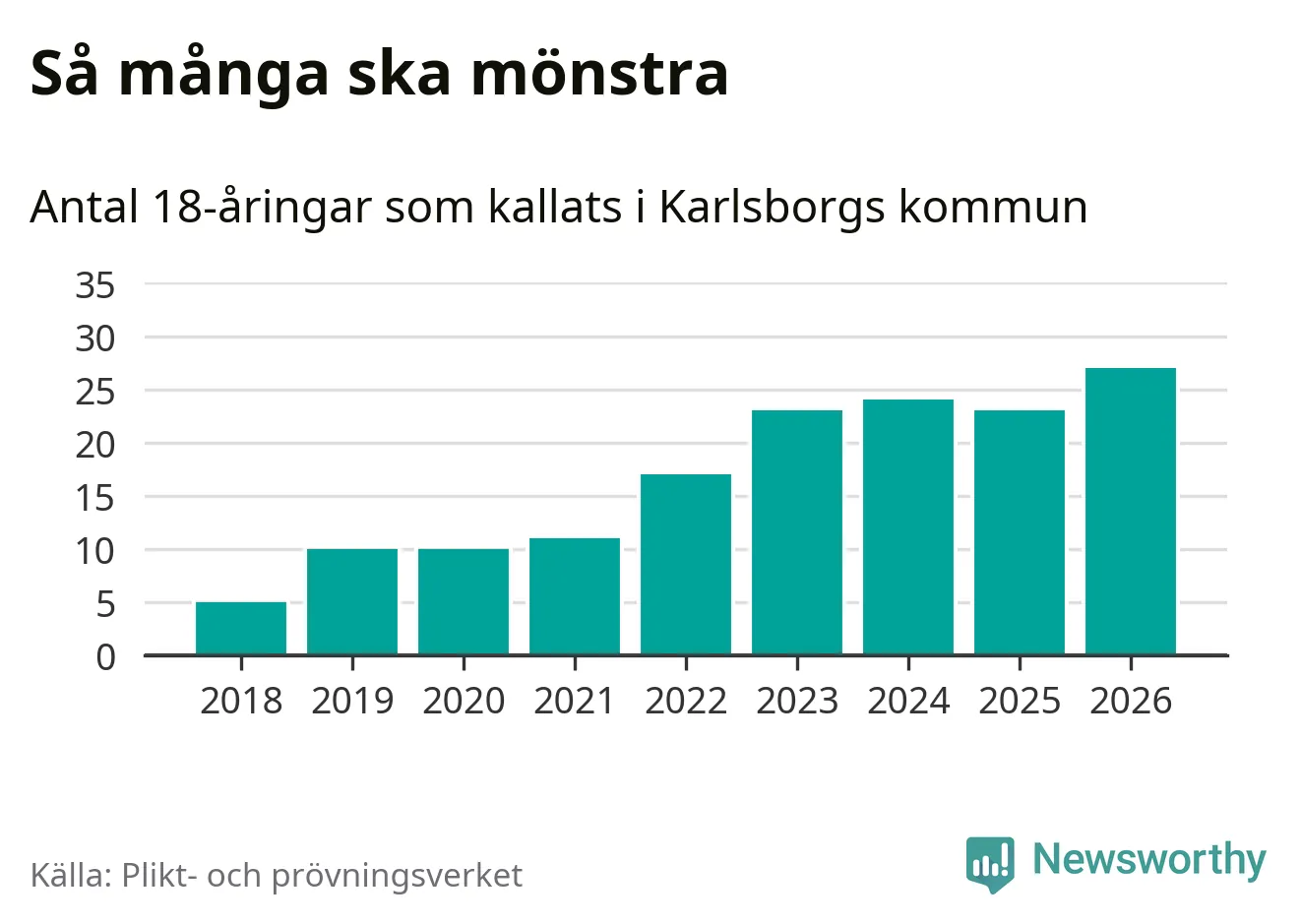 27 personer är det högsta antalet kallade i Karlsborg sedan 2018, som är första året med statistik på kommunnivå (värnplikten återinfördes 2017), och fyra mönstrande fler än 2025. Totalt från Västra Götalands län kallas 4 609 personer i år.