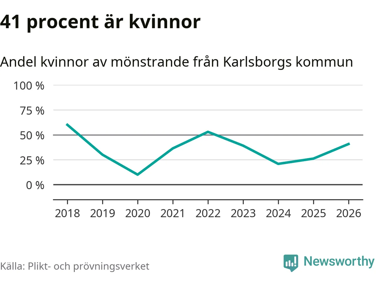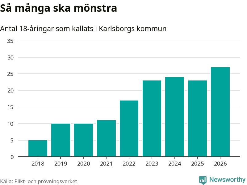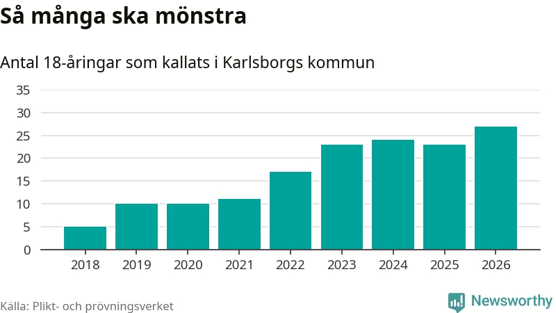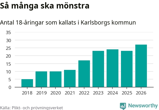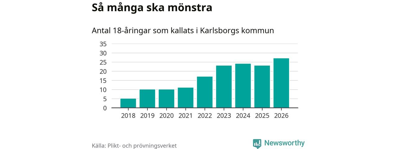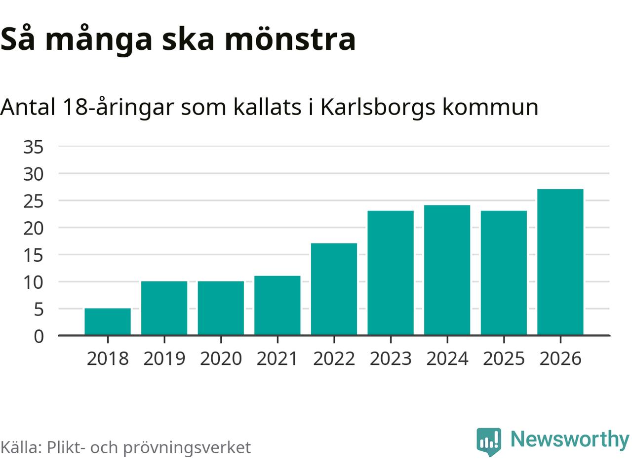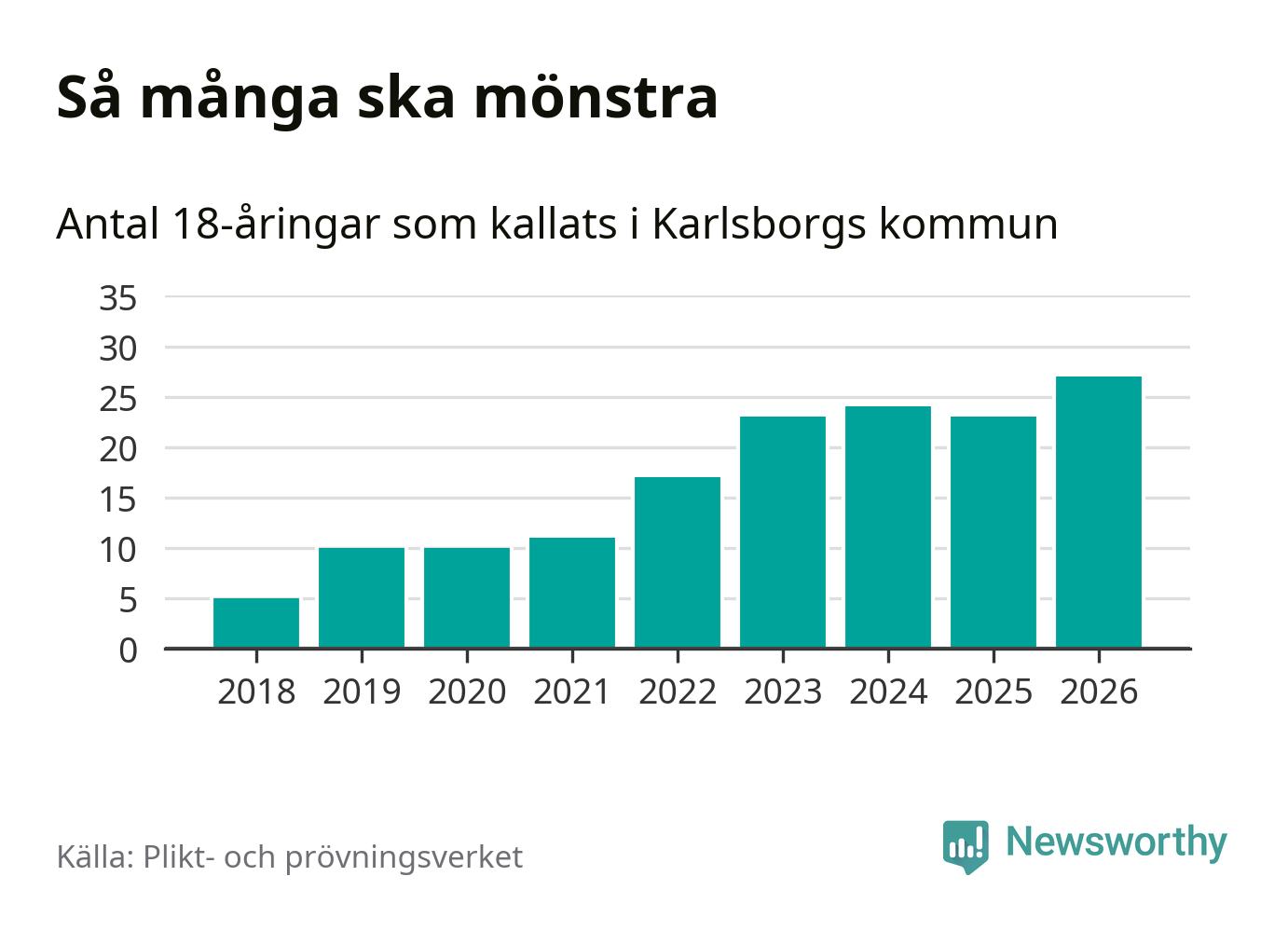 27 personer är det högsta antalet kallade i Karlsborg sedan 2018, som är första året med statistik på kommunnivå (värnplikten återinfördes 2017), och fyra mönstrande fler än 2025. Totalt från Västra Götalands län kallas 4 609 personer i år.