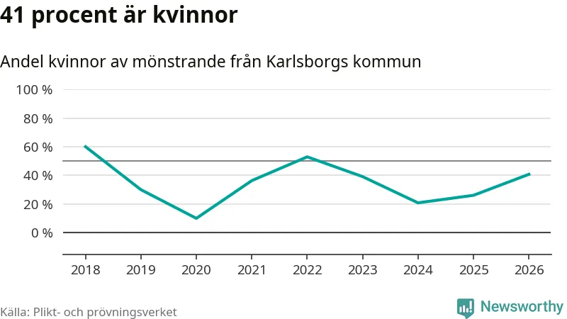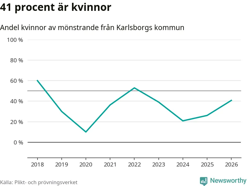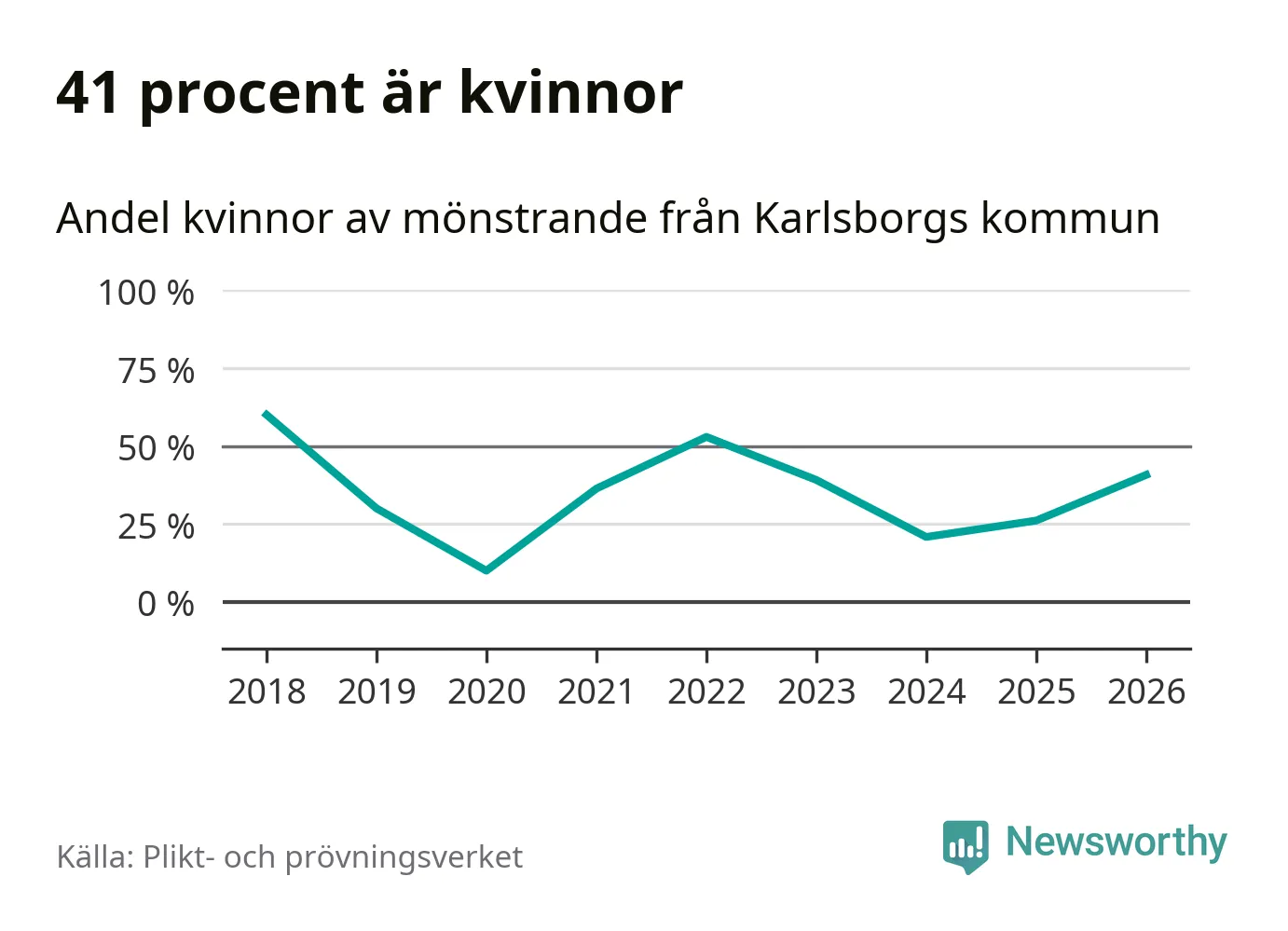 Elva av de som kallats till mönstring från Karlsborg är kvinnor, vilket motsvarar 41 procent av de mönstrande. I absoluta tal är det fler kvinnor än något år sedan värnplikten återinfördes, men 2018 var en större andel av de mönstrande från kommunen kvinnor (60 procent). I riket som helhet är 28 procent av de mönstrande tjejer.