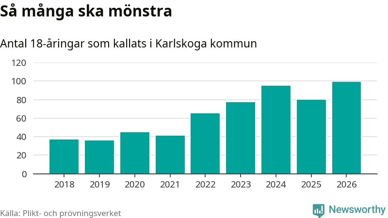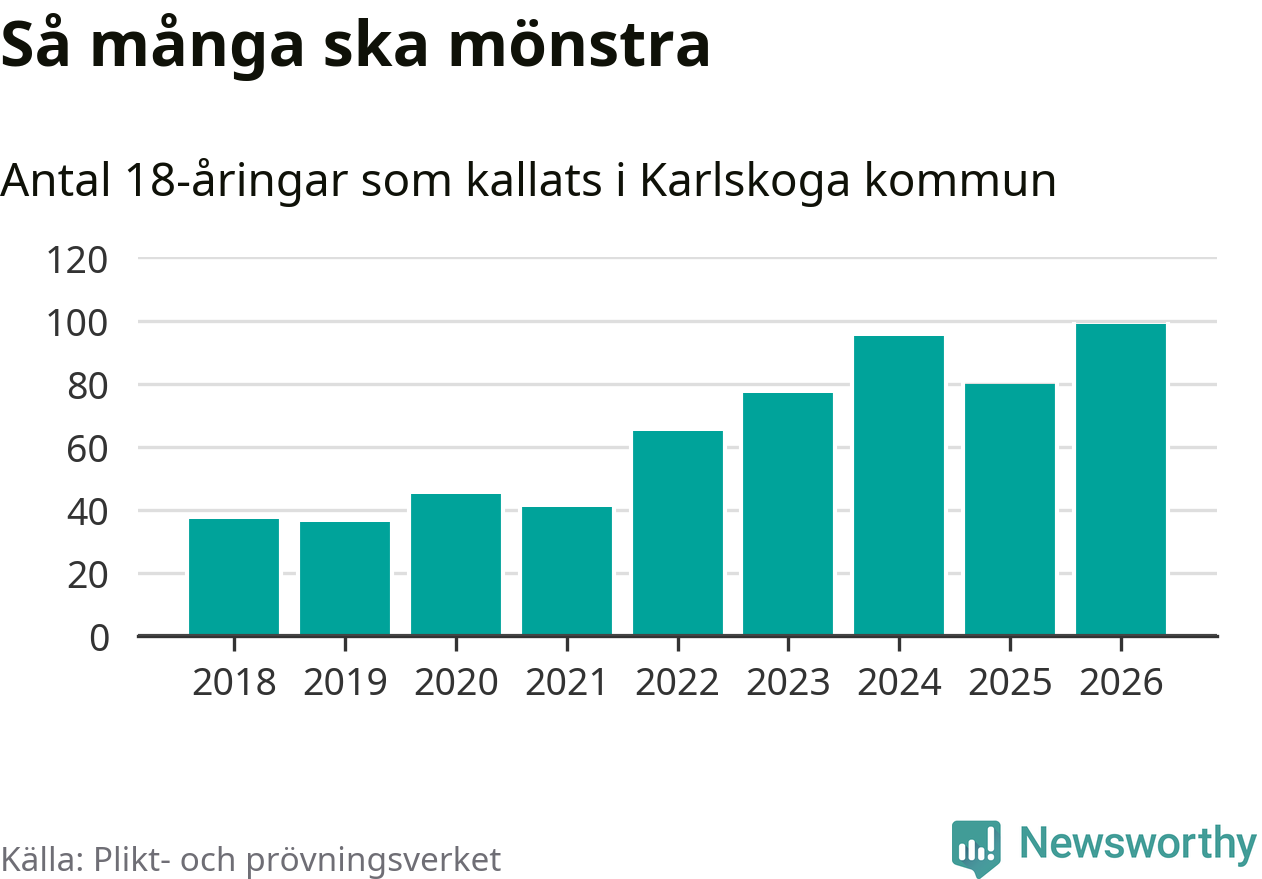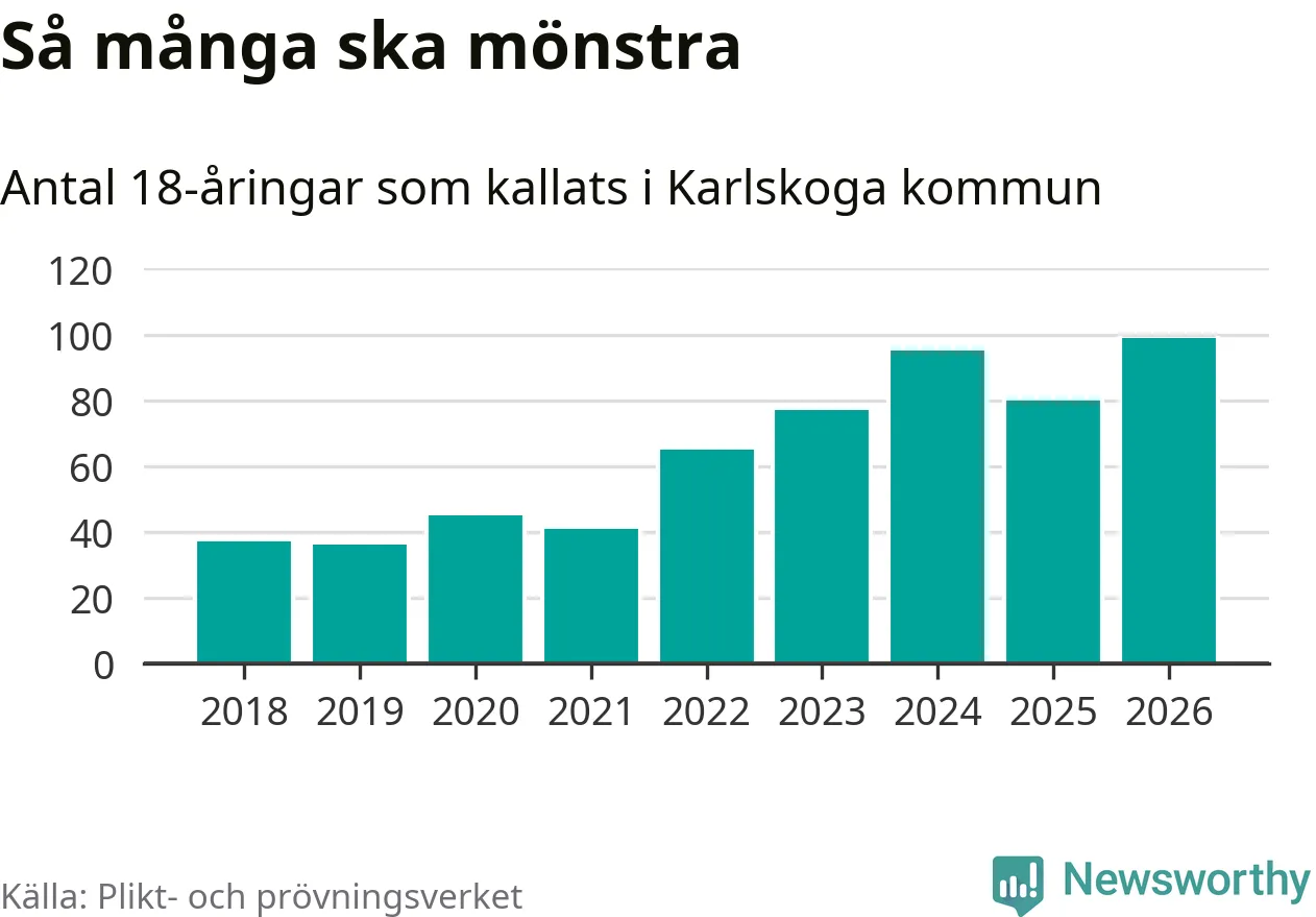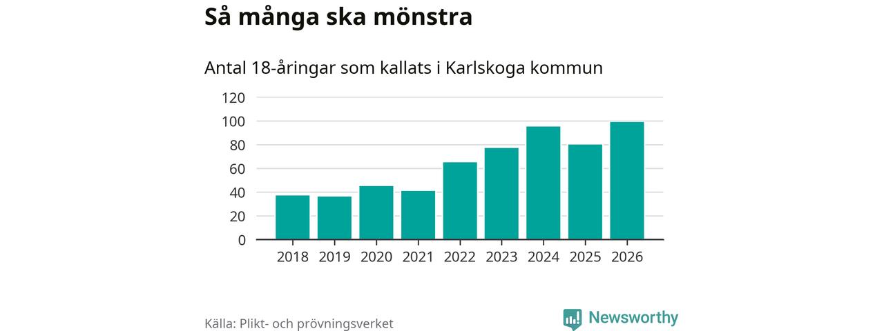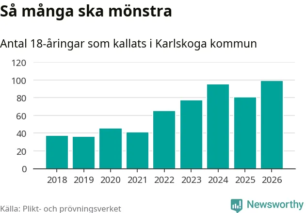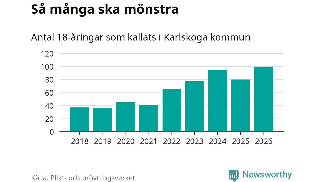 99 personer är det högsta antalet kallade i Karlskoga sedan 2018, som är första året med statistik på kommunnivå (värnplikten återinfördes 2017), och 19 mönstrande fler än 2025. Totalt från Örebro län kallas 850 personer i år.