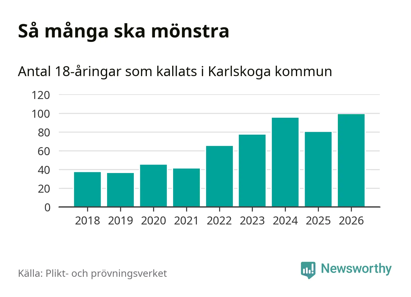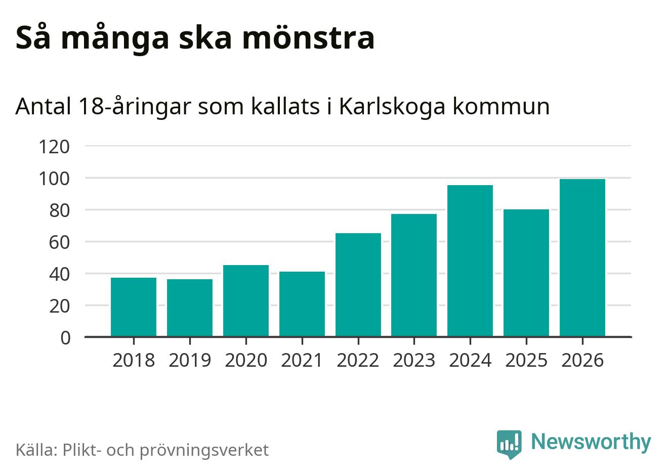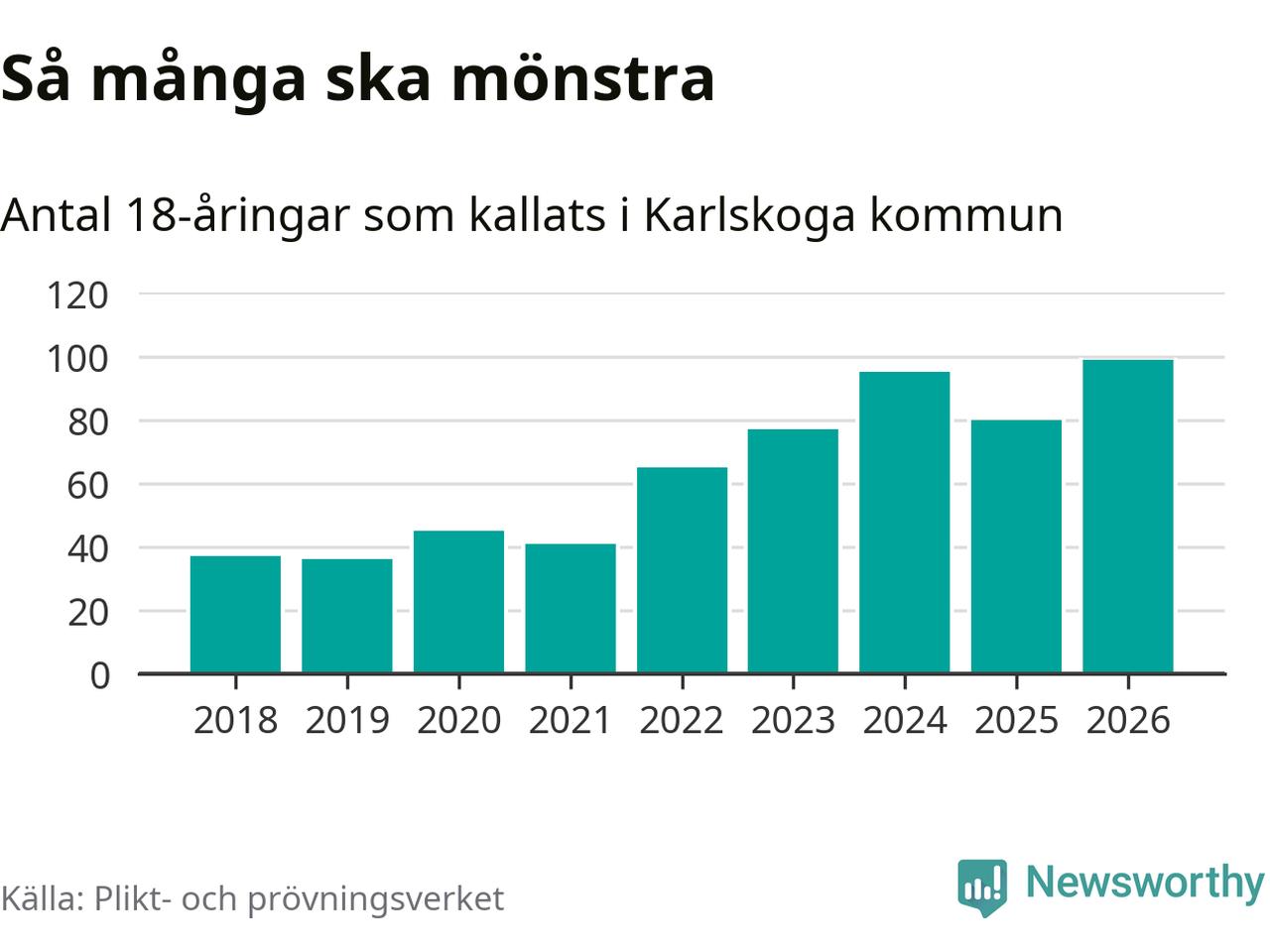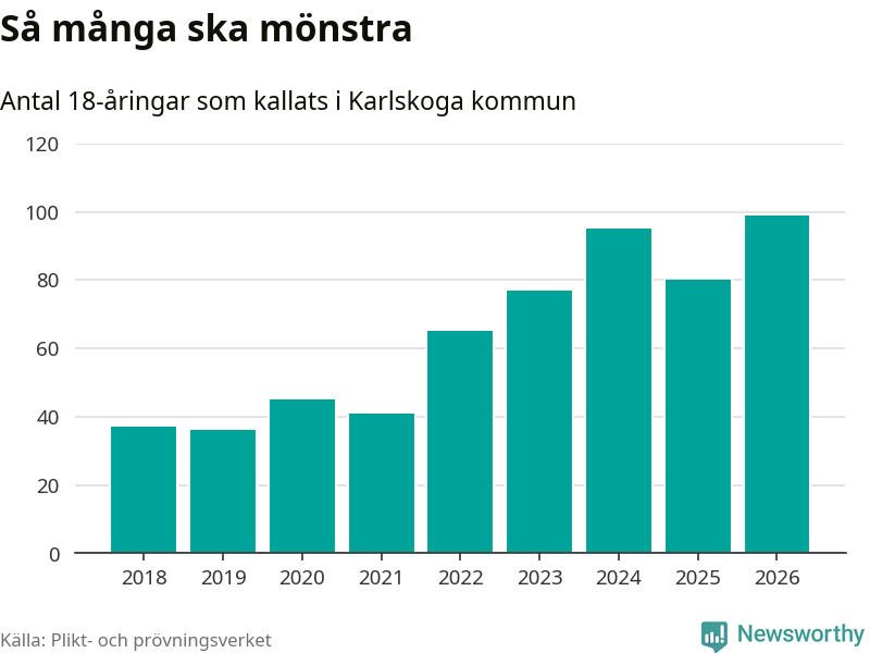 99 personer är det högsta antalet kallade i Karlskoga sedan 2018, som är första året med statistik på kommunnivå (värnplikten återinfördes 2017), och 19 mönstrande fler än 2025. Totalt från Örebro län kallas 850 personer i år.