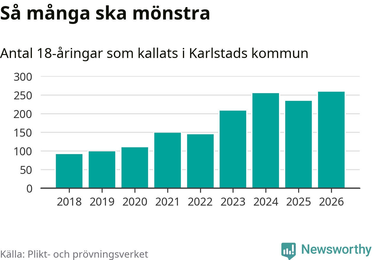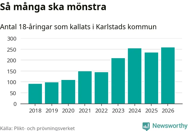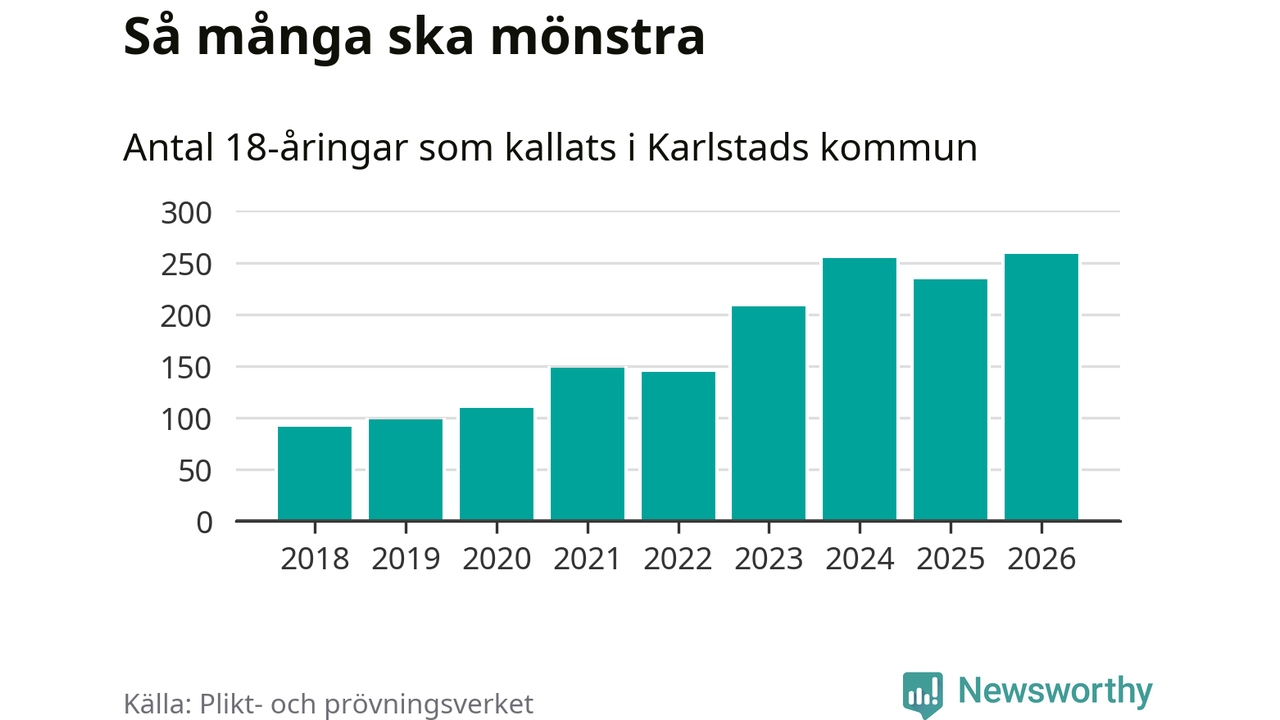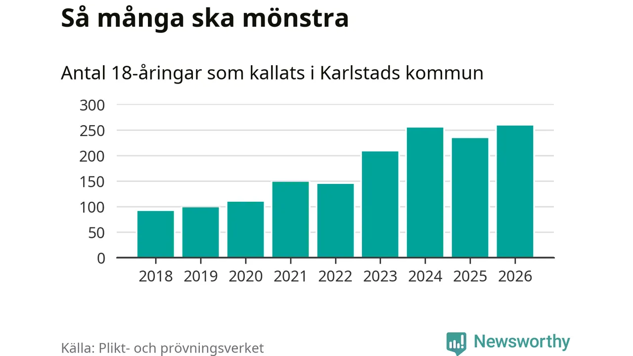 258 personer är det högsta antalet kallade i Karlstad sedan 2018, som är första året med statistik på kommunnivå (värnplikten återinfördes 2017), och 24 mönstrande fler än 2025. Totalt från Värmlands län kallas 730 personer i år.