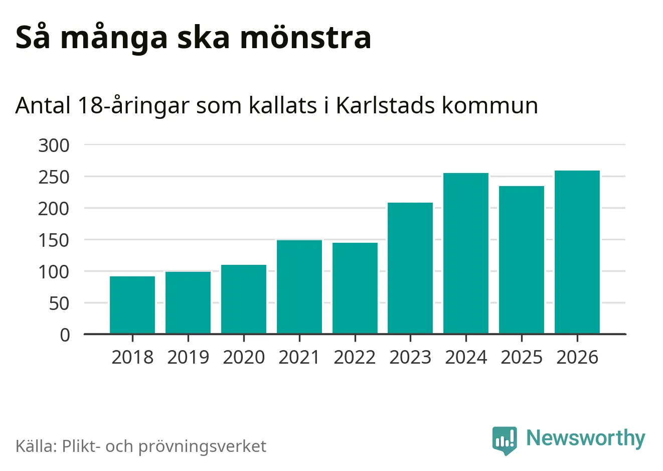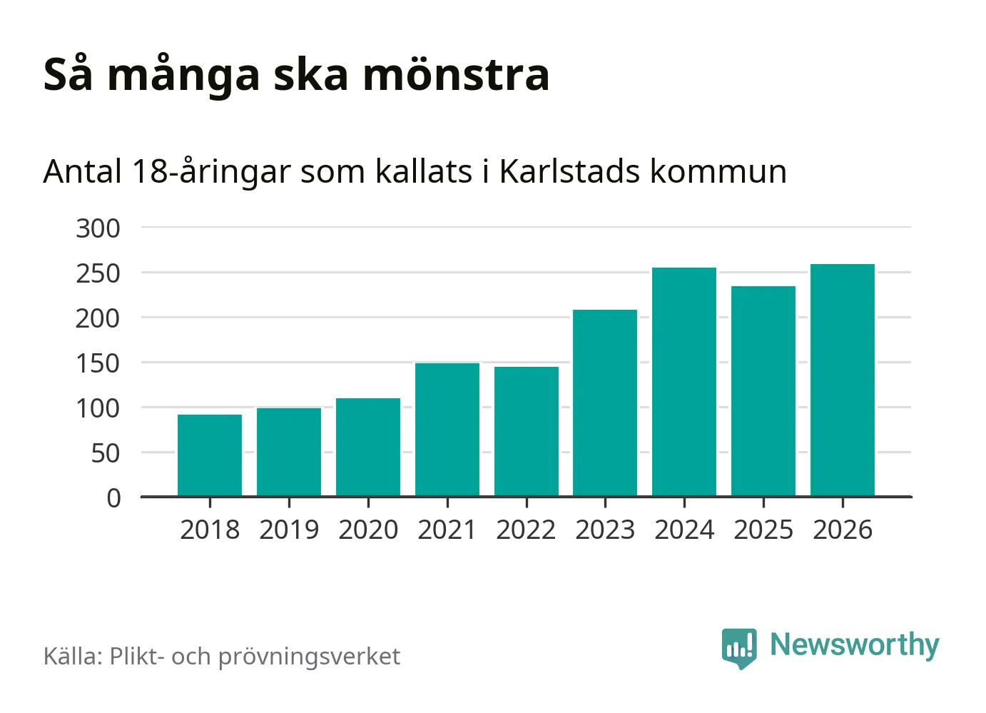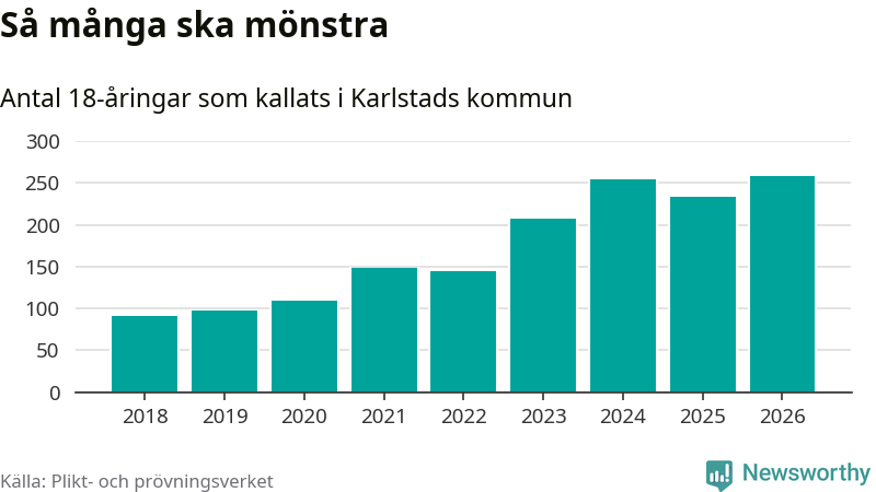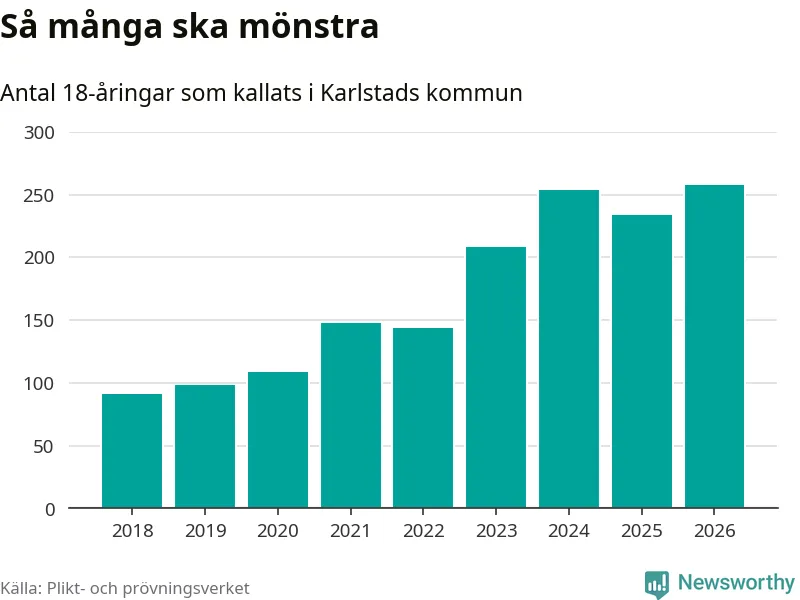 258 personer är det högsta antalet kallade i Karlstad sedan 2018, som är första året med statistik på kommunnivå (värnplikten återinfördes 2017), och 24 mönstrande fler än 2025. Totalt från Värmlands län kallas 730 personer i år.