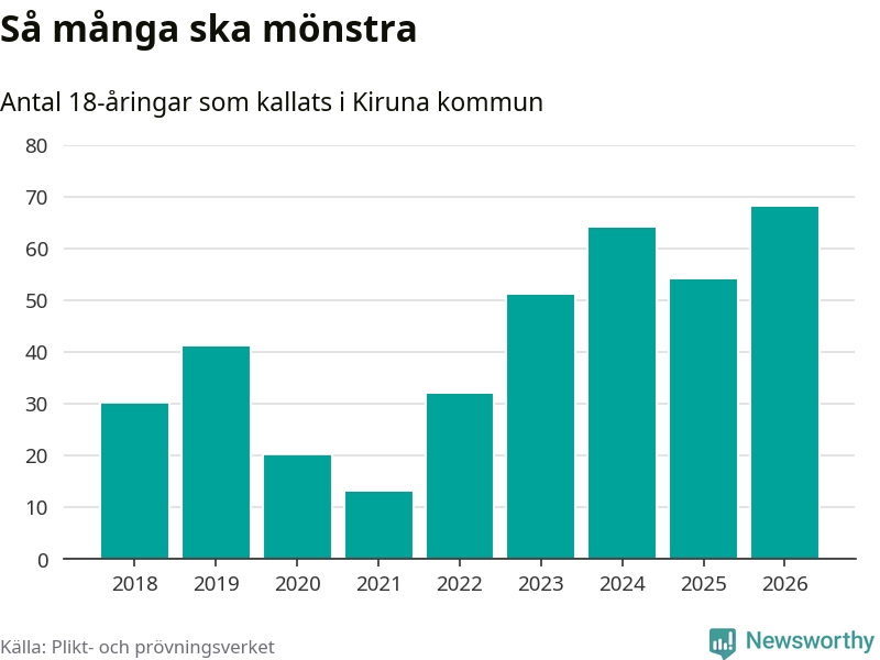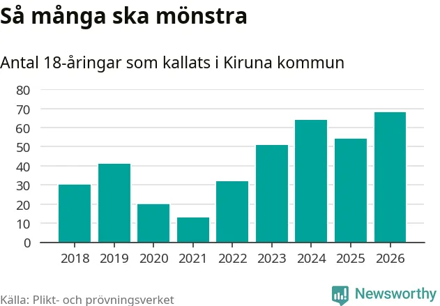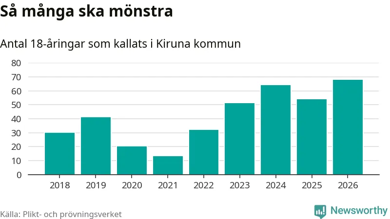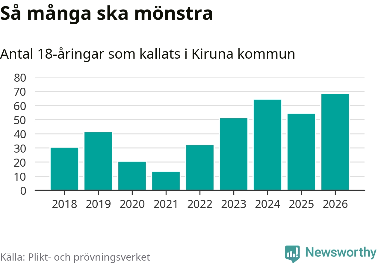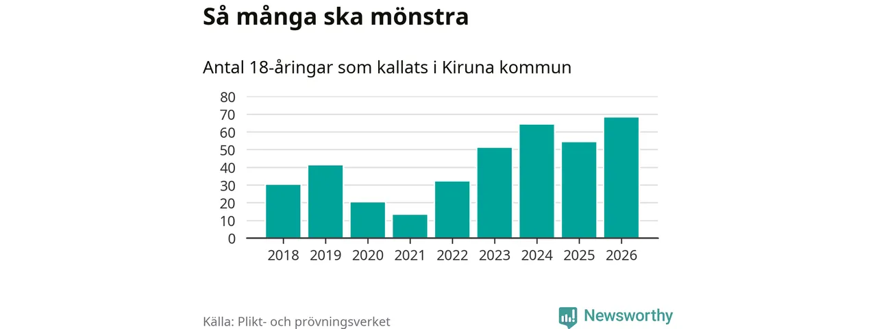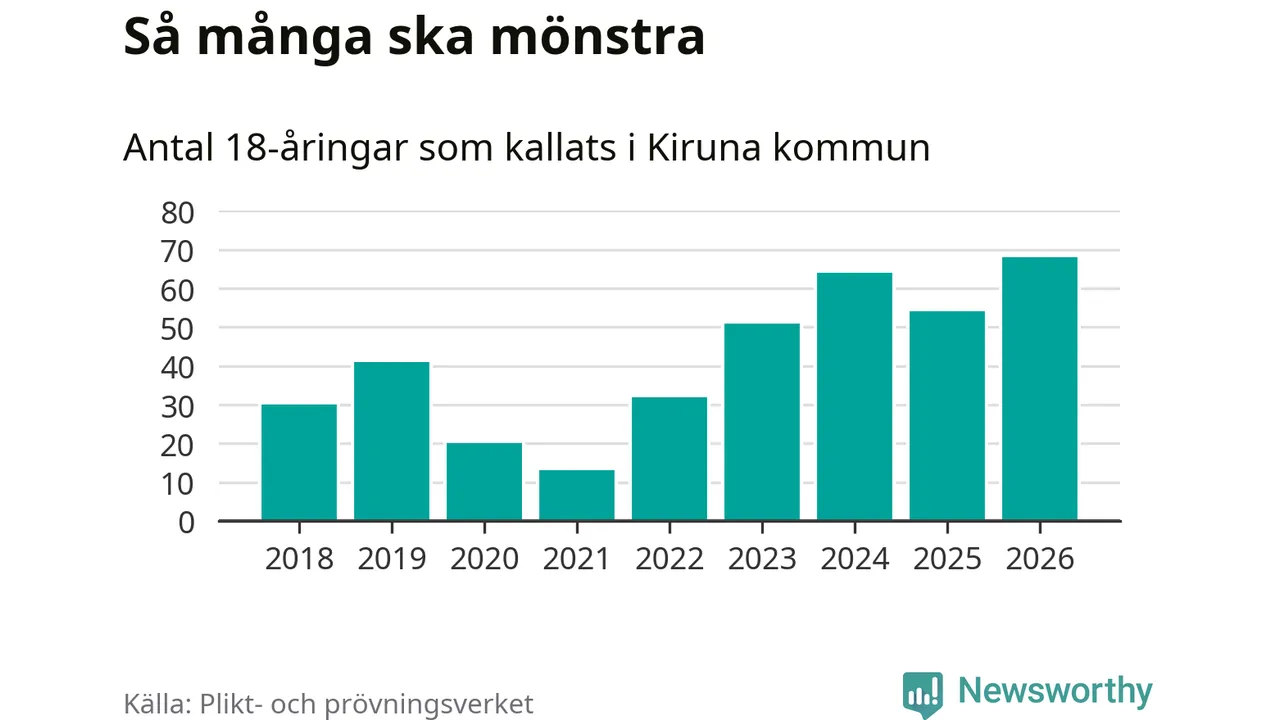 68 personer är det högsta antalet kallade i Kiruna sedan 2018, som är första året med statistik på kommunnivå (värnplikten återinfördes 2017), och 14 mönstrande fler än 2025. Totalt från Norrbottens län kallas 736 personer i år.