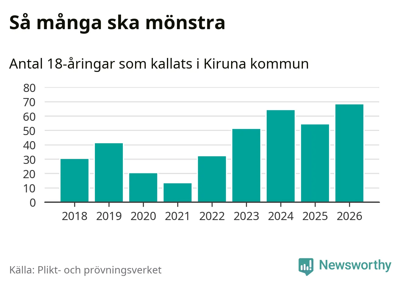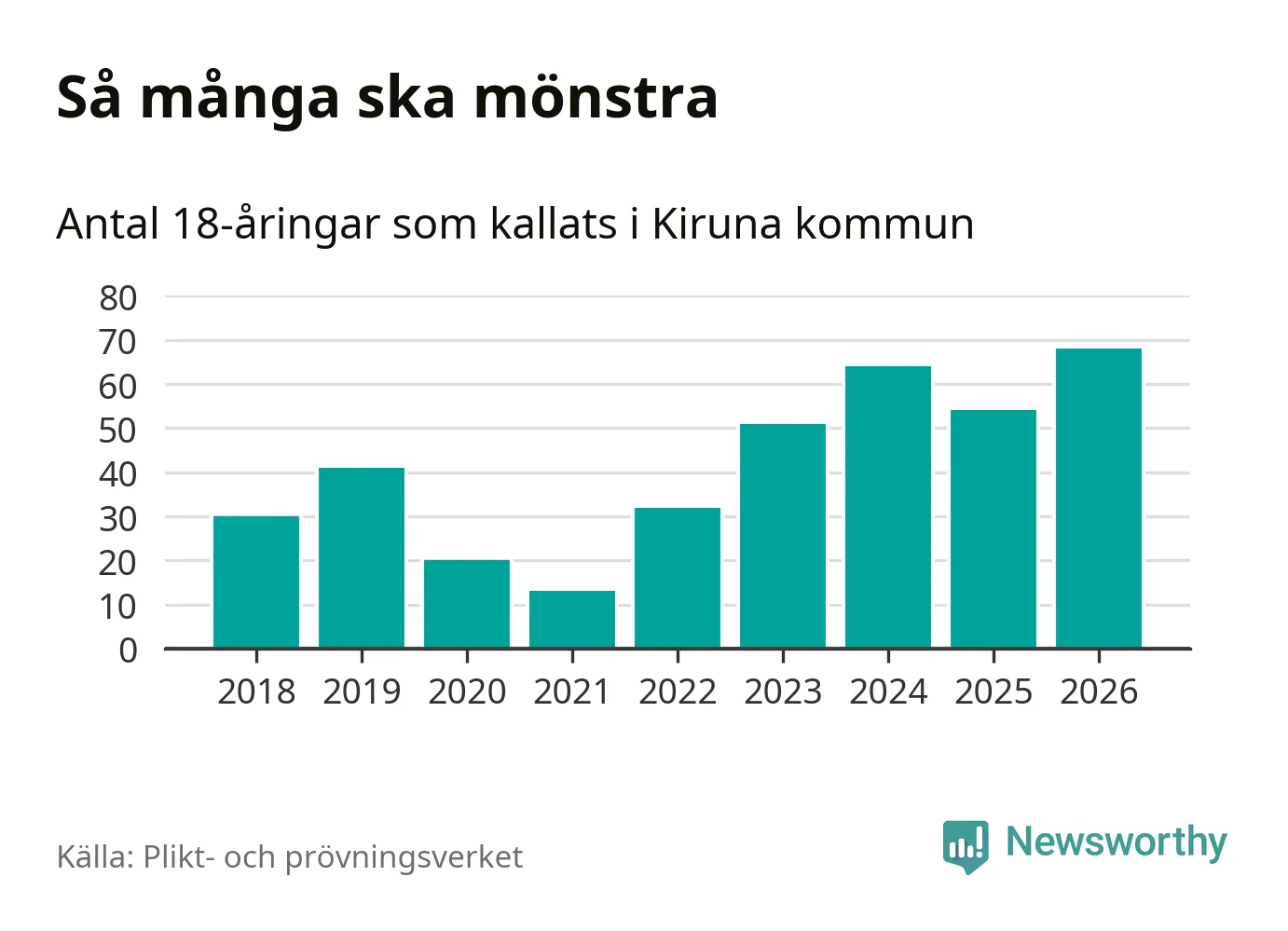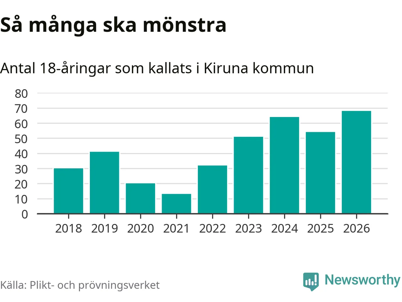 68 personer är det högsta antalet kallade i Kiruna sedan 2018, som är första året med statistik på kommunnivå (värnplikten återinfördes 2017), och 14 mönstrande fler än 2025. Totalt från Norrbottens län kallas 736 personer i år.