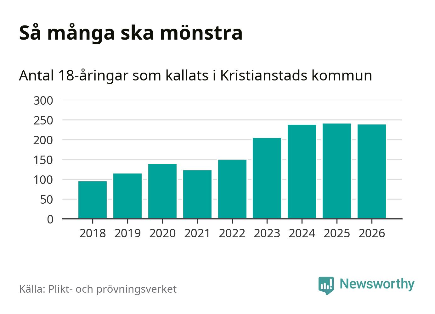 Nu kallas omkring 30 000 svenskar födda 2008 till mönstring. Och 238 av dem kommer från Kristianstad, enligt ny statistik från Plikt- och prövningsverket. Det innebär att nästan var fjärde invånare i åldersgruppen i kommunen kallas till mönstring. Det är ungefär lika stor andel som i Skåne totalt. Även i riket som helhet kallas nästan var fjärde person i årskullen.