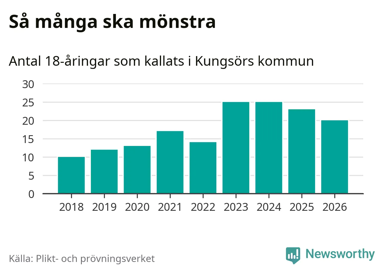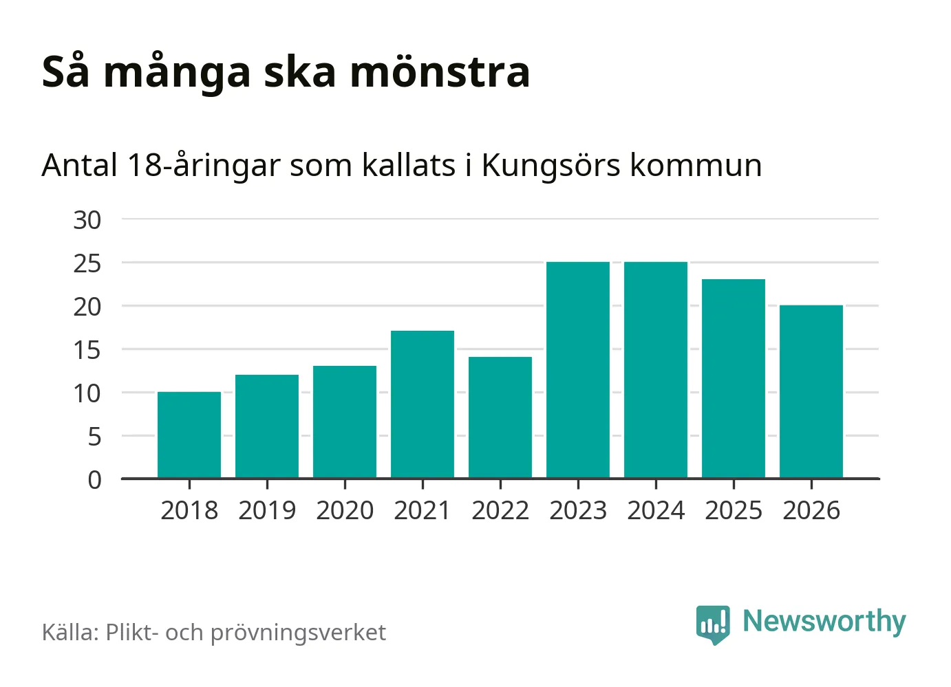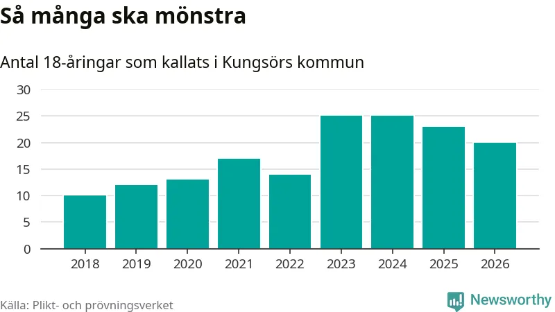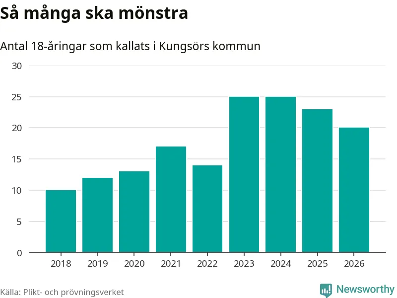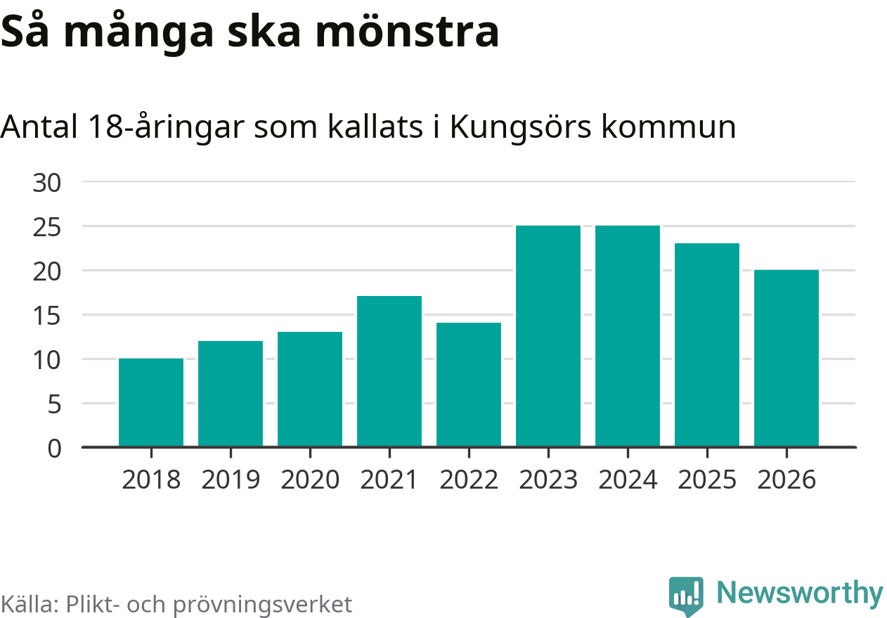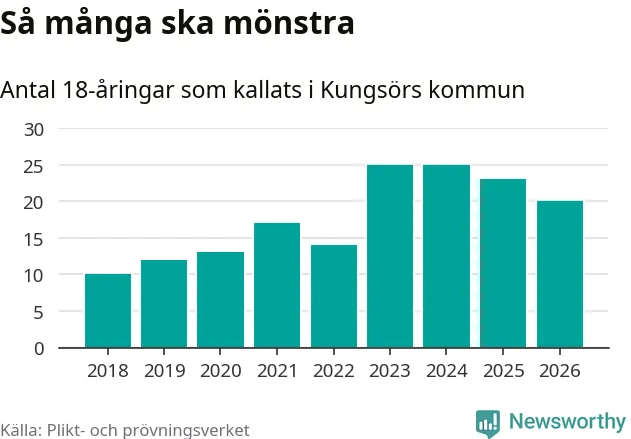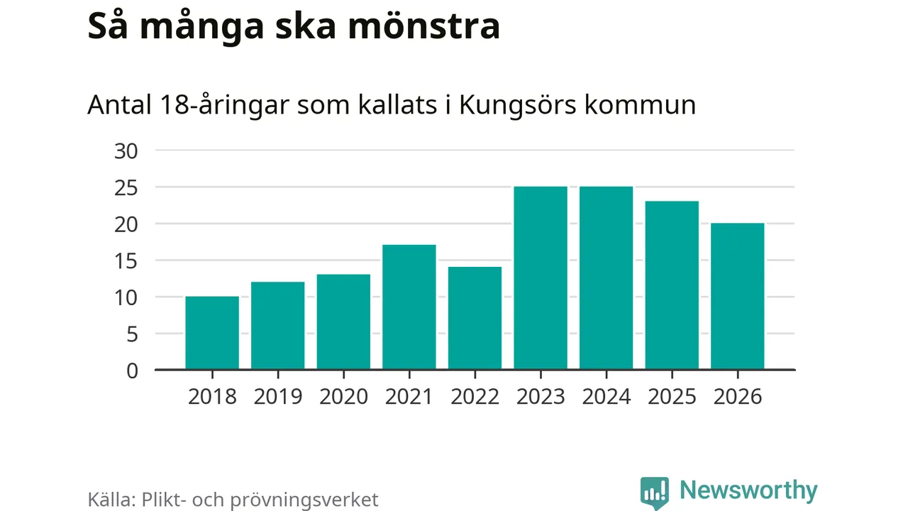 Nu kallas omkring 30 000 svenskar födda 2008 till mönstring. Och 20 av dem kommer från Kungsör, enligt ny statistik från Plikt- och prövningsverket. Det innebär att var femte invånare i åldersgruppen i kommunen kallas till mönstring. Det är en lägre andel än i Västmanland totalt. I riket som helhet kallas nästan var fjärde person i årskullen.