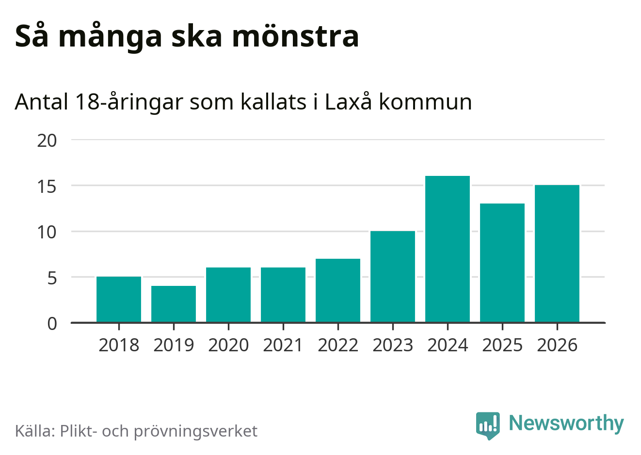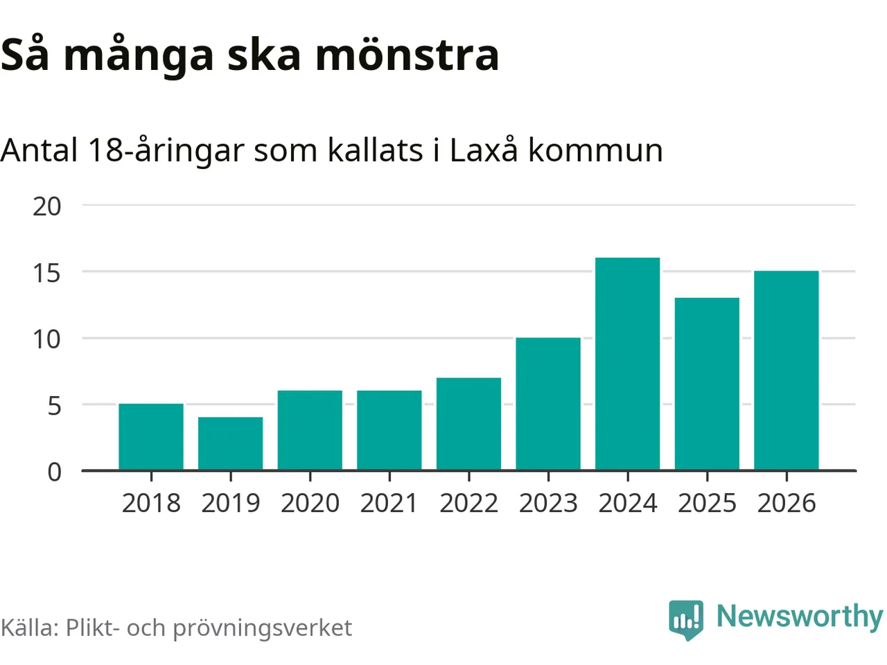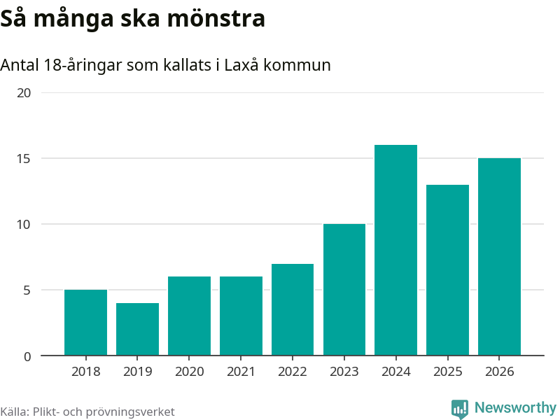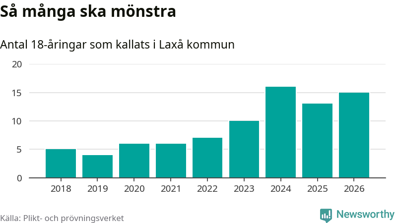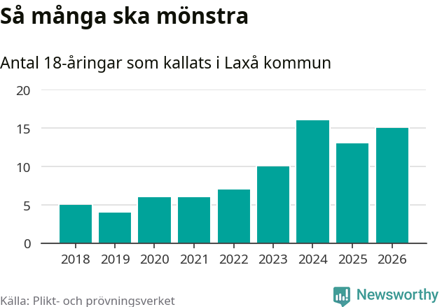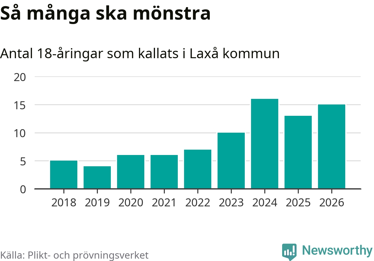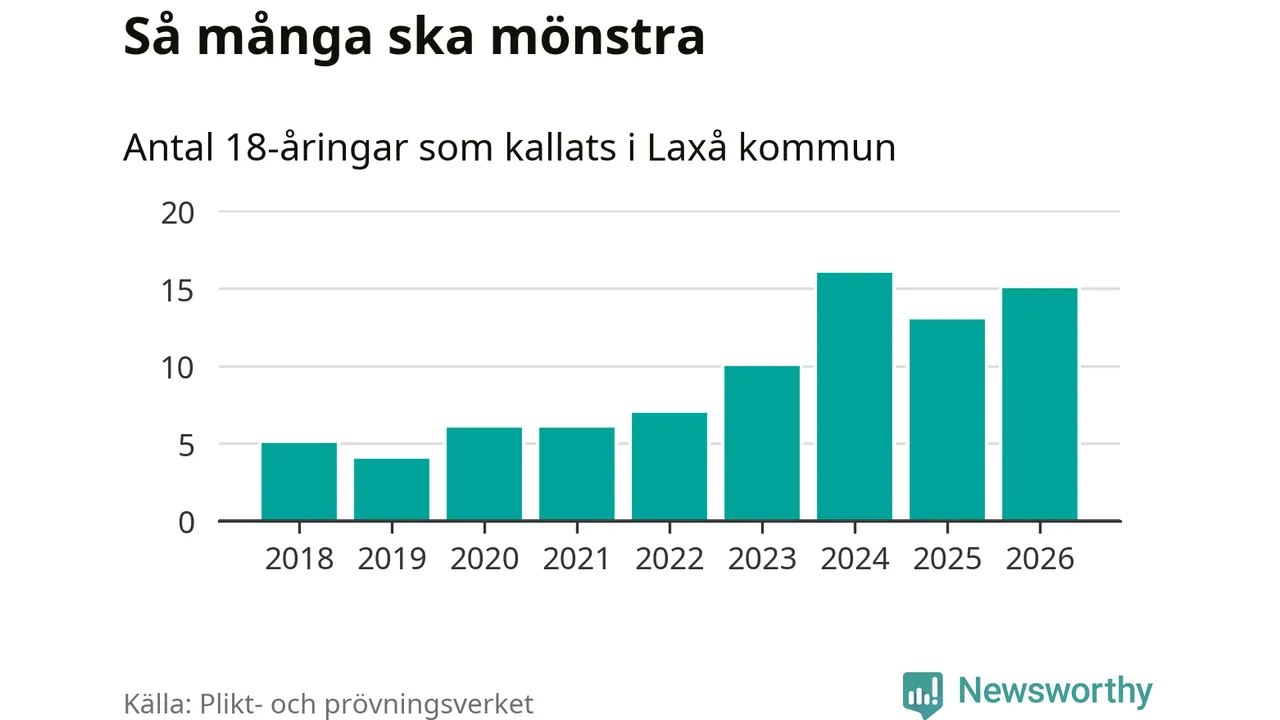 15 personer är två fler än 2025, men satt i relation till åldersgruppens storlek är det faktiskt en mindre andel som kallas i år. Som mest har 16 personer från en årskull kommunen mönstrat (2024). Totalt från Örebro län kallas 850 personer i år.