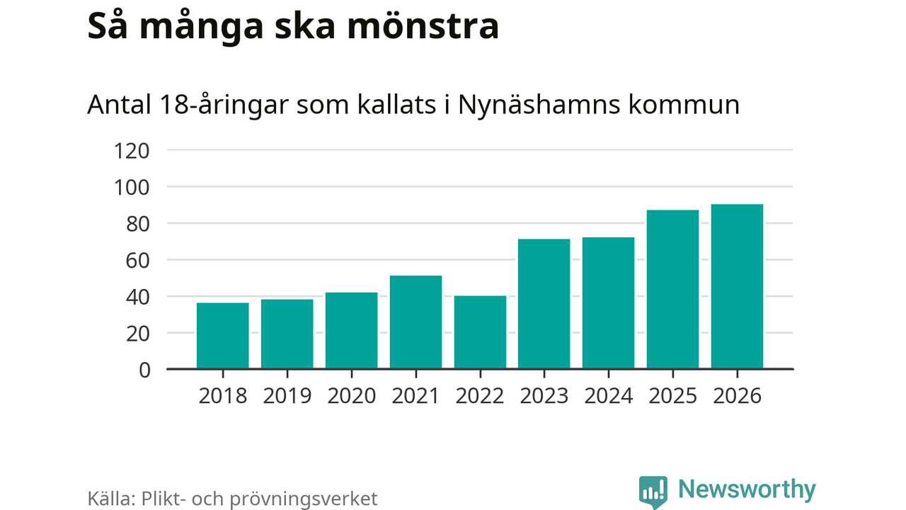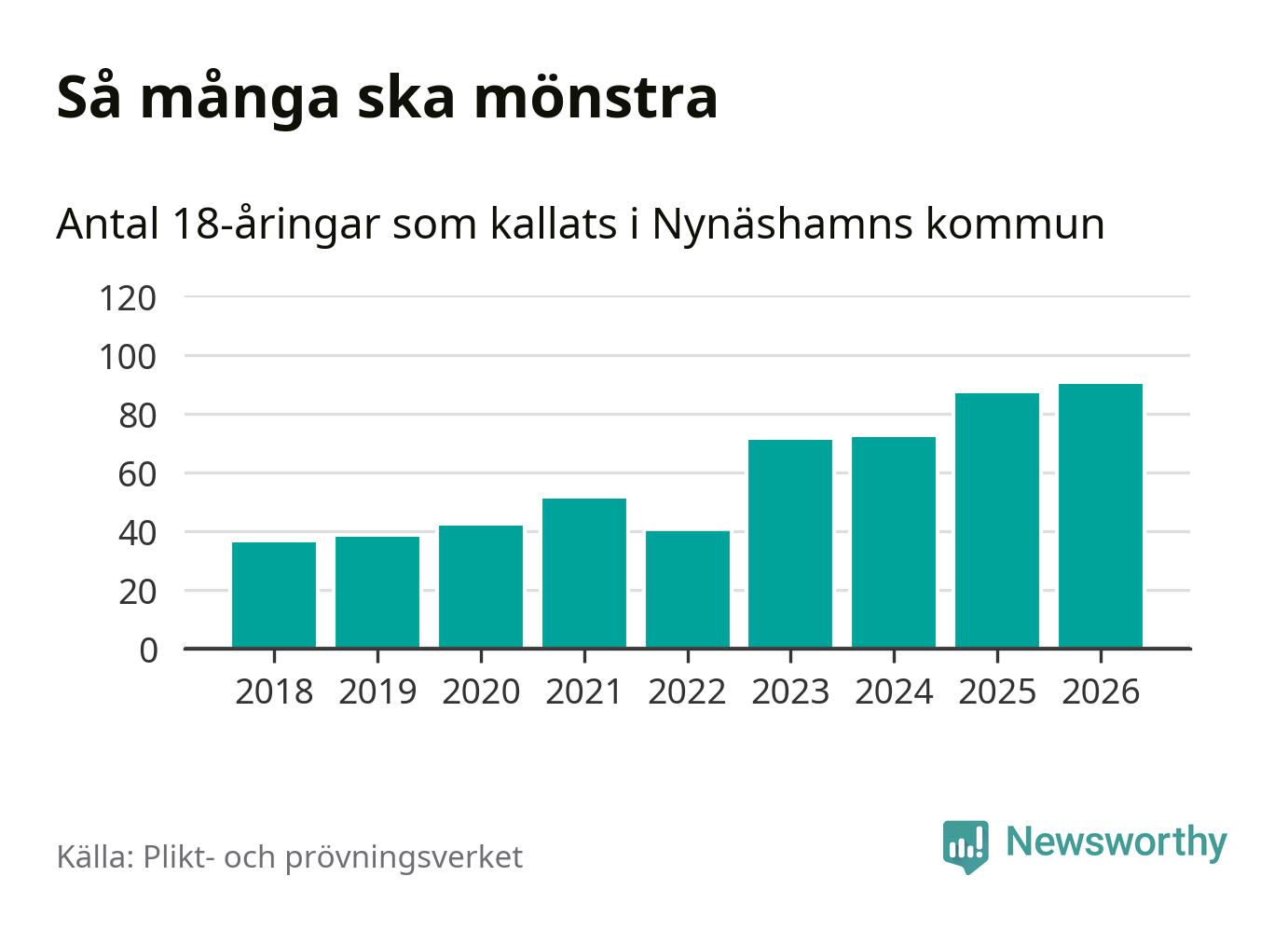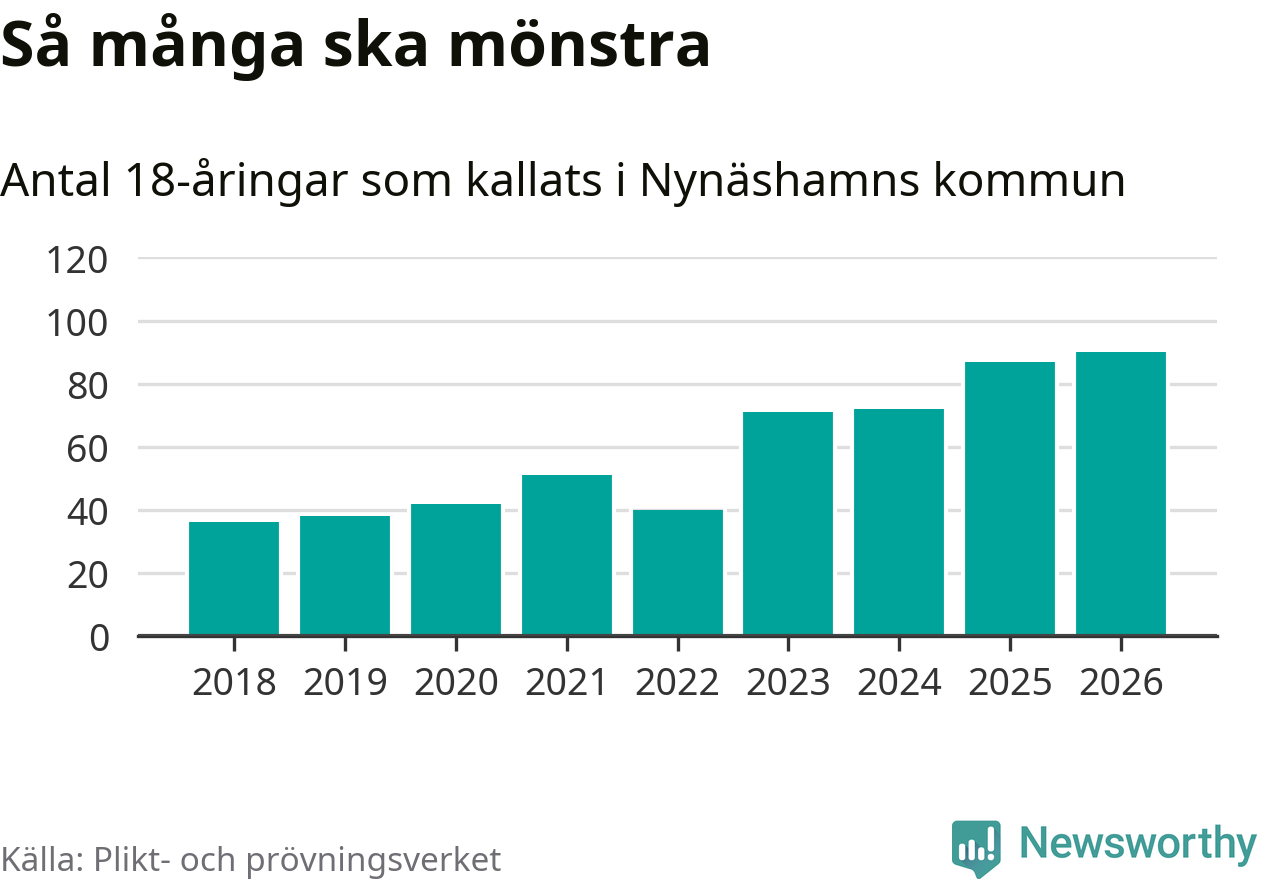 90 personer är det högsta antalet kallade i Nynäshamn sedan 2018, som är första året med statistik på kommunnivå (värnplikten återinfördes 2017), och tre mönstrande fler än 2025. Totalt från Stockholms län kallas 7 137 personer i år.