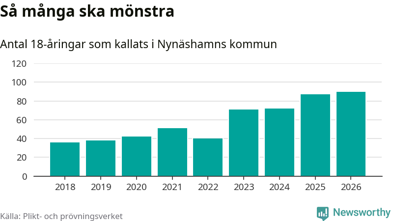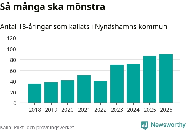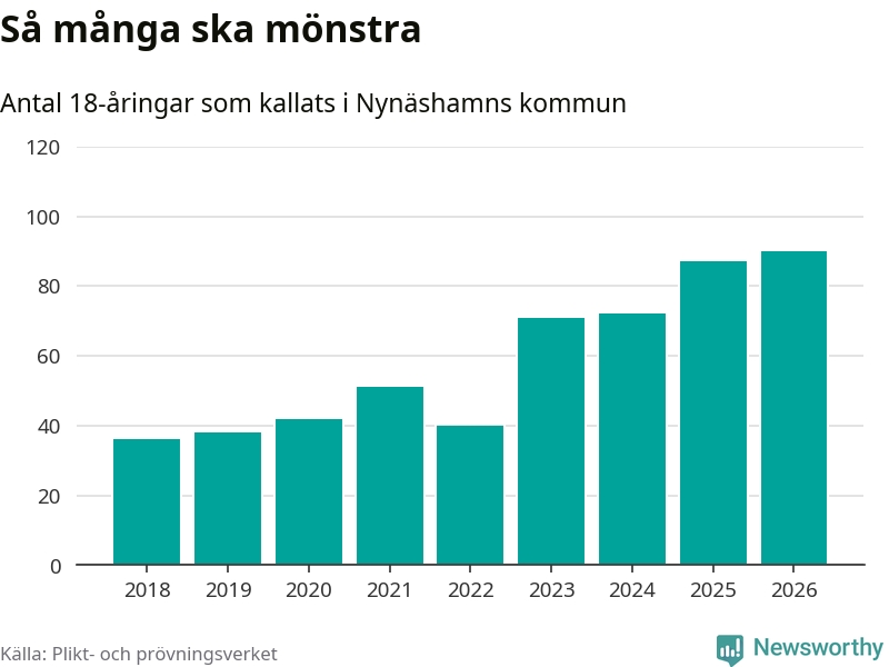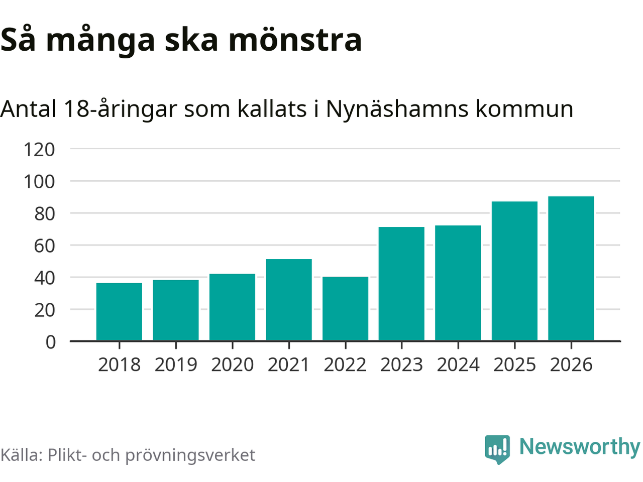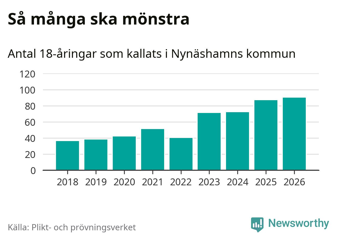 90 personer är det högsta antalet kallade i Nynäshamn sedan 2018, som är första året med statistik på kommunnivå (värnplikten återinfördes 2017), och tre mönstrande fler än 2025. Totalt från Stockholms län kallas 7 137 personer i år.