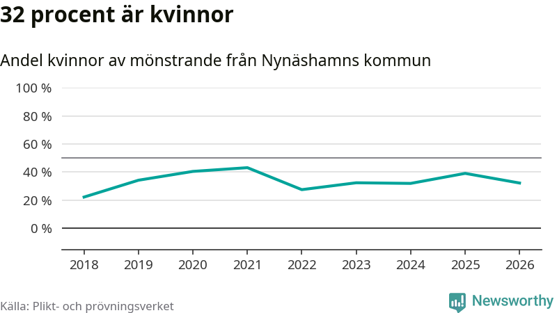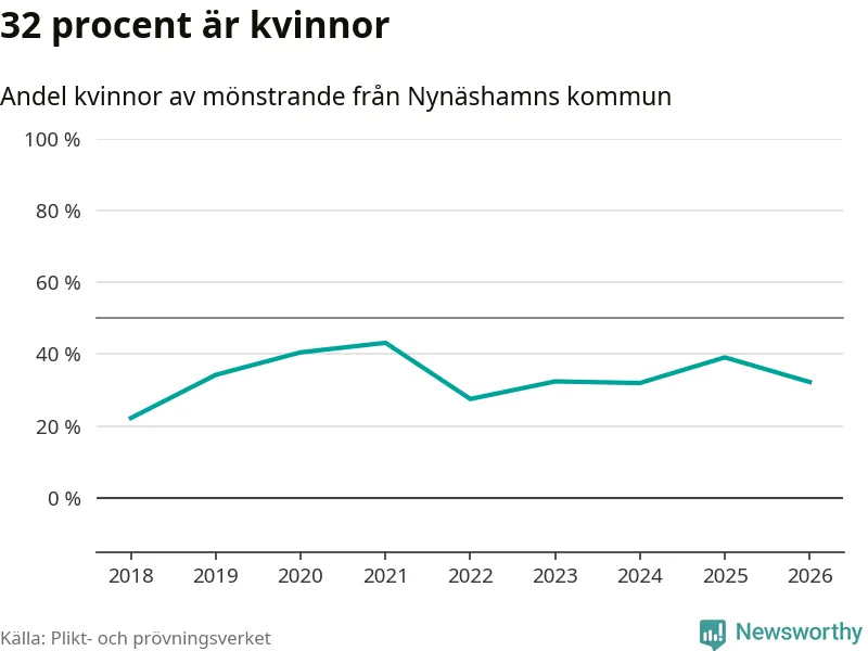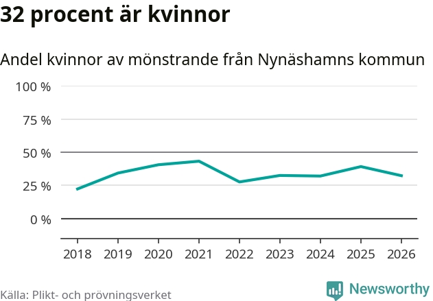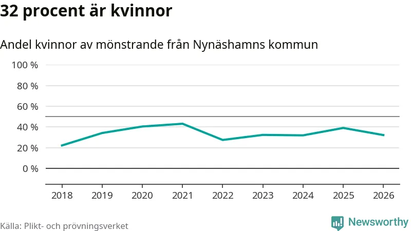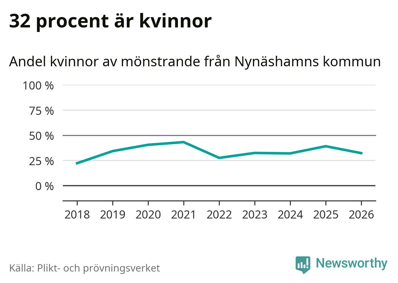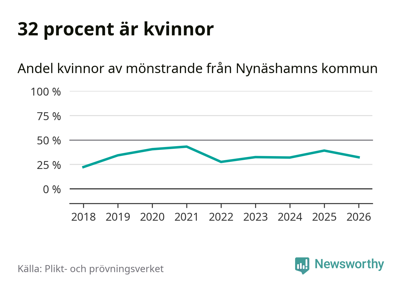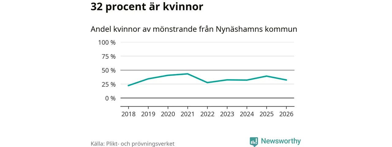 29 av de som kallats till mönstring från Nynäshamn är kvinnor, vilket motsvarar 32 procent av de mönstrande. Som mest har 34 kvinnor kallats från kommunen (2025). I riket som helhet är 28 procent av de mönstrande tjejer.