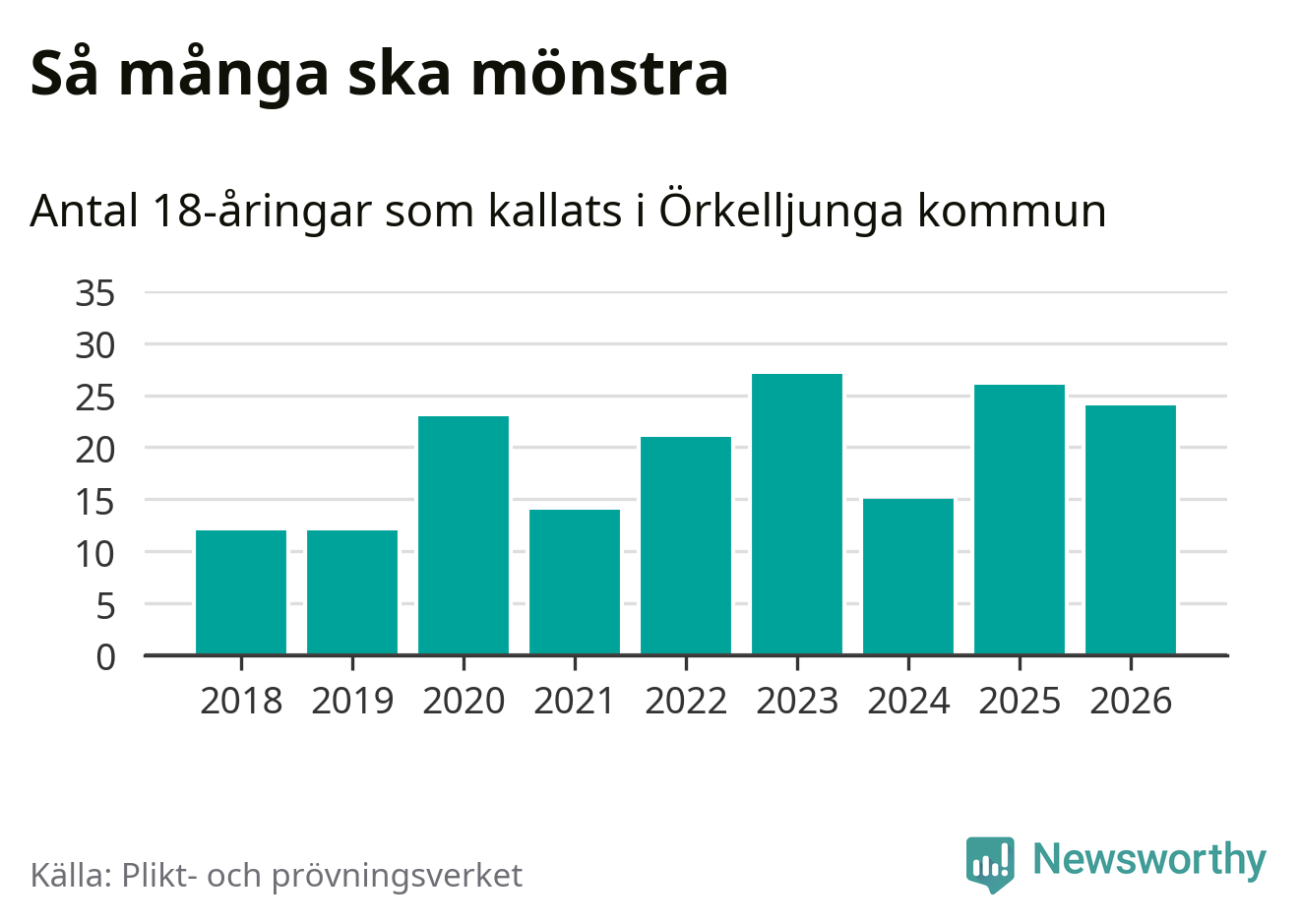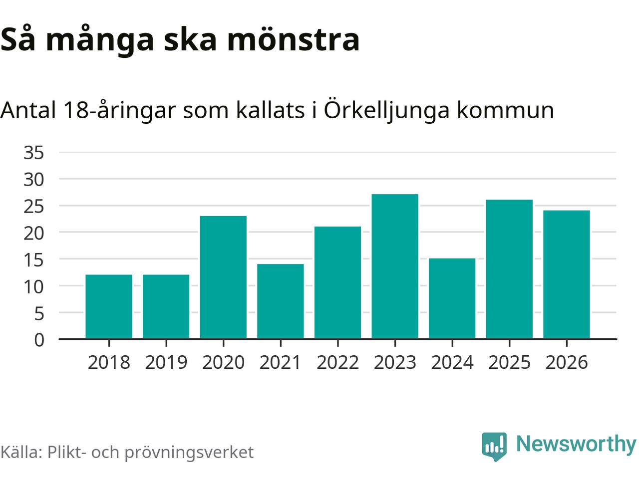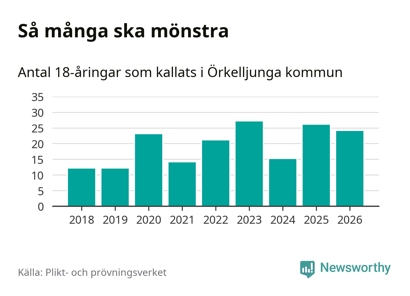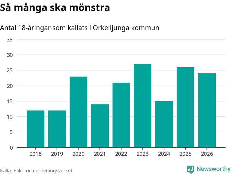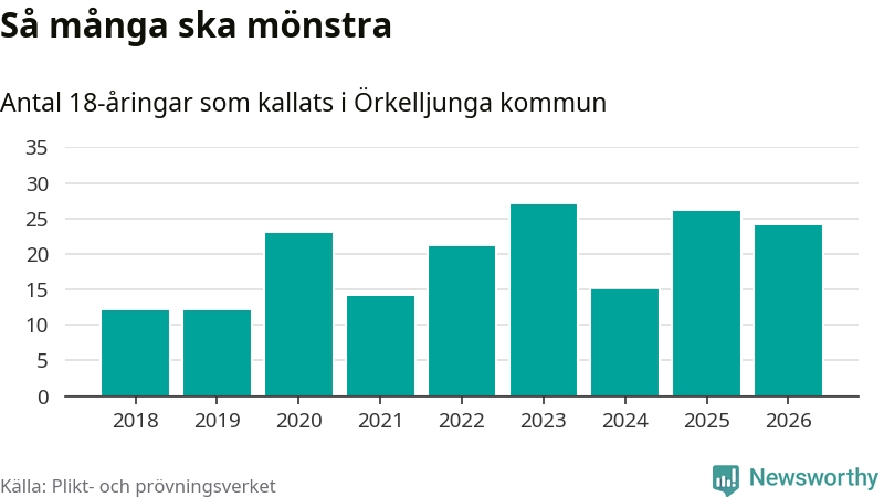 24 personer är två färre än 2025. Som mest har 27 personer från en årskull kommunen mönstrat (2023). Totalt från Skåne län kallas 3 778 personer i år.