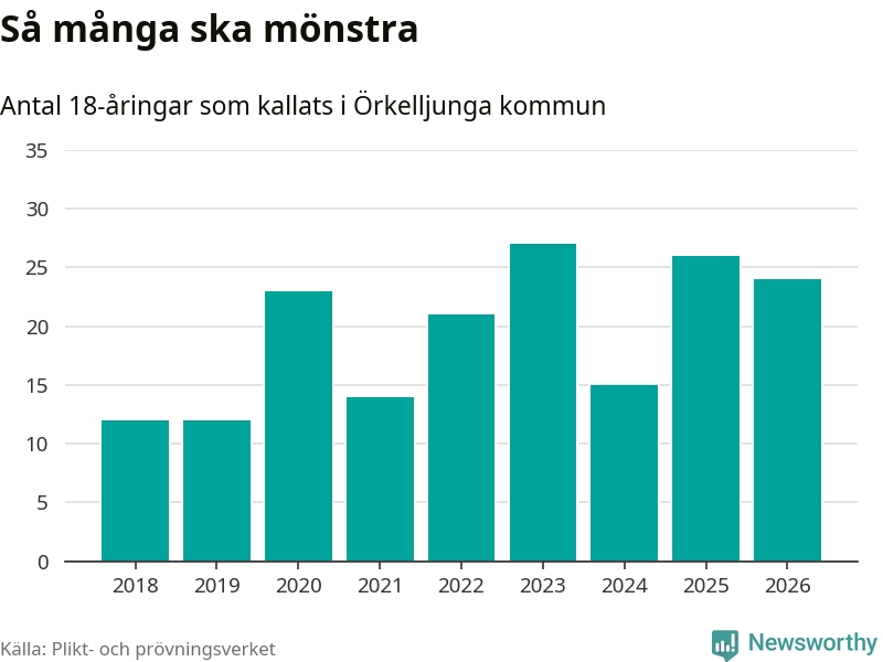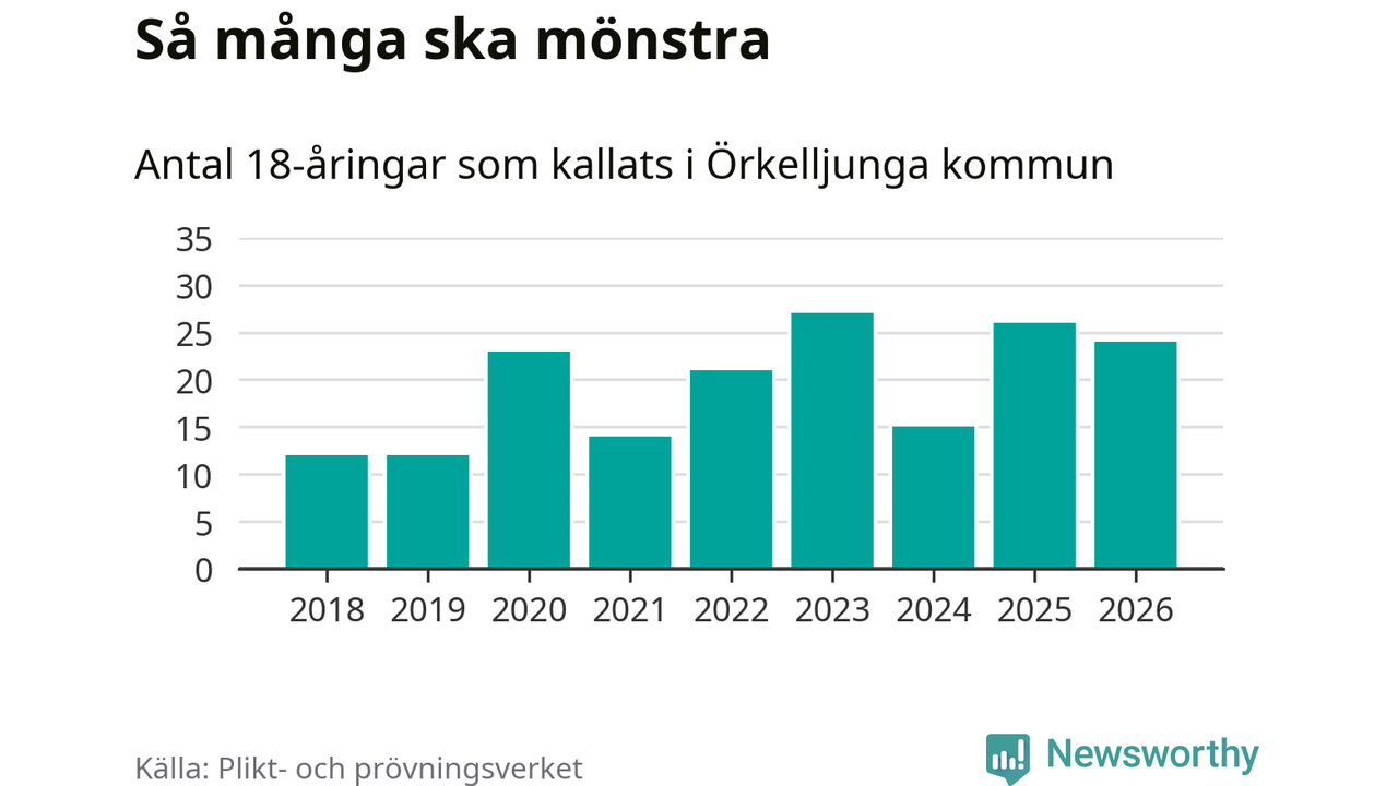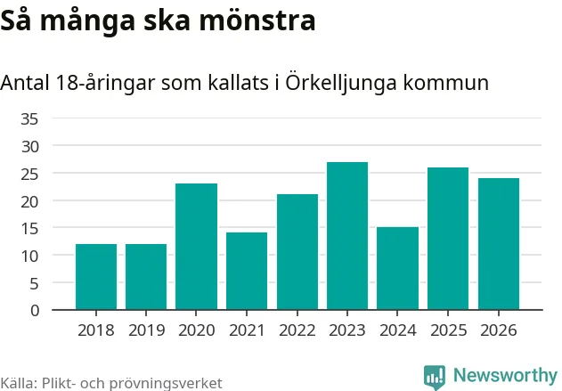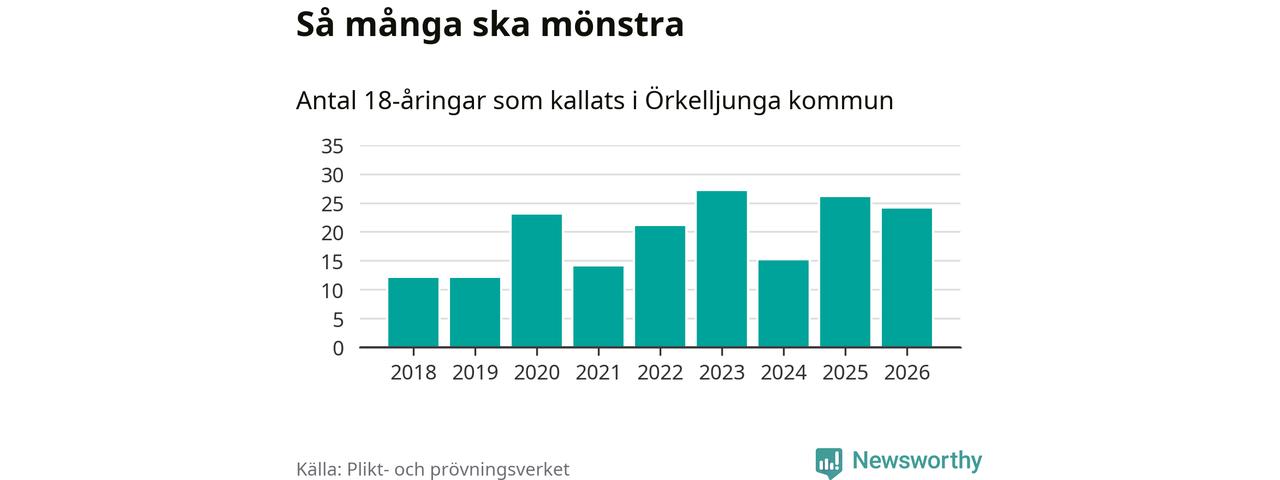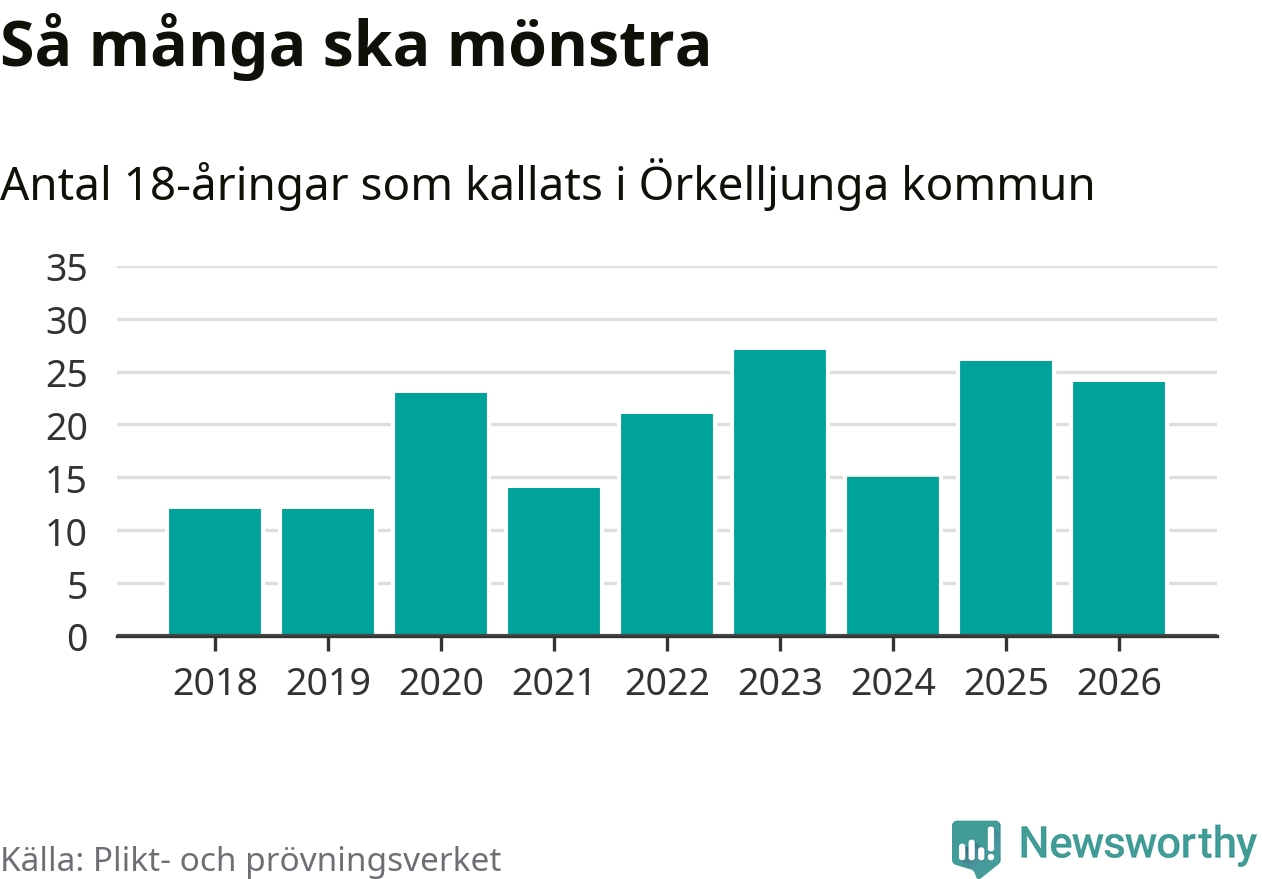 Nu kallas omkring 30 000 svenskar födda 2008 till mönstring. Och 24 av dem kommer från Örkelljunga, enligt ny statistik från Plikt- och prövningsverket. Det innebär att var femte invånare i åldersgruppen i kommunen kallas till mönstring. Det är en lägre andel än i Skåne totalt. I riket som helhet kallas nästan var fjärde person i årskullen.