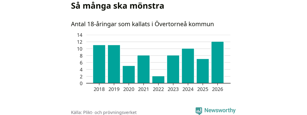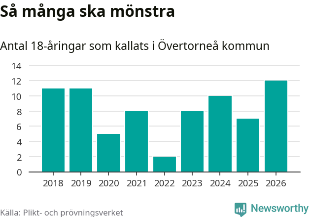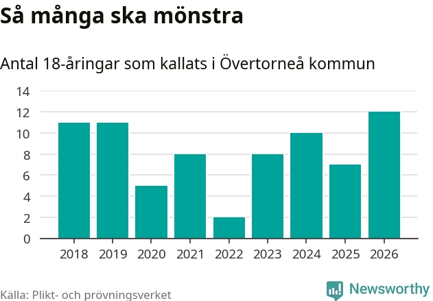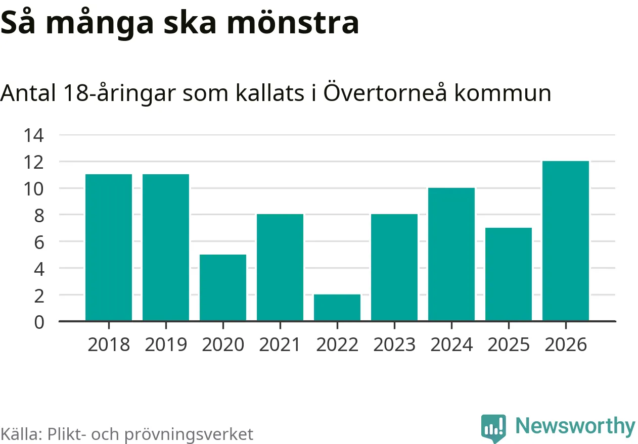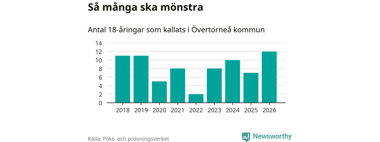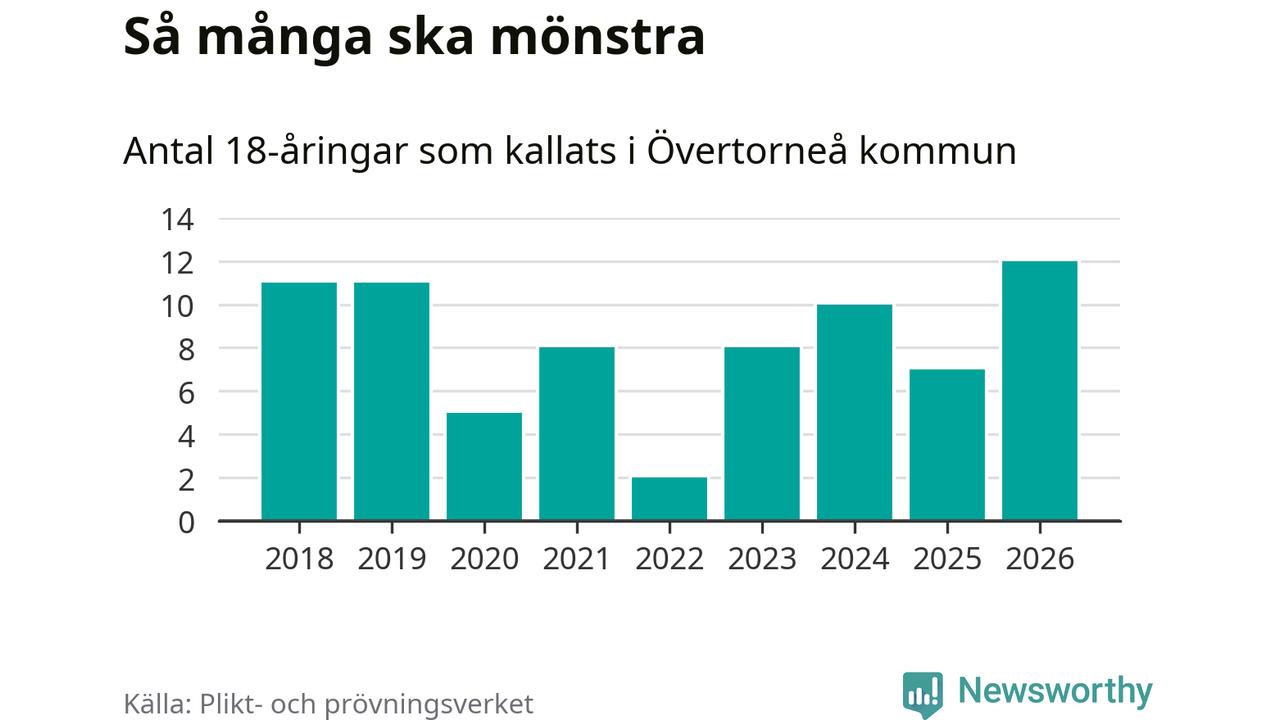 Tolv personer är det högsta antalet kallade i Övertorneå sedan 2018, som är första året med statistik på kommunnivå (värnplikten återinfördes 2017), och fem mönstrande fler än 2025. Totalt från Norrbottens län kallas 736 personer i år.