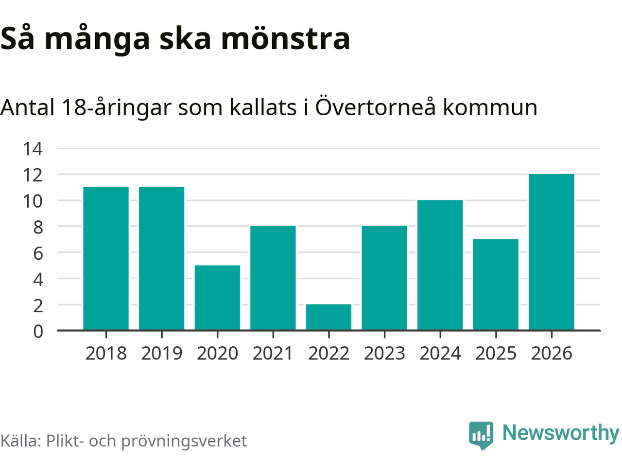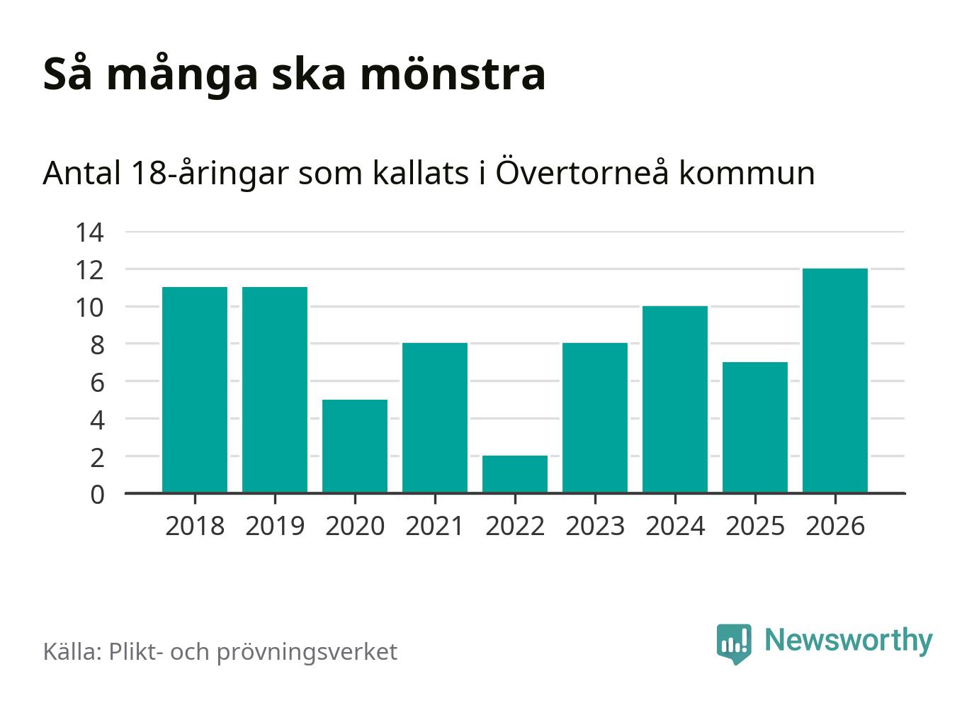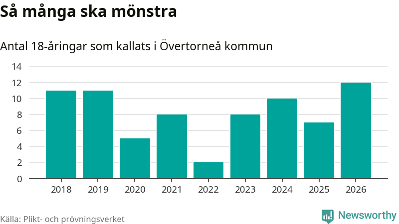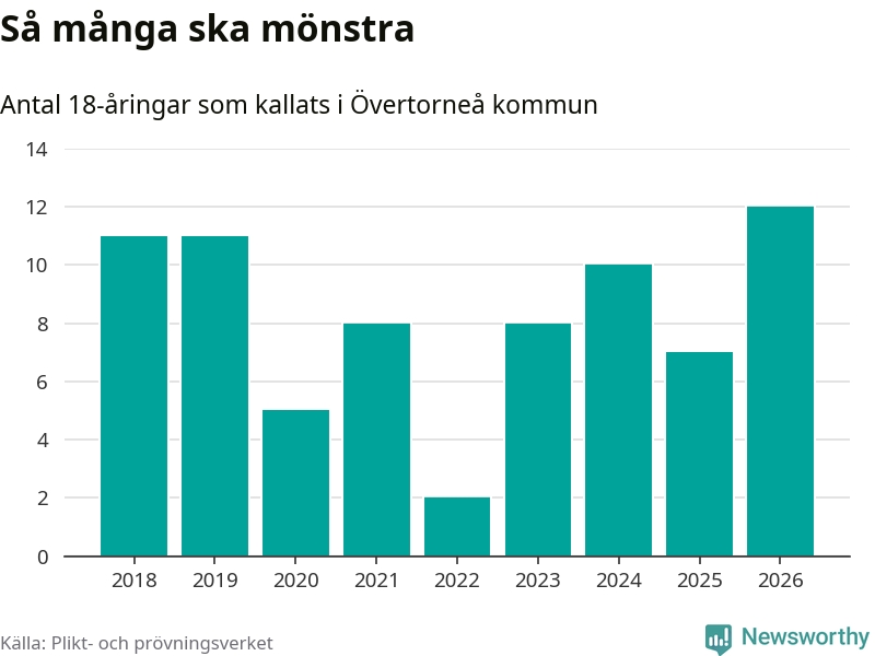 Tolv personer är det högsta antalet kallade i Övertorneå sedan 2018, som är första året med statistik på kommunnivå (värnplikten återinfördes 2017), och fem mönstrande fler än 2025. Totalt från Norrbottens län kallas 736 personer i år.