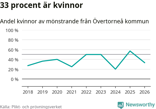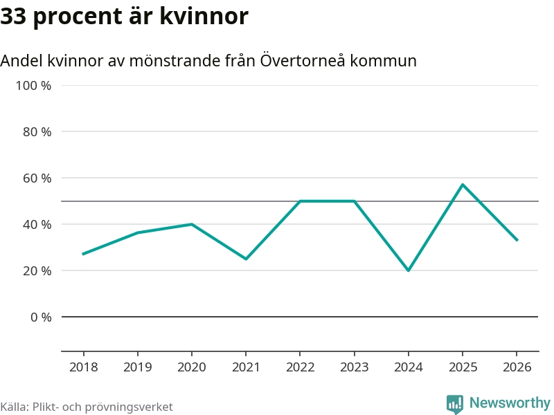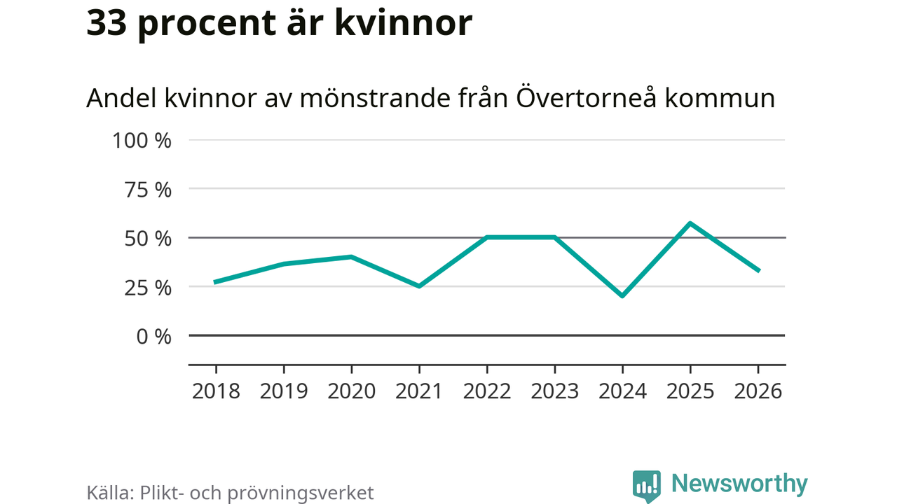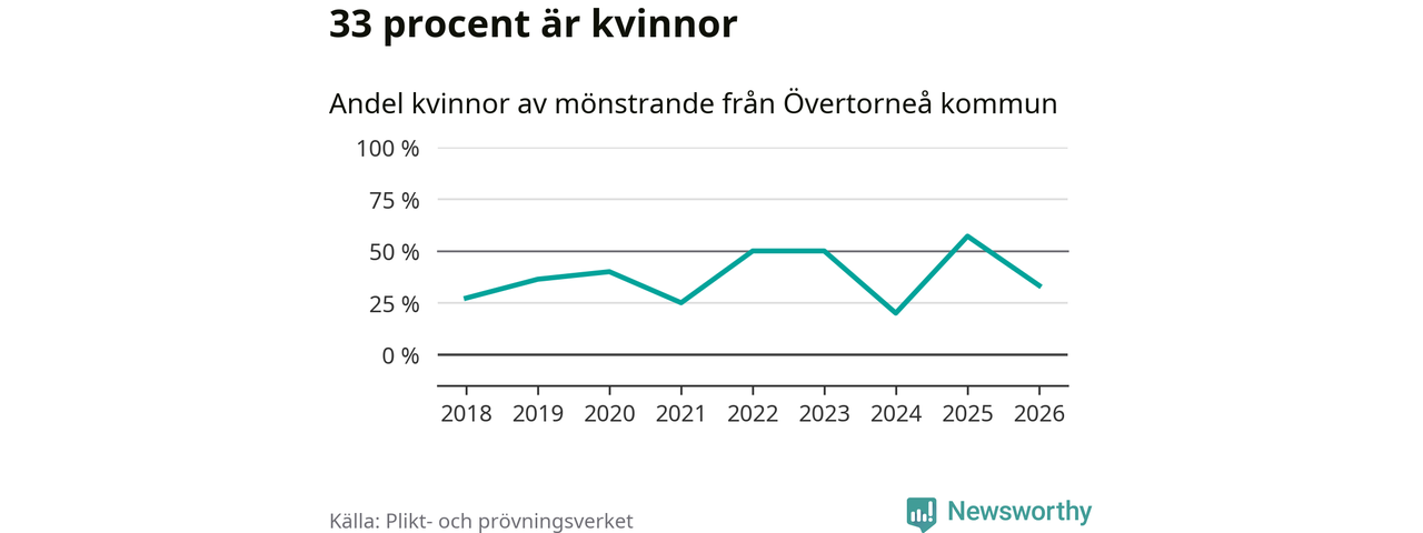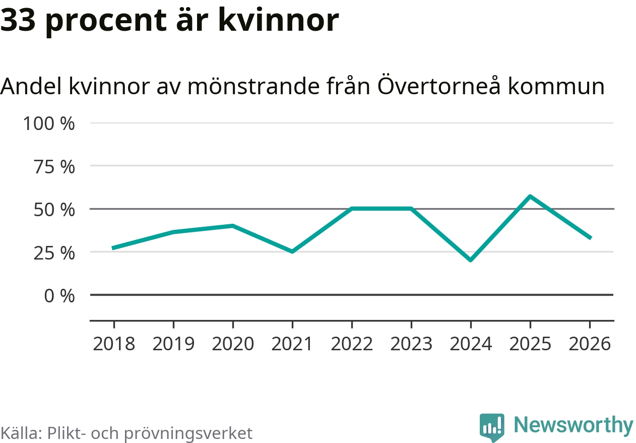 Fyra av de som kallats till mönstring från Övertorneå är kvinnor, vilket motsvarar 33 procent av de mönstrande. I absoluta tal är det fler kvinnor än något år sedan värnplikten återinfördes, men 2025 var en större andel av de mönstrande från kommunen kvinnor (57 procent). I riket som helhet är 28 procent av de mönstrande tjejer.