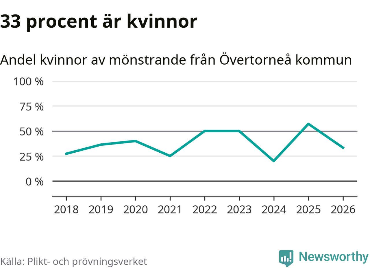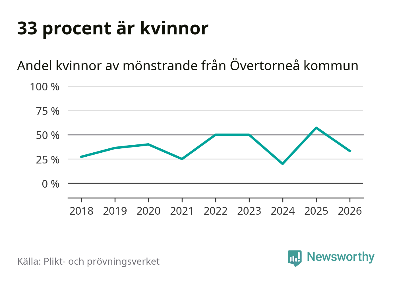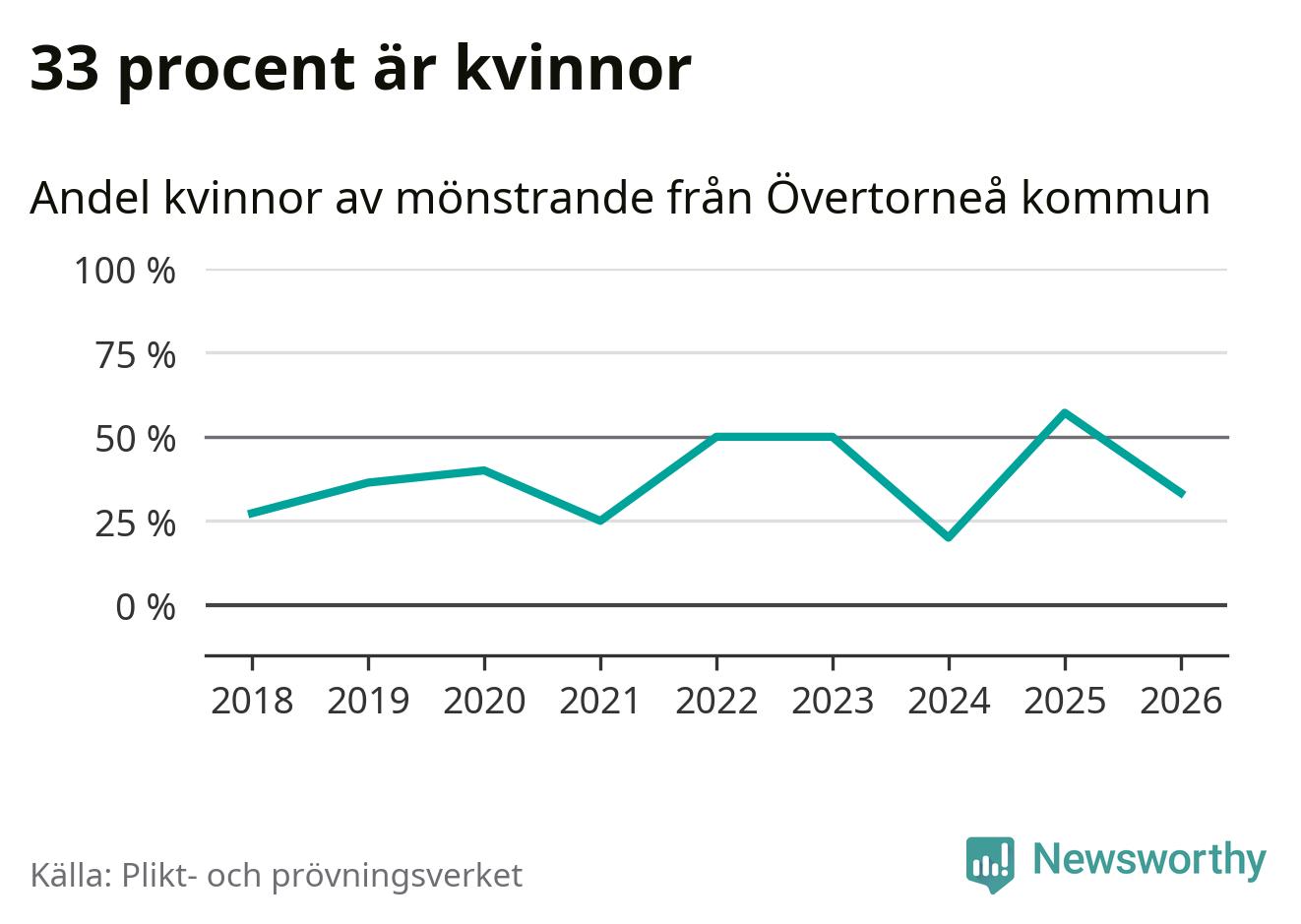 Fyra av de som kallats till mönstring från Övertorneå är kvinnor, vilket motsvarar 33 procent av de mönstrande. I absoluta tal är det fler kvinnor än något år sedan värnplikten återinfördes, men 2025 var en större andel av de mönstrande från kommunen kvinnor (57 procent). I riket som helhet är 28 procent av de mönstrande tjejer.
